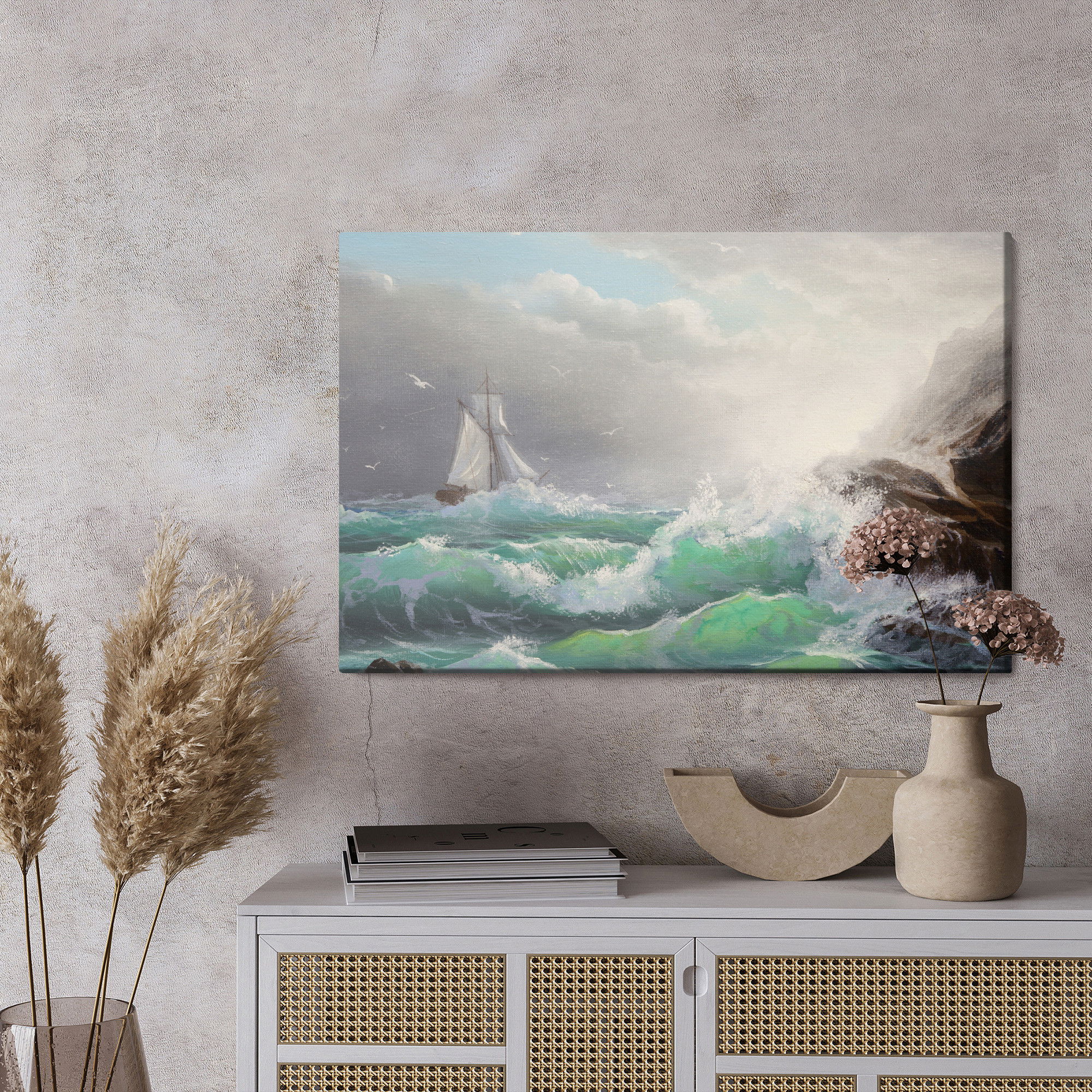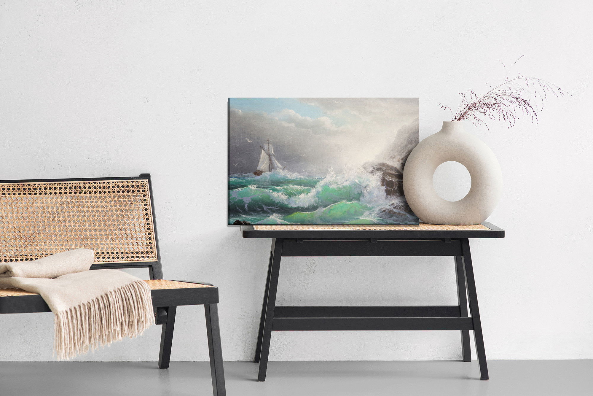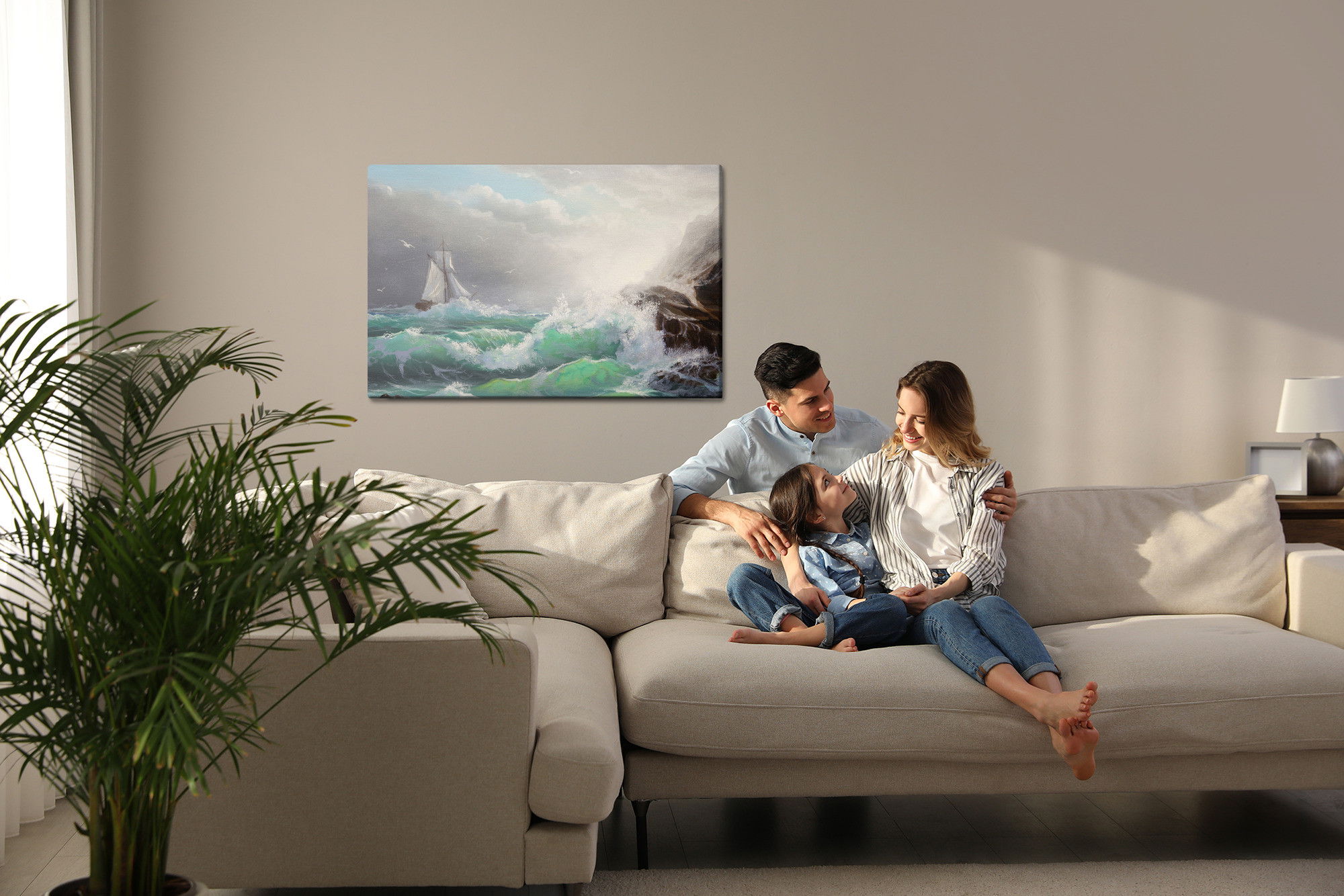 Varje tavla monteras på en massiv fururam. Format upp till 70×50 cm har en ram på 15 mm, medan format från 90×60 cm och uppåt har en ram på 20 mm. Den exakta dukspänningen gör att tavlan håller sin form över tid. Motivet Sailboat with sea and waves trycks runt hela ramen vilket ger ett stilrent galleriuttryck där tavlan är lika vacker från sidan som framifrån. Kombinationen av rak dukspänning, rena linjer och korrekt tryck ger en professionell finish.