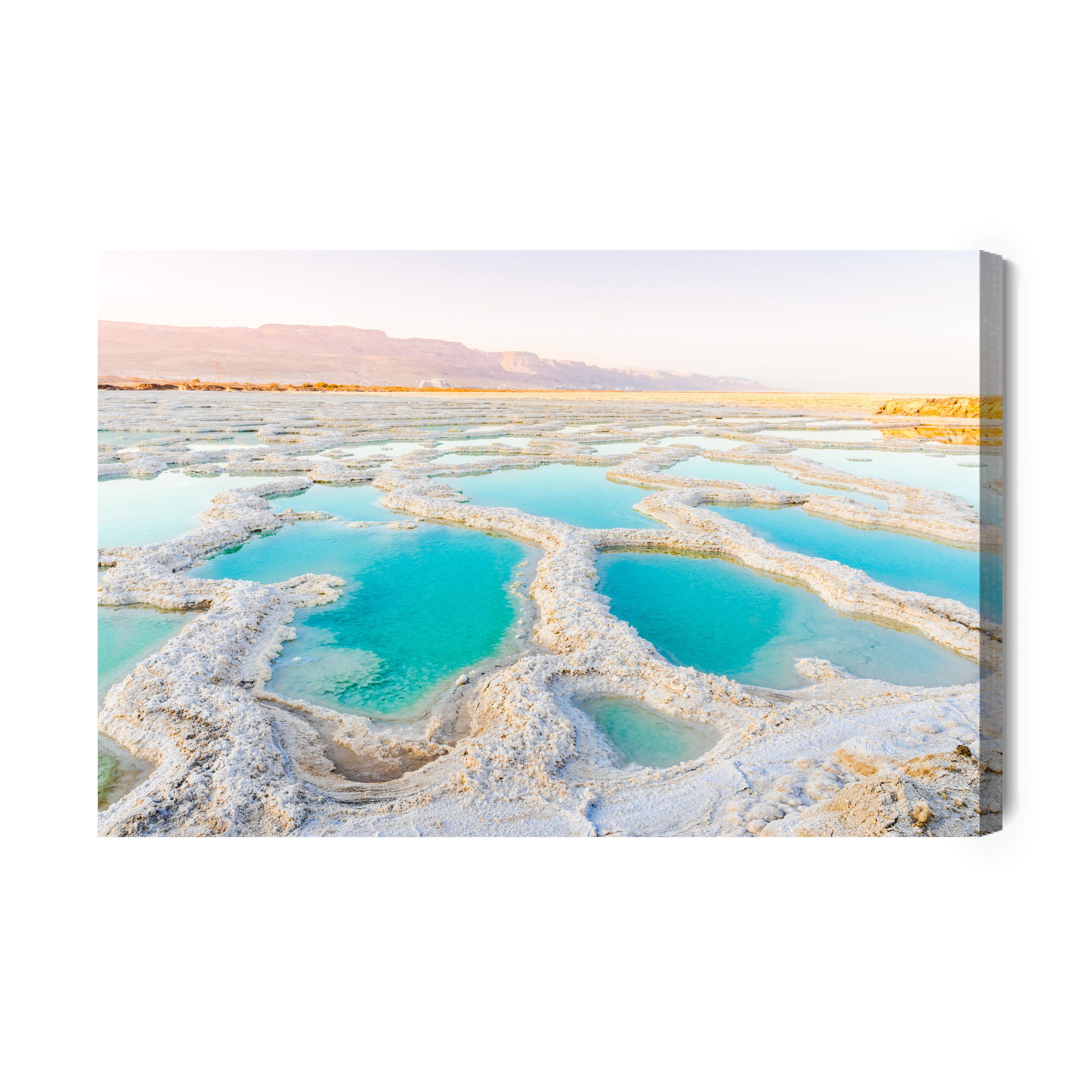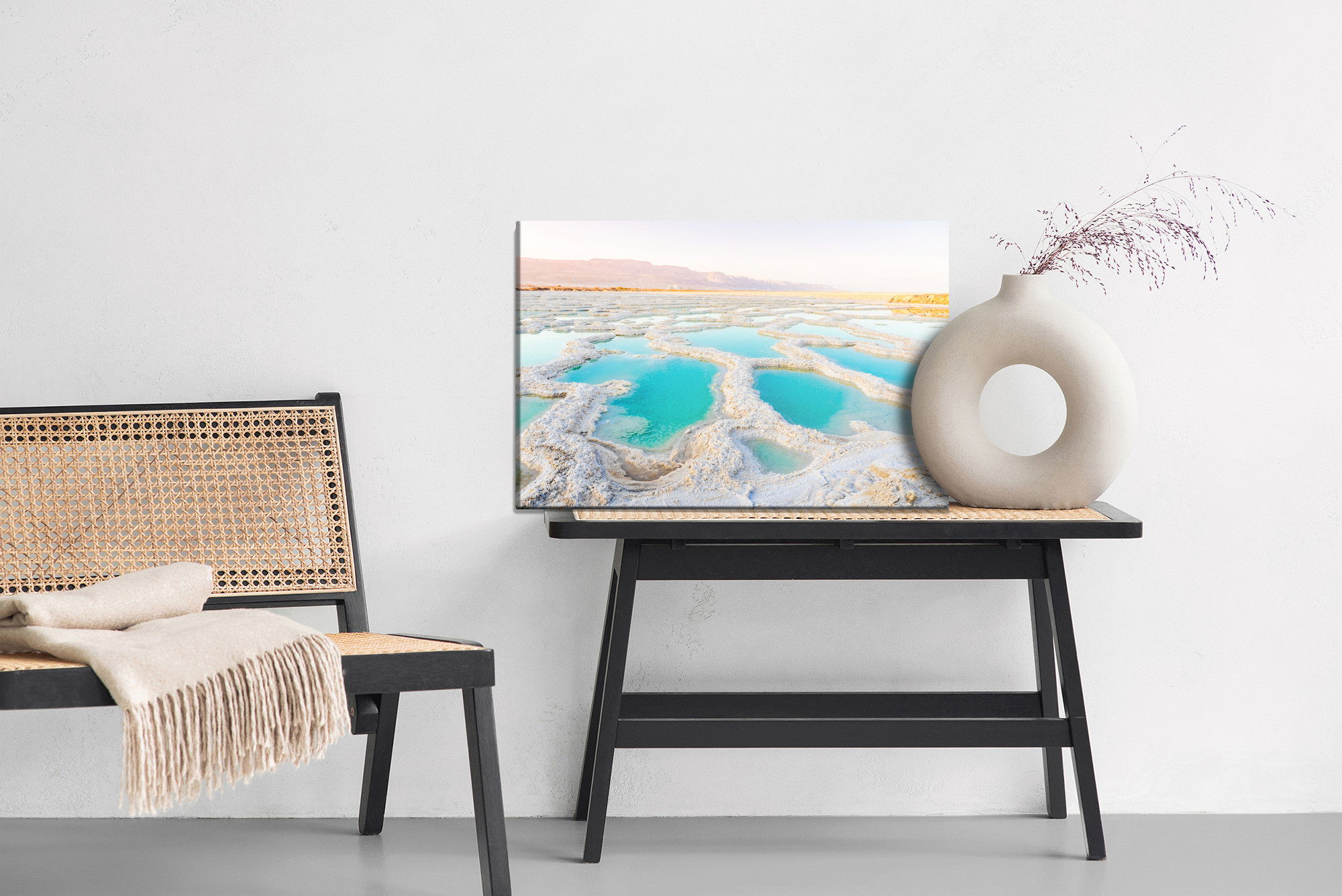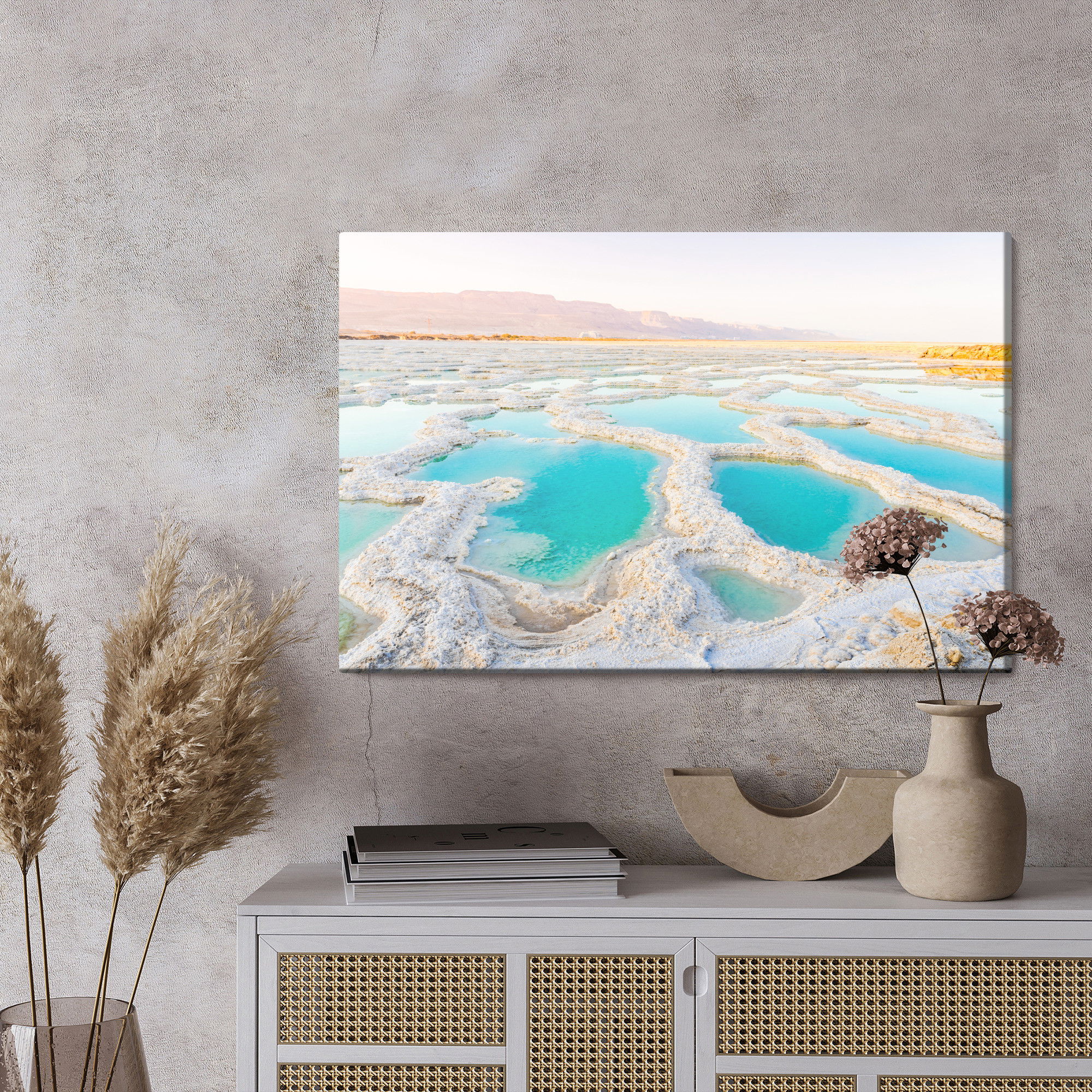 Varje tavla monteras på en massiv fururam. Format upp till 70×50 cm har en ram på 15 mm, medan format från 90×60 cm och uppåt har en ram på 20 mm. Den exakta dukspänningen gör att tavlan håller sin form över tid. Motivet Salty shore of the sea trycks runt hela ramen vilket ger ett stilrent galleriuttryck där tavlan är lika vacker från sidan som framifrån. Kombinationen av rak dukspänning, rena linjer och korrekt tryck ger en professionell finish.
