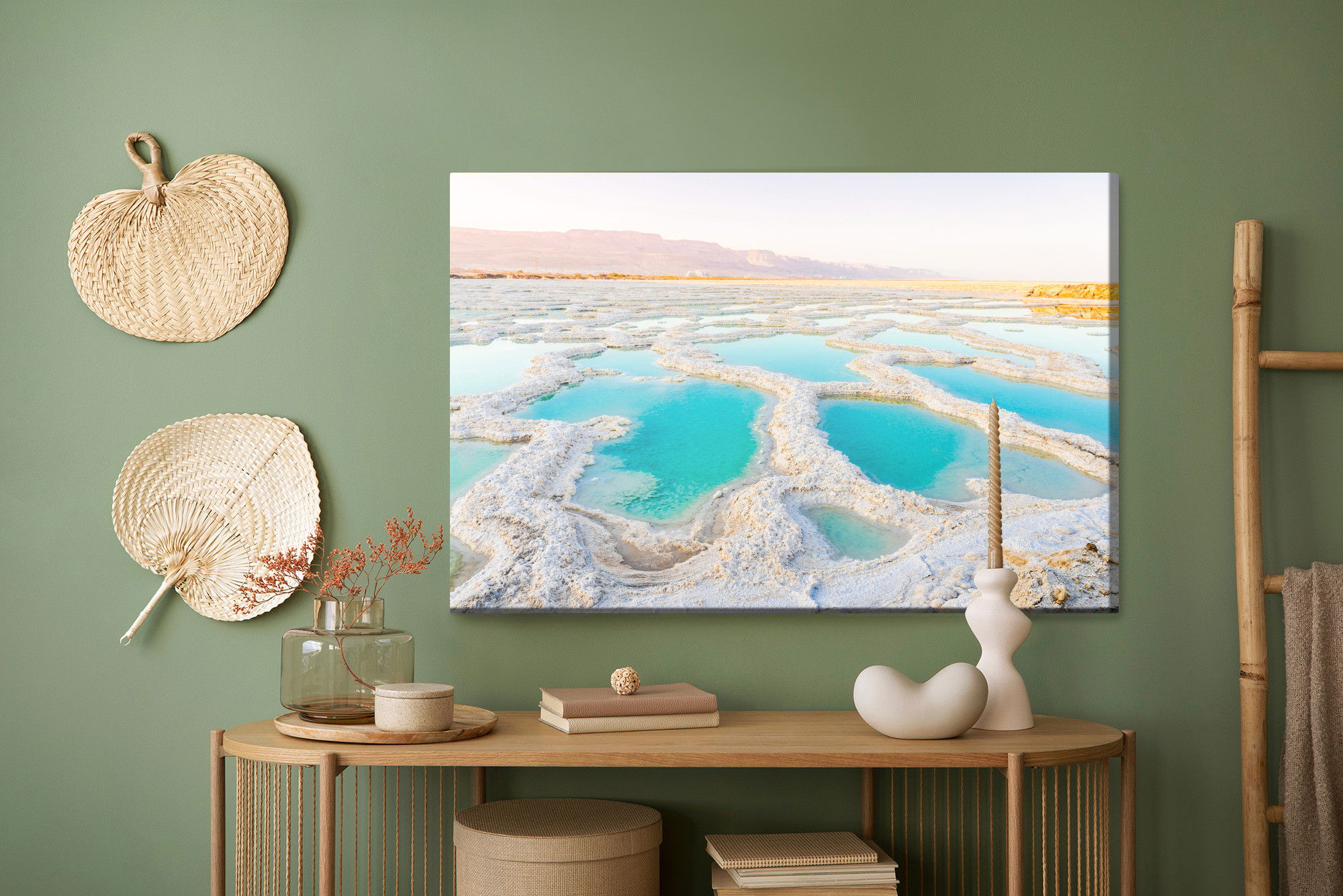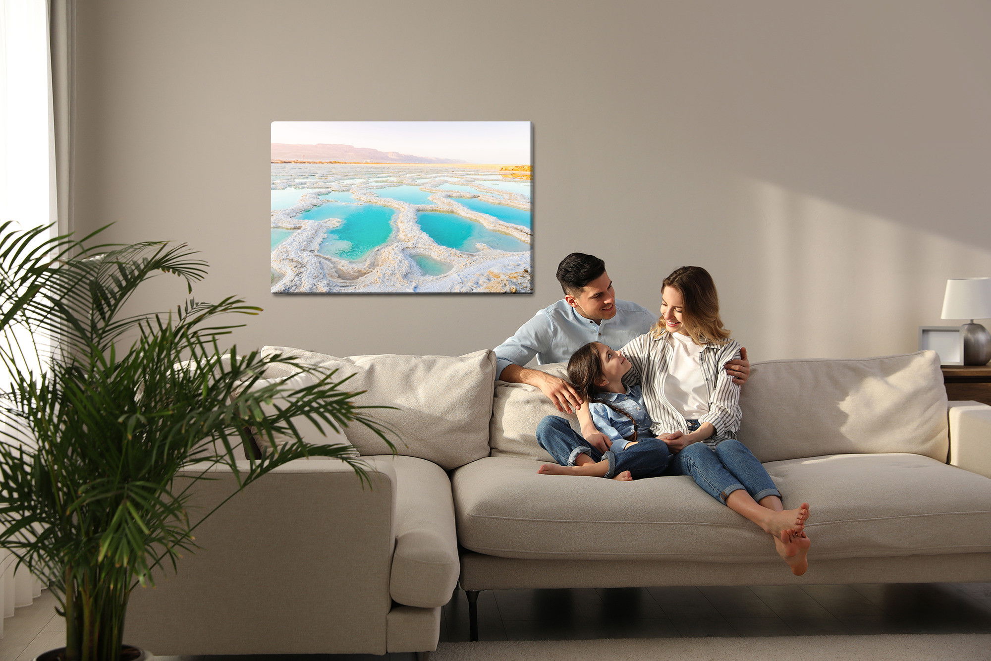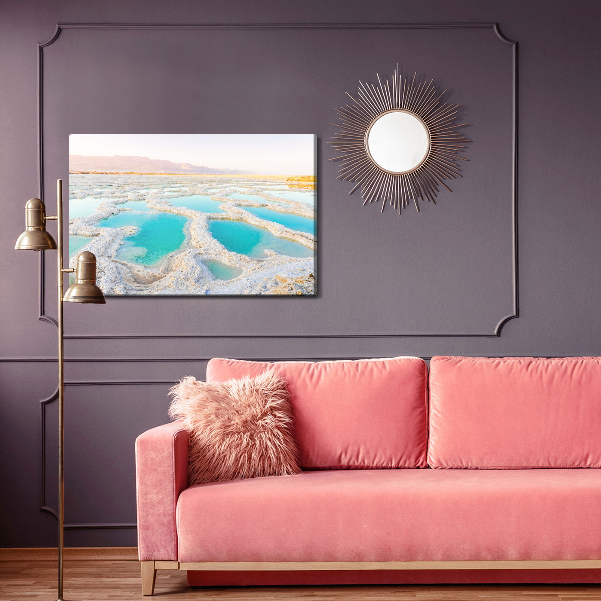 Varje tavla monteras på en massiv fururam. Format upp till 70×50 cm har en ram på 15 mm, medan format från 90×60 cm och uppåt har en ram på 20 mm. Den exakta dukspänningen gör att tavlan håller sin form över tid. Motivet Salty shore of the sea trycks runt hela ramen vilket ger ett stilrent galleriuttryck där tavlan är lika vacker från sidan som framifrån. Kombinationen av rak dukspänning, rena linjer och korrekt tryck ger en professionell finish.