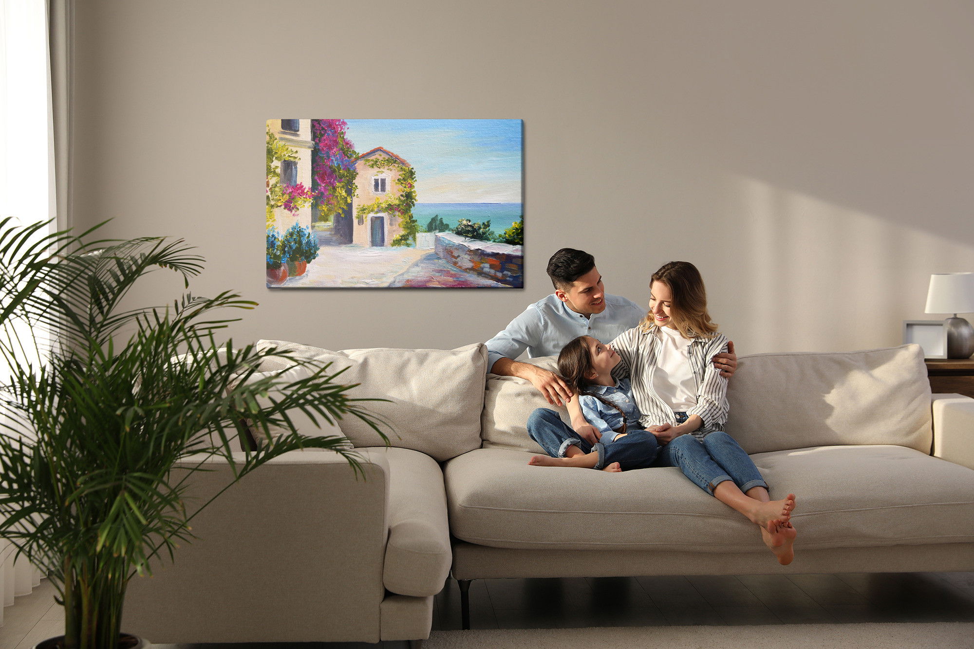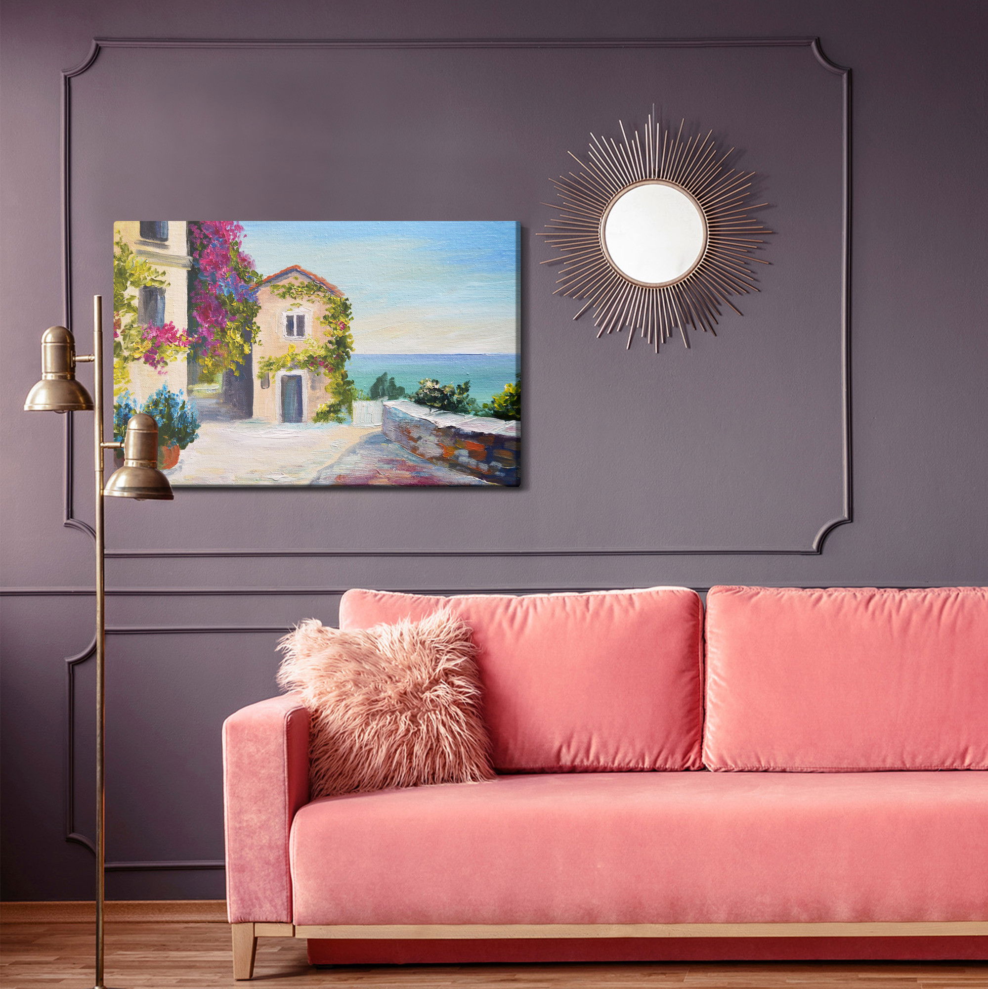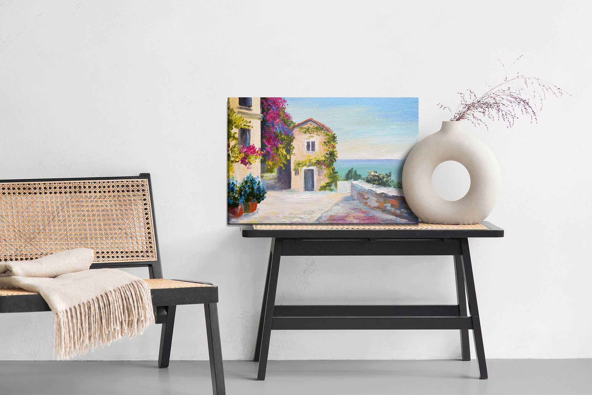 Varje tavla monteras på en massiv fururam. Format upp till 70×50 cm har en ram på 15 mm, medan format från 90×60 cm och uppåt har en ram på 20 mm. Den exakta dukspänningen gör att tavlan håller sin form över tid. Motivet Sea and house in santorini trycks runt hela ramen vilket ger ett stilrent galleriuttryck där tavlan är lika vacker från sidan som framifrån. Kombinationen av rak dukspänning, rena linjer och korrekt tryck ger en professionell finish.