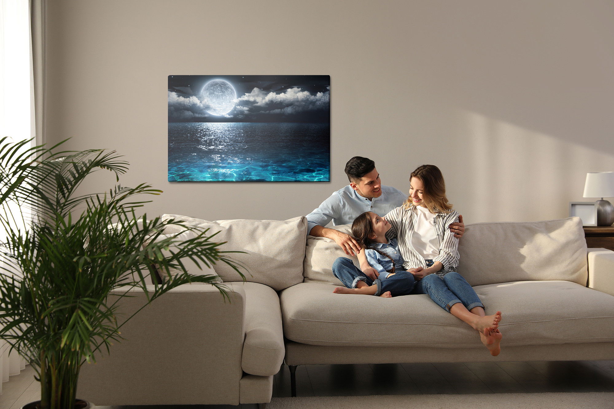 Motivet Sea at night with the moon återges med hög färgprecision och detaljrikedom tack vare HP Latex-teknologi. Trycket sker med vattenbaserade, luktfria och GREENGUARD Gold-certifierade bläck som ger en upplösning på upp till 300 DPI. Färgerna är UV-beständiga och behåller sin styrka även i ljusa rum, vilket gör tavlan lämplig för både hem- och offentliga miljöer.