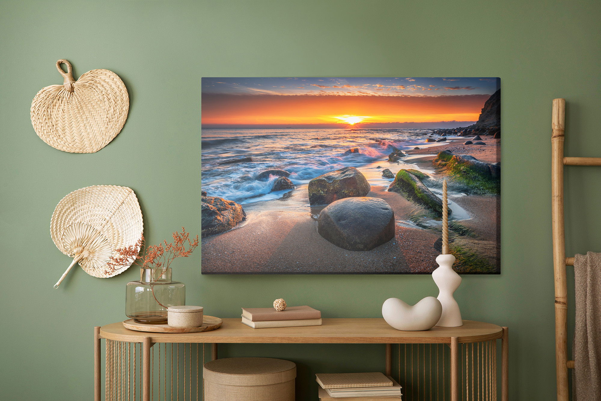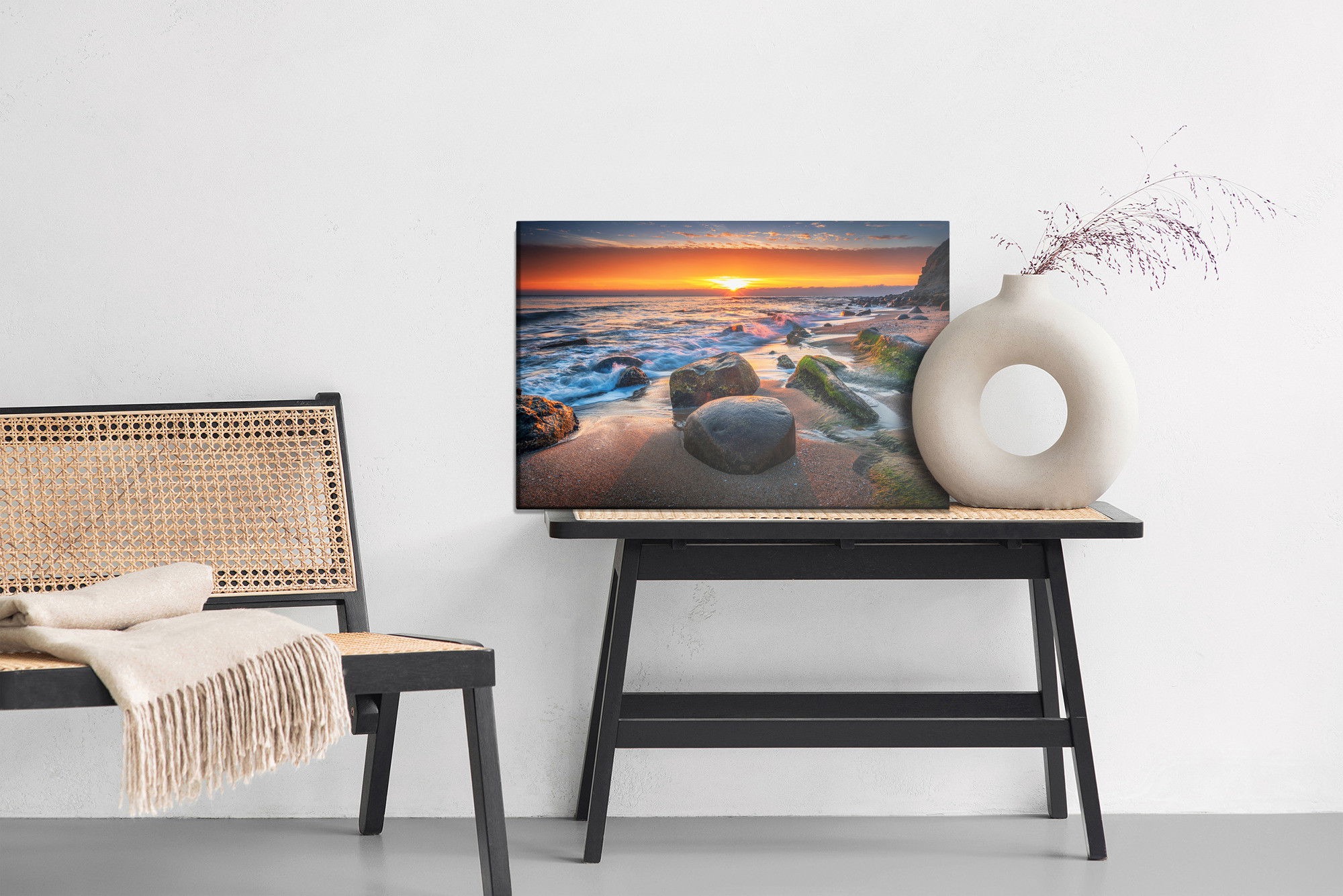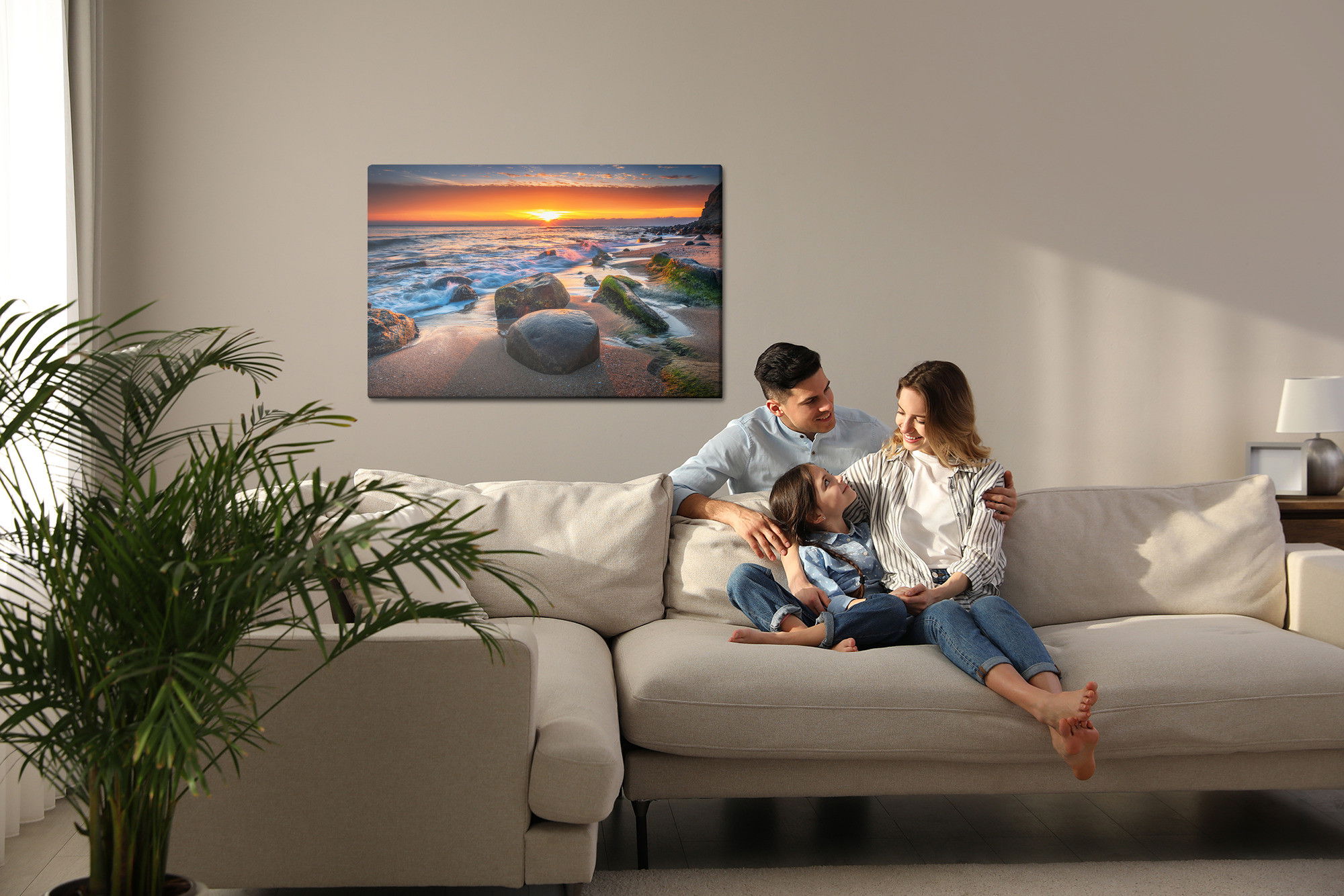 Varje tavla monteras på en massiv fururam. Format upp till 70×50 cm har en ram på 15 mm, medan format från 90×60 cm och uppåt har en ram på 20 mm. Den exakta dukspänningen gör att tavlan håller sin form över tid. Motivet Sea at the sunset trycks runt hela ramen vilket ger ett stilrent galleriuttryck där tavlan är lika vacker från sidan som framifrån. Kombinationen av rak dukspänning, rena linjer och korrekt tryck ger en professionell finish.