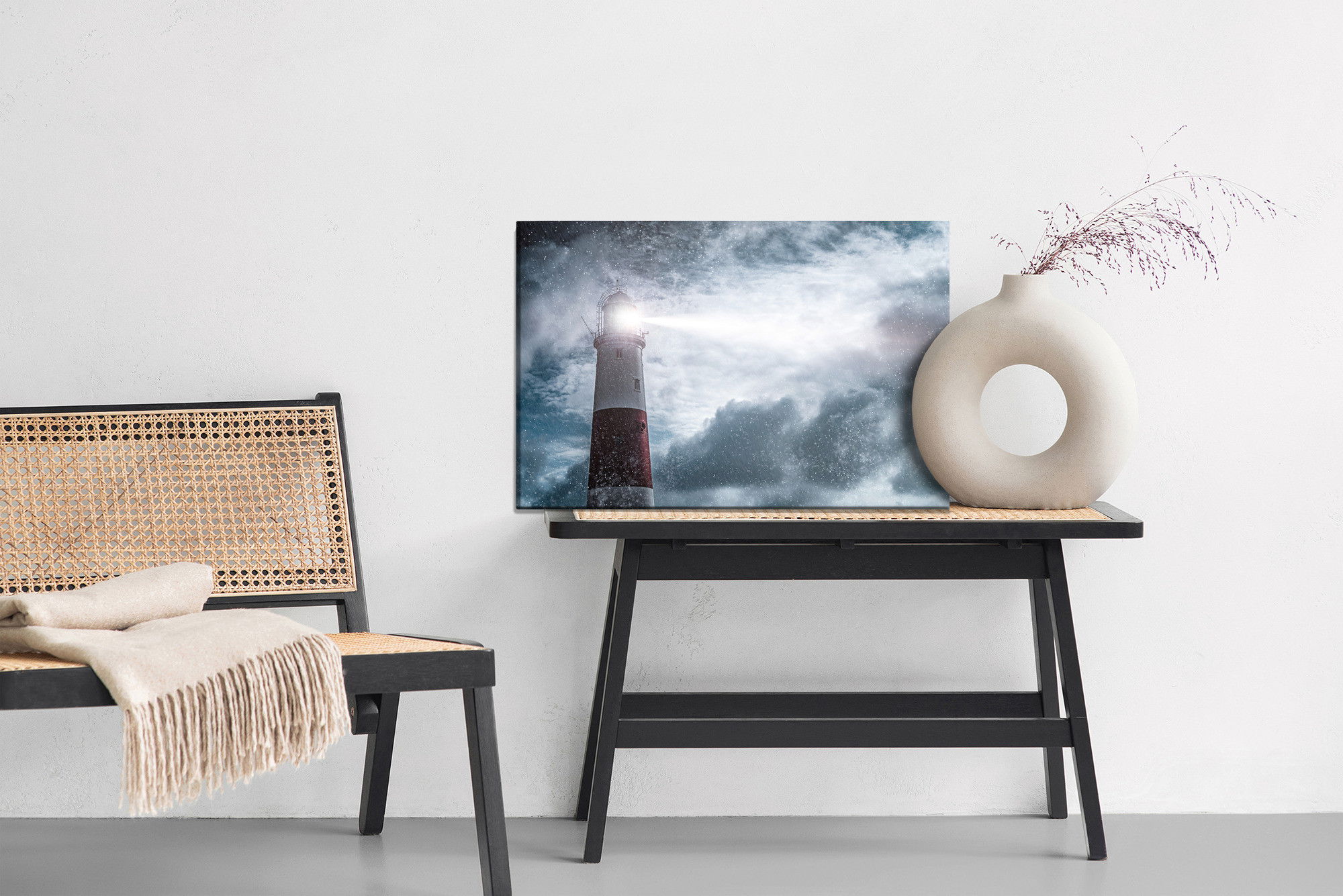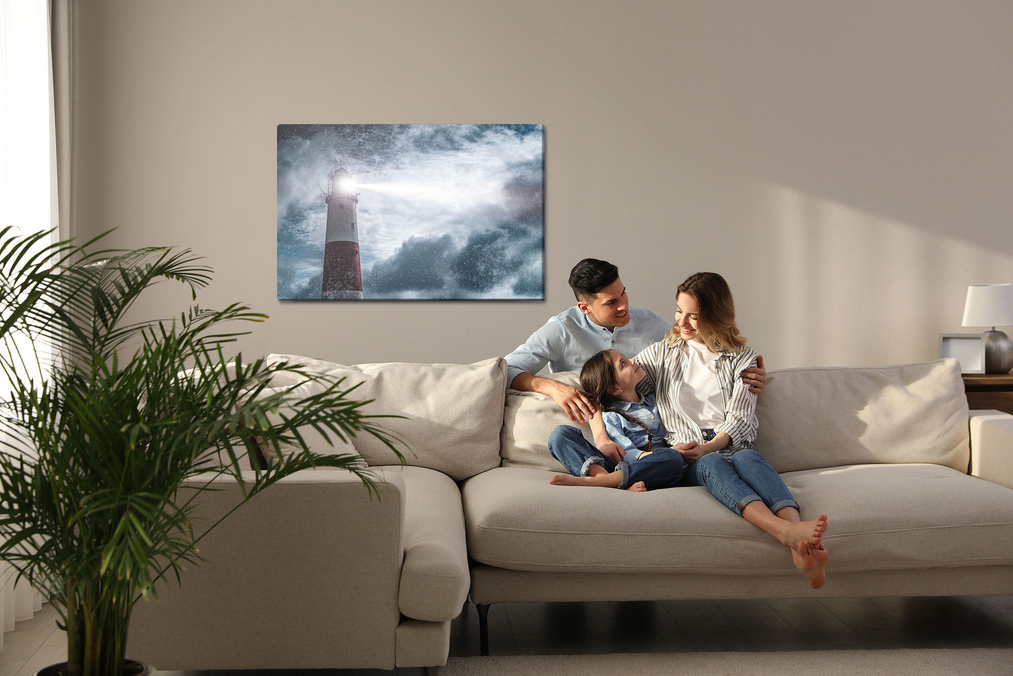 Varje tavla monteras på en massiv fururam. Format upp till 70×50 cm har en ram på 15 mm, medan format från 90×60 cm och uppåt har en ram på 20 mm. Den exakta dukspänningen gör att tavlan håller sin form över tid. Motivet Sea of snow and lighthouse trycks runt hela ramen vilket ger ett stilrent galleriuttryck där tavlan är lika vacker från sidan som framifrån. Kombinationen av rak dukspänning, rena linjer och korrekt tryck ger en professionell finish.