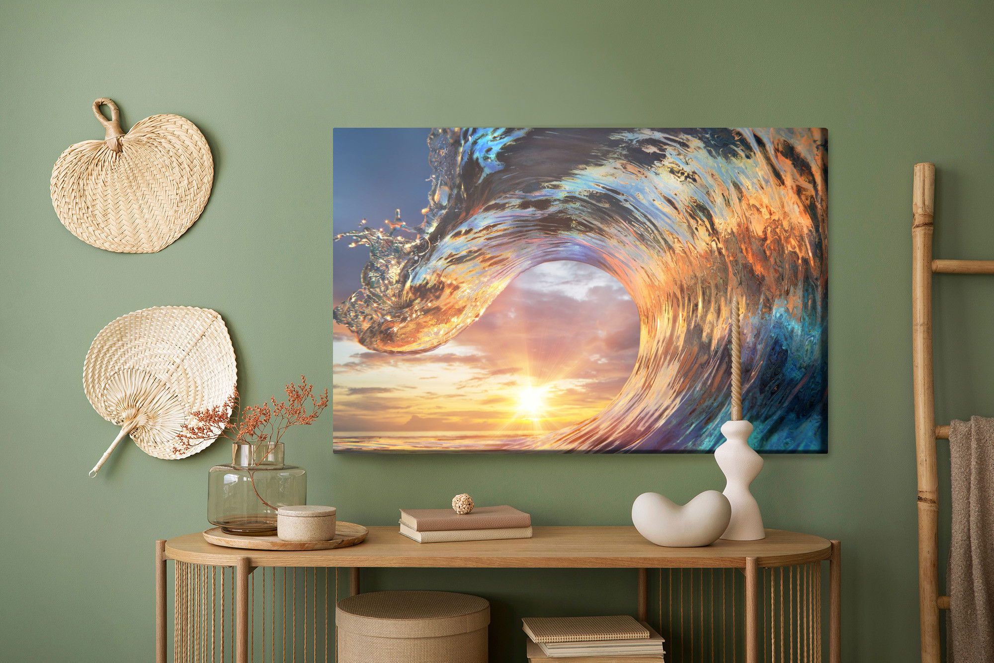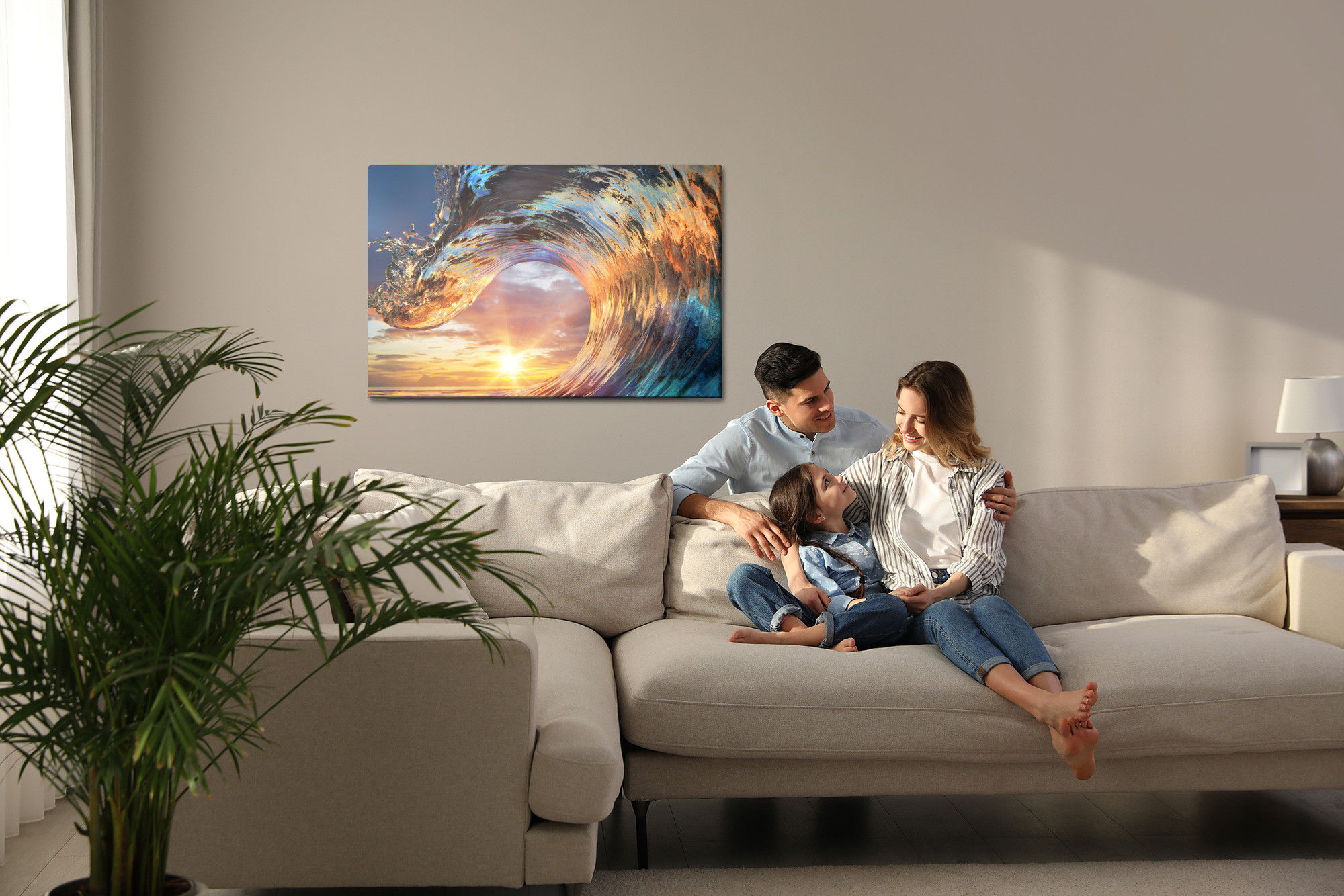 Motivet Sea wave återges med hög färgprecision och detaljrikedom tack vare HP Latex-teknologi. Trycket sker med vattenbaserade, luktfria och GREENGUARD Gold-certifierade bläck som ger en upplösning på upp till 300 DPI. Färgerna är UV-beständiga och behåller sin styrka även i ljusa rum, vilket gör tavlan lämplig för både hem- och offentliga miljöer.