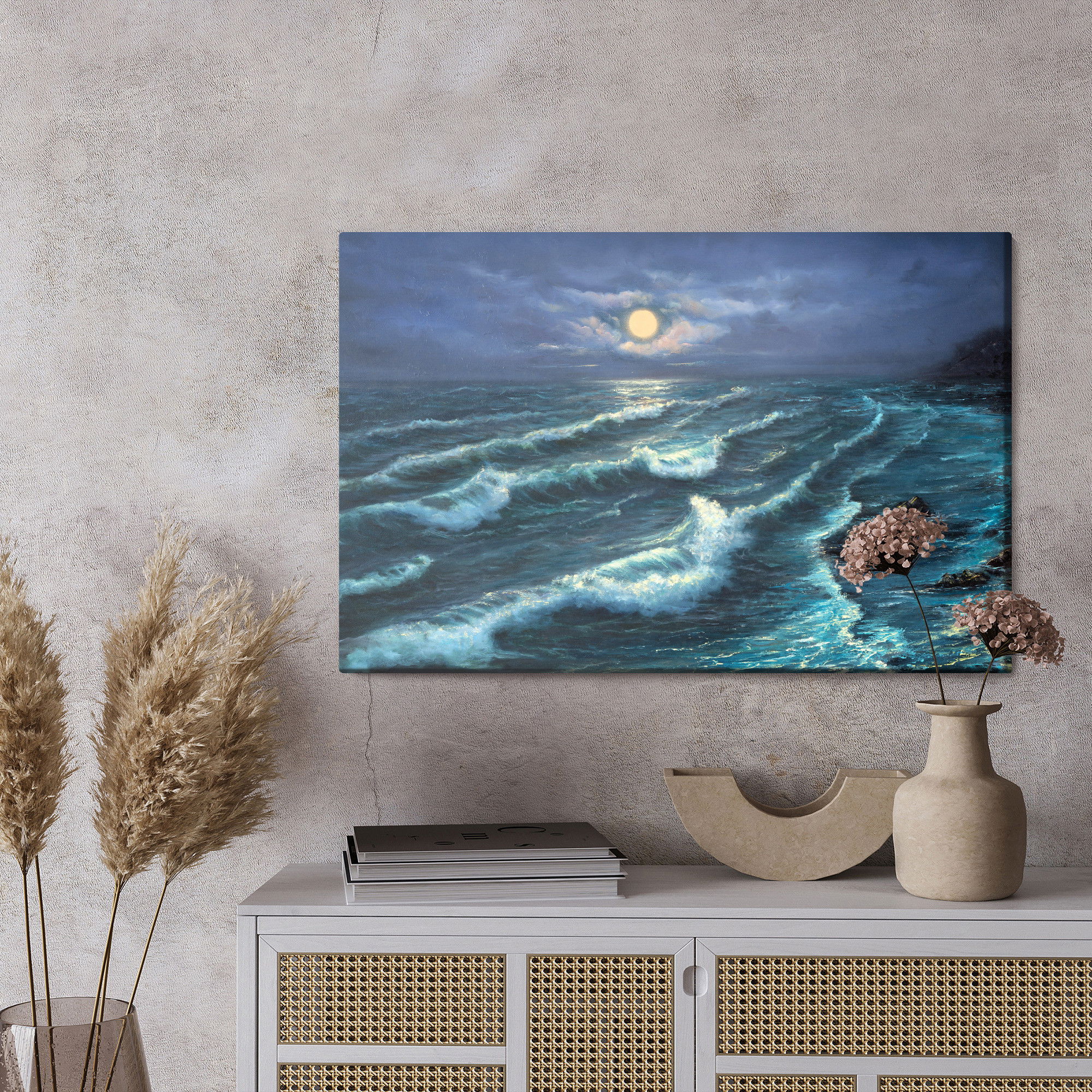 Varje tavla monteras på en massiv fururam. Format upp till 70×50 cm har en ram på 15 mm, medan format från 90×60 cm och uppåt har en ram på 20 mm. Den exakta dukspänningen gör att tavlan håller sin form över tid. Motivet Sea waves and moon trycks runt hela ramen vilket ger ett stilrent galleriuttryck där tavlan är lika vacker från sidan som framifrån. Kombinationen av rak dukspänning, rena linjer och korrekt tryck ger en professionell finish.