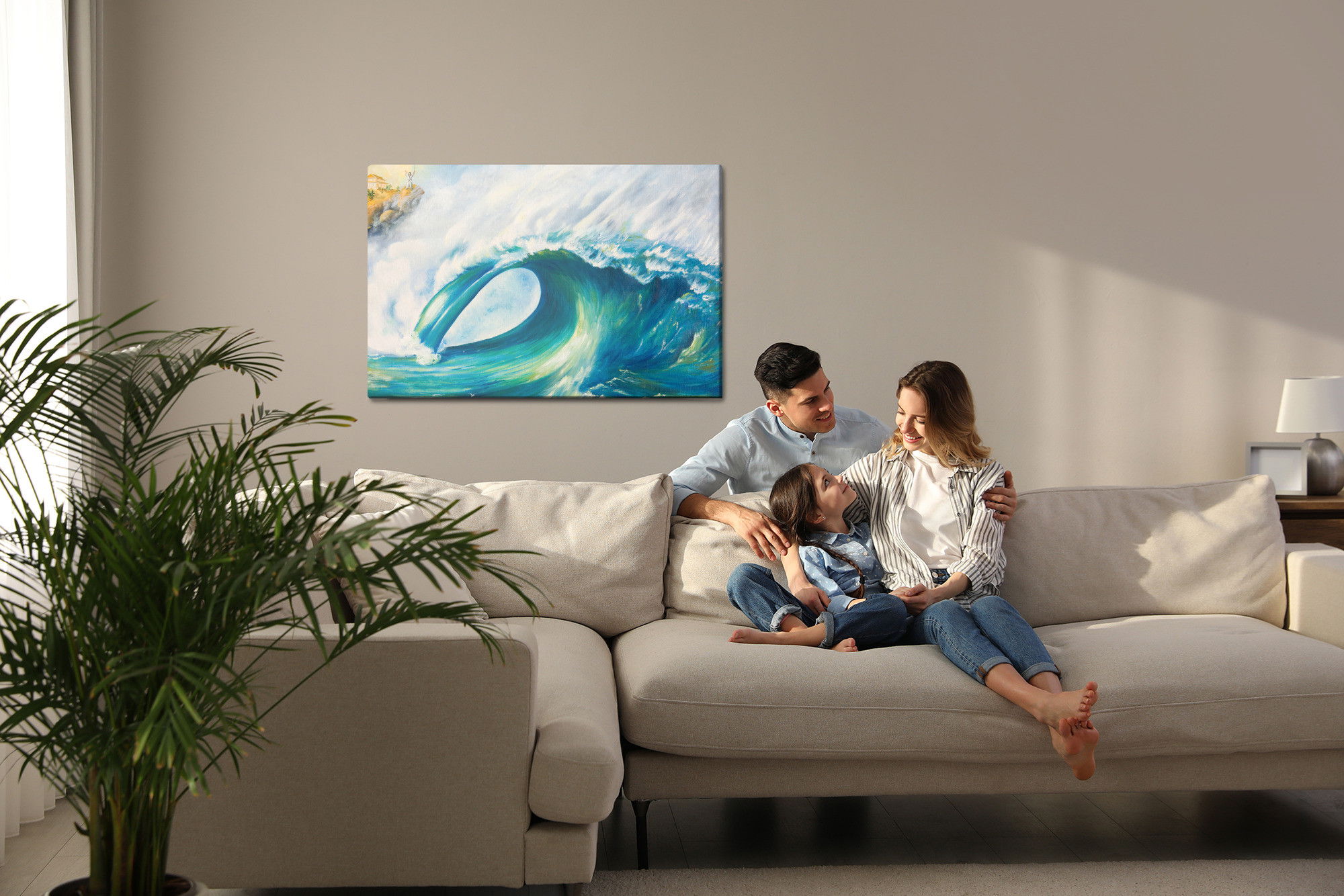 Varje tavla monteras på en massiv fururam. Format upp till 70×50 cm har en ram på 15 mm, medan format från 90×60 cm och uppåt har en ram på 20 mm. Den exakta dukspänningen gör att tavlan håller sin form över tid. Motivet Sea with giant wave trycks runt hela ramen vilket ger ett stilrent galleriuttryck där tavlan är lika vacker från sidan som framifrån. Kombinationen av rak dukspänning, rena linjer och korrekt tryck ger en professionell finish.