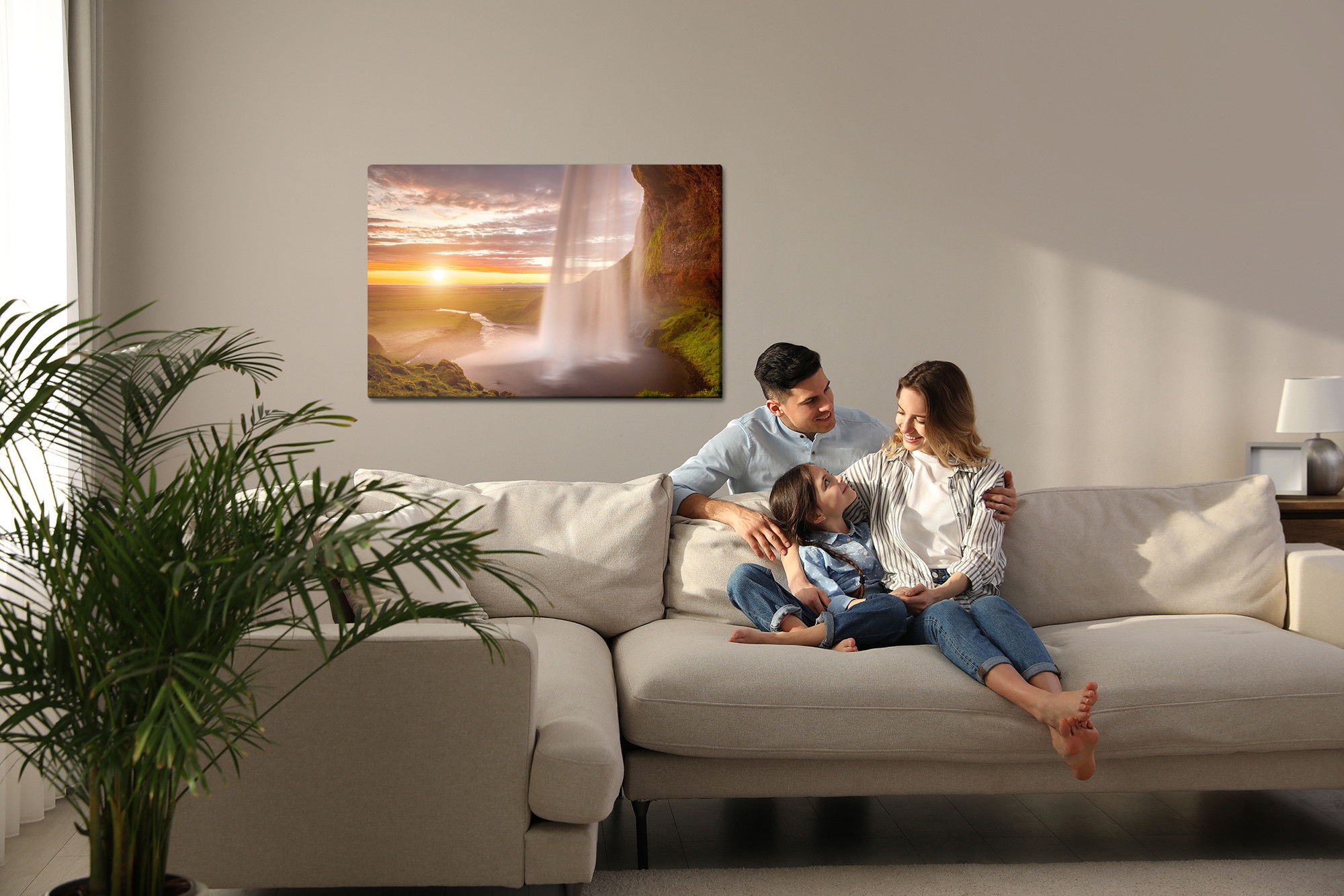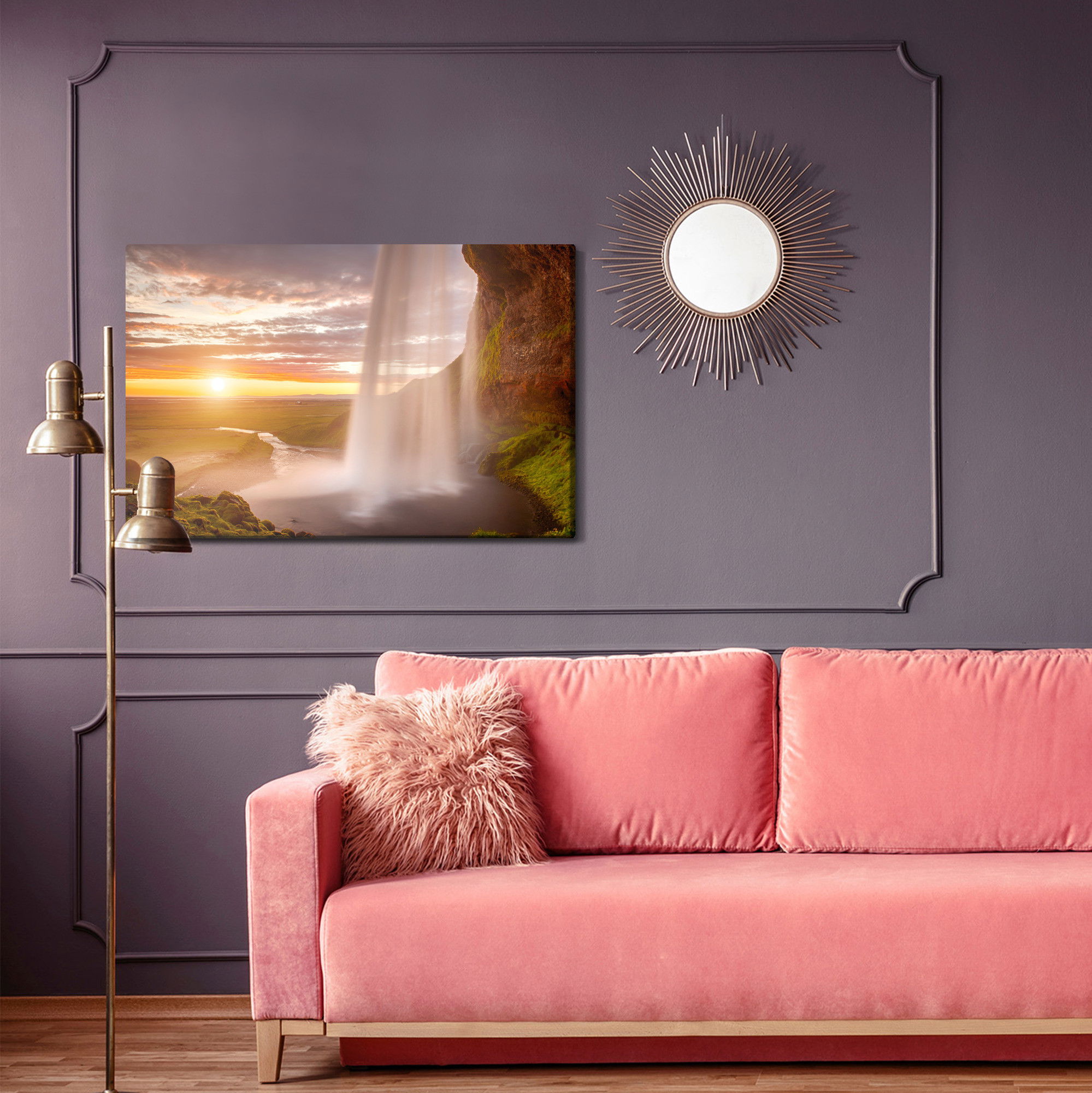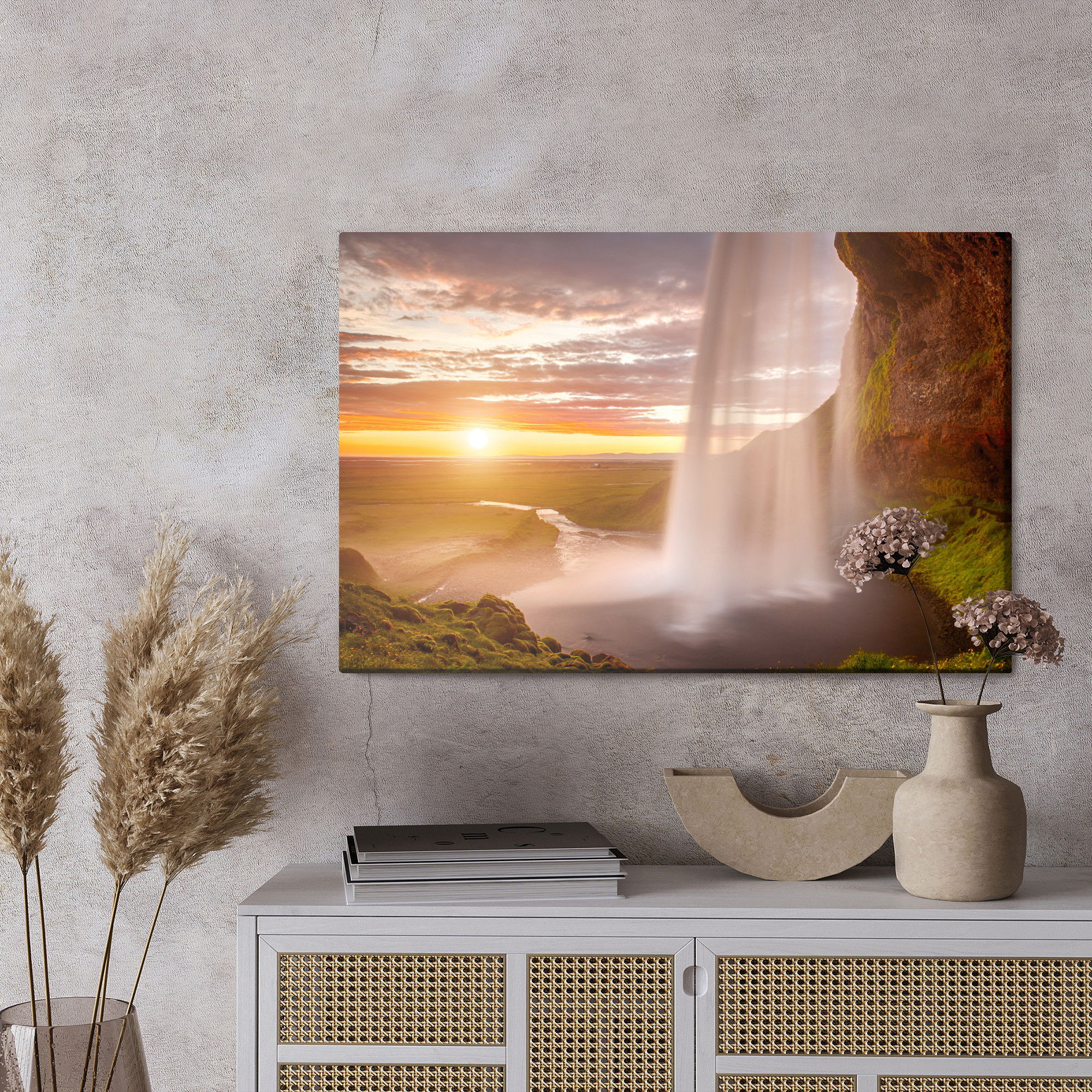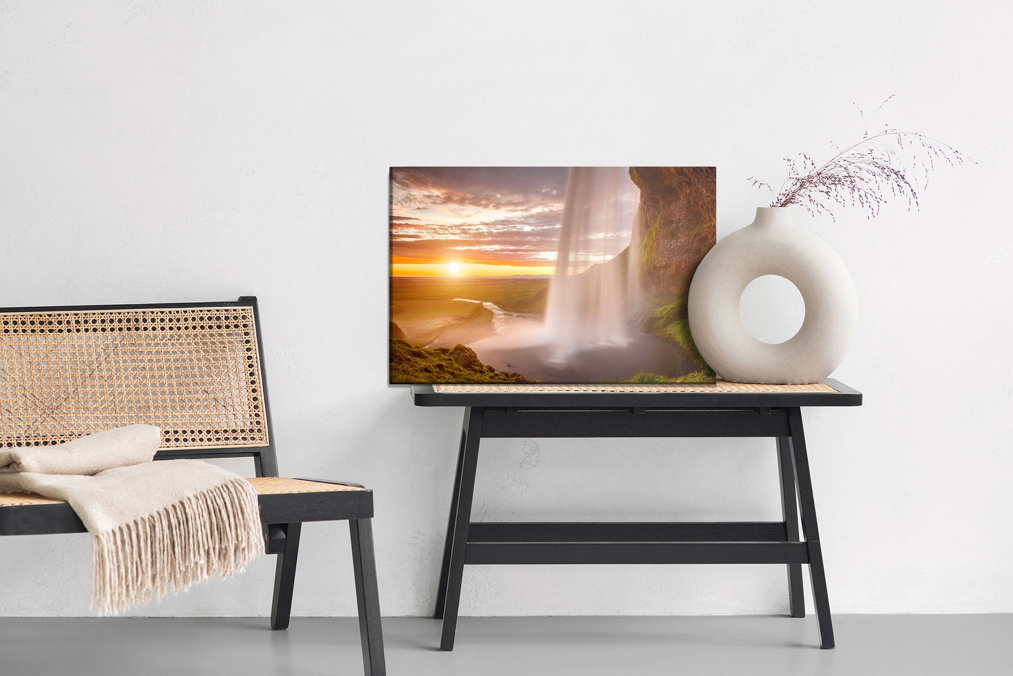 Varje tavla monteras på en massiv fururam. Format upp till 70×50 cm har en ram på 15 mm, medan format från 90×60 cm och uppåt har en ram på 20 mm. Den exakta dukspänningen gör att tavlan håller sin form över tid. Motivet Seljalandsfoss waterfall trycks runt hela ramen vilket ger ett stilrent galleriuttryck där tavlan är lika vacker från sidan som framifrån. Kombinationen av rak dukspänning, rena linjer och korrekt tryck ger en professionell finish.