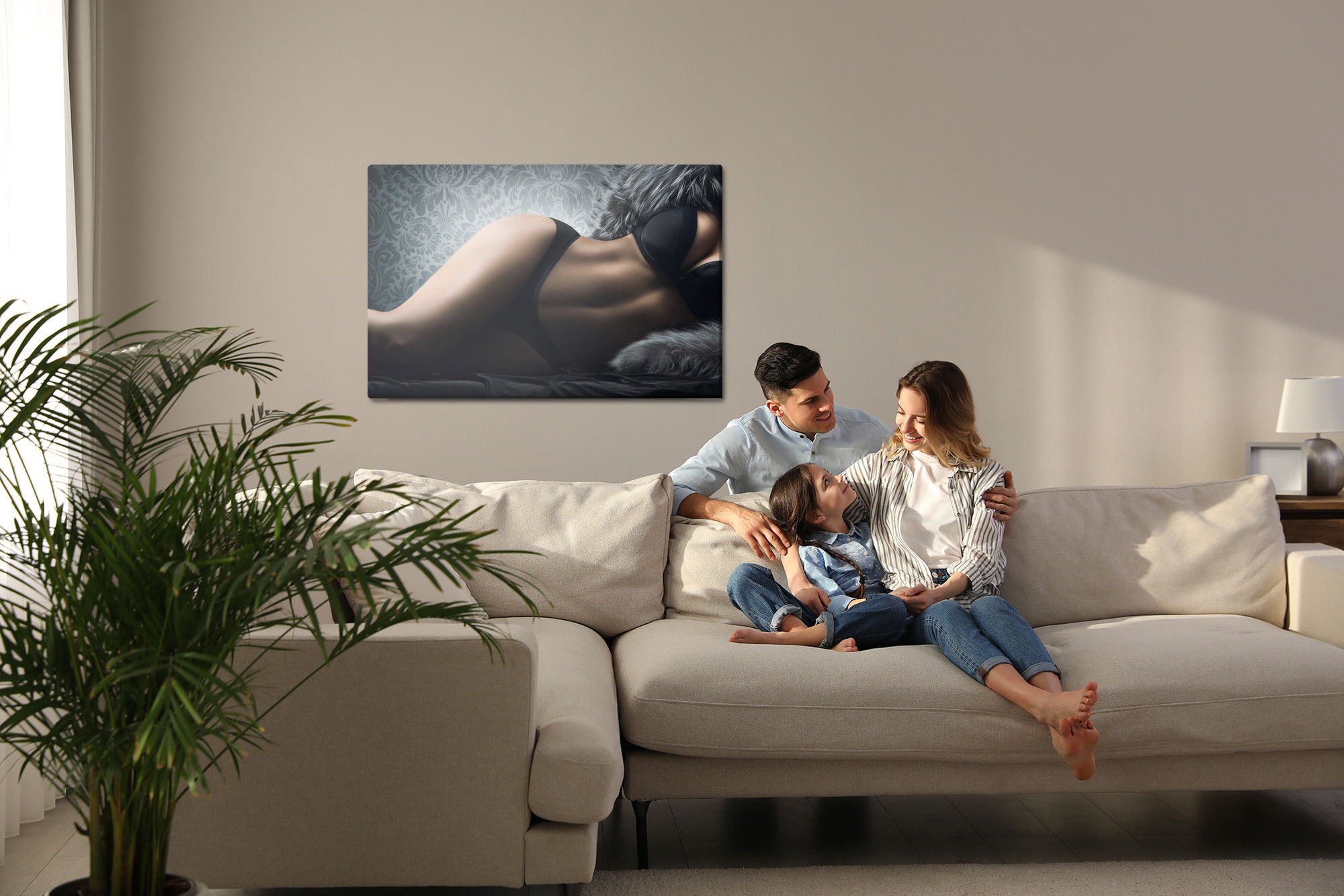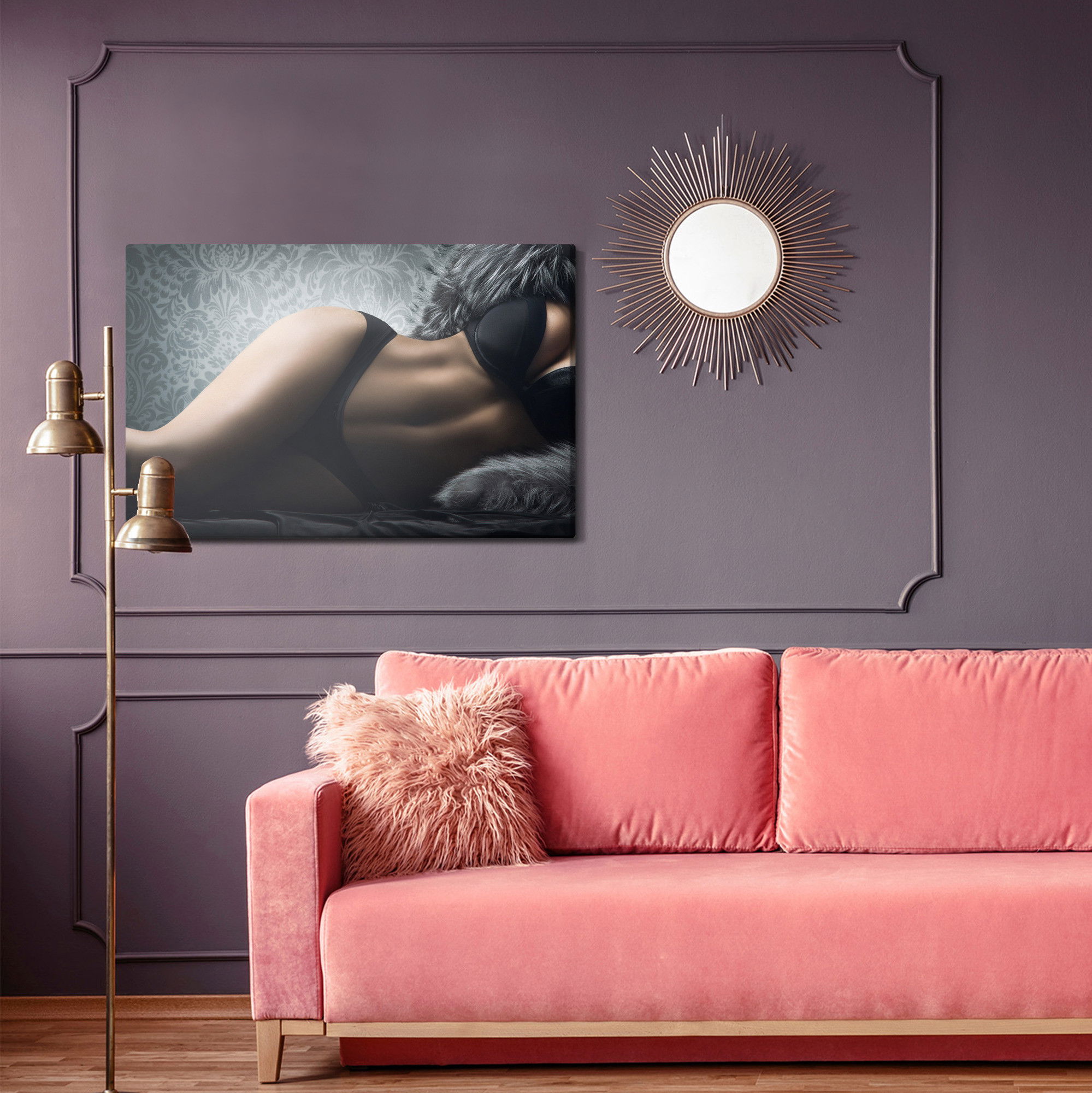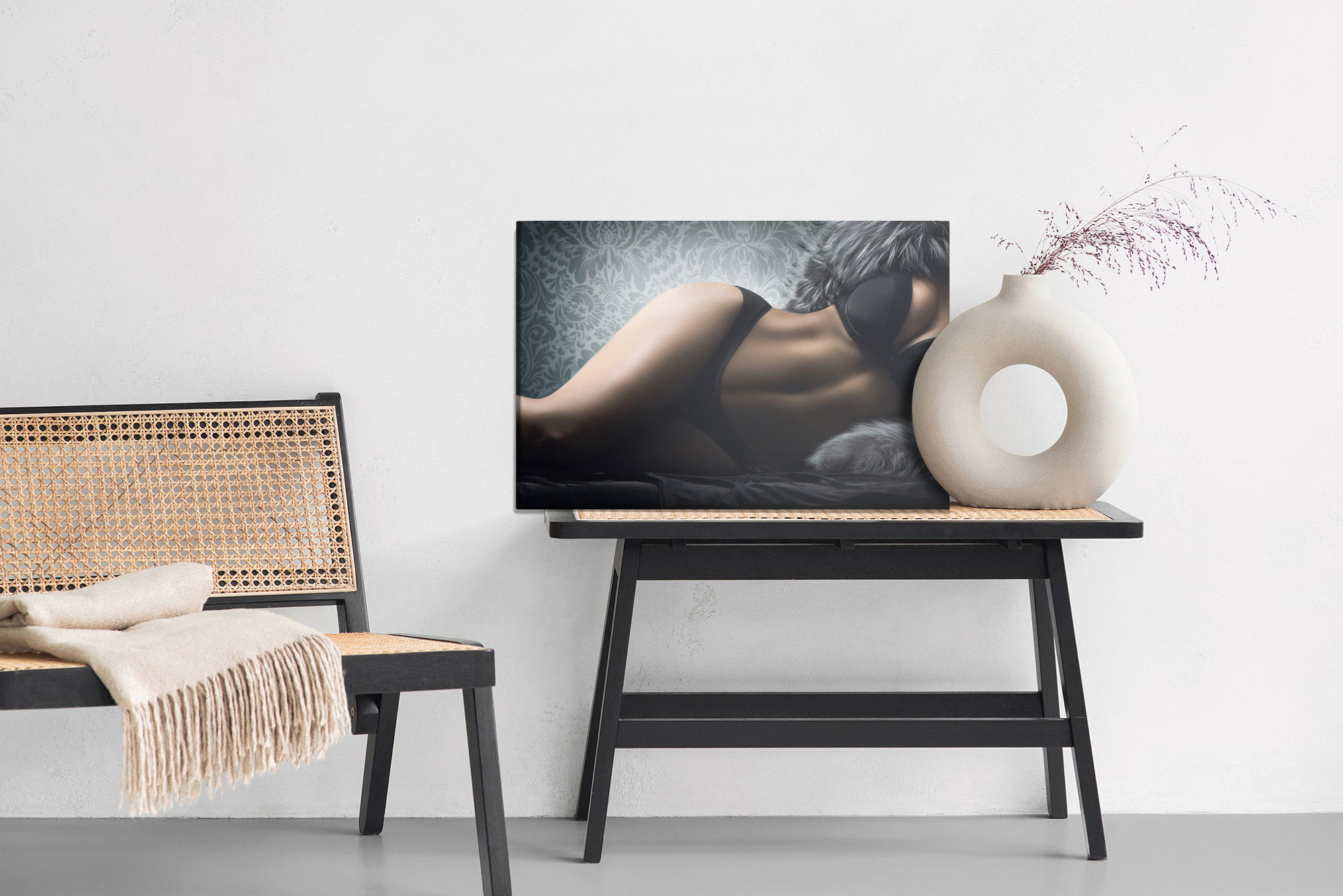 Varje tavla monteras på en massiv fururam. Format upp till 70×50 cm har en ram på 15 mm, medan format från 90×60 cm och uppåt har en ram på 20 mm. Den exakta dukspänningen gör att tavlan håller sin form över tid. Motivet Sensual woman trycks runt hela ramen vilket ger ett stilrent galleriuttryck där tavlan är lika vacker från sidan som framifrån. Kombinationen av rak dukspänning, rena linjer och korrekt tryck ger en professionell finish.