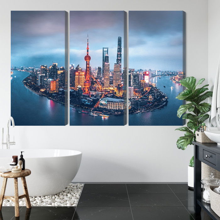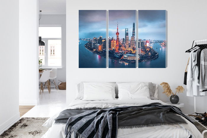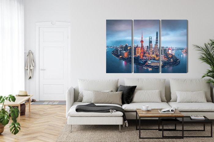 Varje tavla monteras på en massiv fururam. Format upp till 70×50 cm har en ram på 15 mm, medan format från 90×60 cm och uppåt har en ram på 20 mm. Den exakta dukspänningen gör att tavlan håller sin form över tid. Motivet Shanghai panorama at night trycks runt hela ramen vilket ger ett stilrent galleriuttryck där tavlan är lika vacker från sidan som framifrån. Kombinationen av rak dukspänning, rena linjer och korrekt tryck ger en professionell finish.