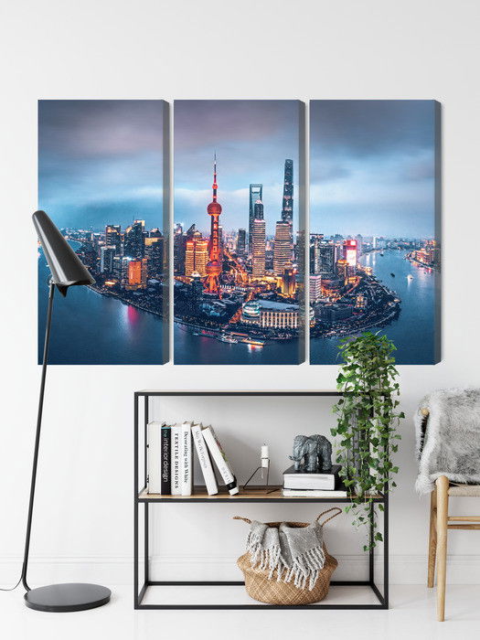 SilentDirects ljuddämpande tavla Shanghai panorama at night kombinerar ett högupplöst motiv med avancerad akustikteknik. Varje tavla monteras i Sverige och bygger på en stabil canvastavla med fururam, där insidan av ramen fylls med en ljudabsorberande kärna av återvunnen polyester. Konstruktionen gör tavlan till ett både estetiskt och funktionellt inslag i rummet.