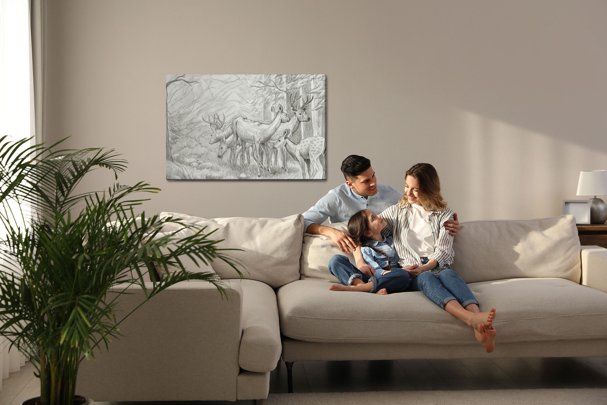 Varje tavla monteras på en massiv fururam. Format upp till 70×50 cm har en ram på 15 mm, medan format från 90×60 cm och uppåt har en ram på 20 mm. Den exakta dukspänningen gör att tavlan håller sin form över tid. Motivet Sketch of a deer trycks runt hela ramen vilket ger ett stilrent galleriuttryck där tavlan är lika vacker från sidan som framifrån. Kombinationen av rak dukspänning, rena linjer och korrekt tryck ger en professionell finish.