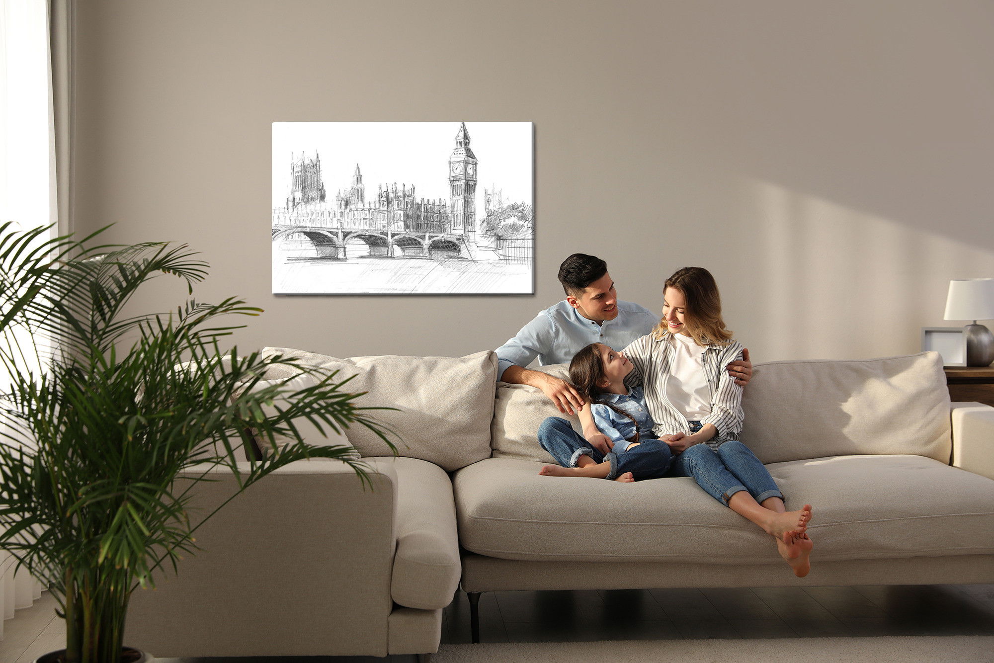 Motivet Sketch of the London skyline återges med hög färgprecision och detaljrikedom tack vare HP Latex-teknologi. Trycket sker med vattenbaserade, luktfria och GREENGUARD Gold-certifierade bläck som ger en upplösning på upp till 300 DPI. Färgerna är UV-beständiga och behåller sin styrka även i ljusa rum, vilket gör tavlan lämplig för både hem- och offentliga miljöer.