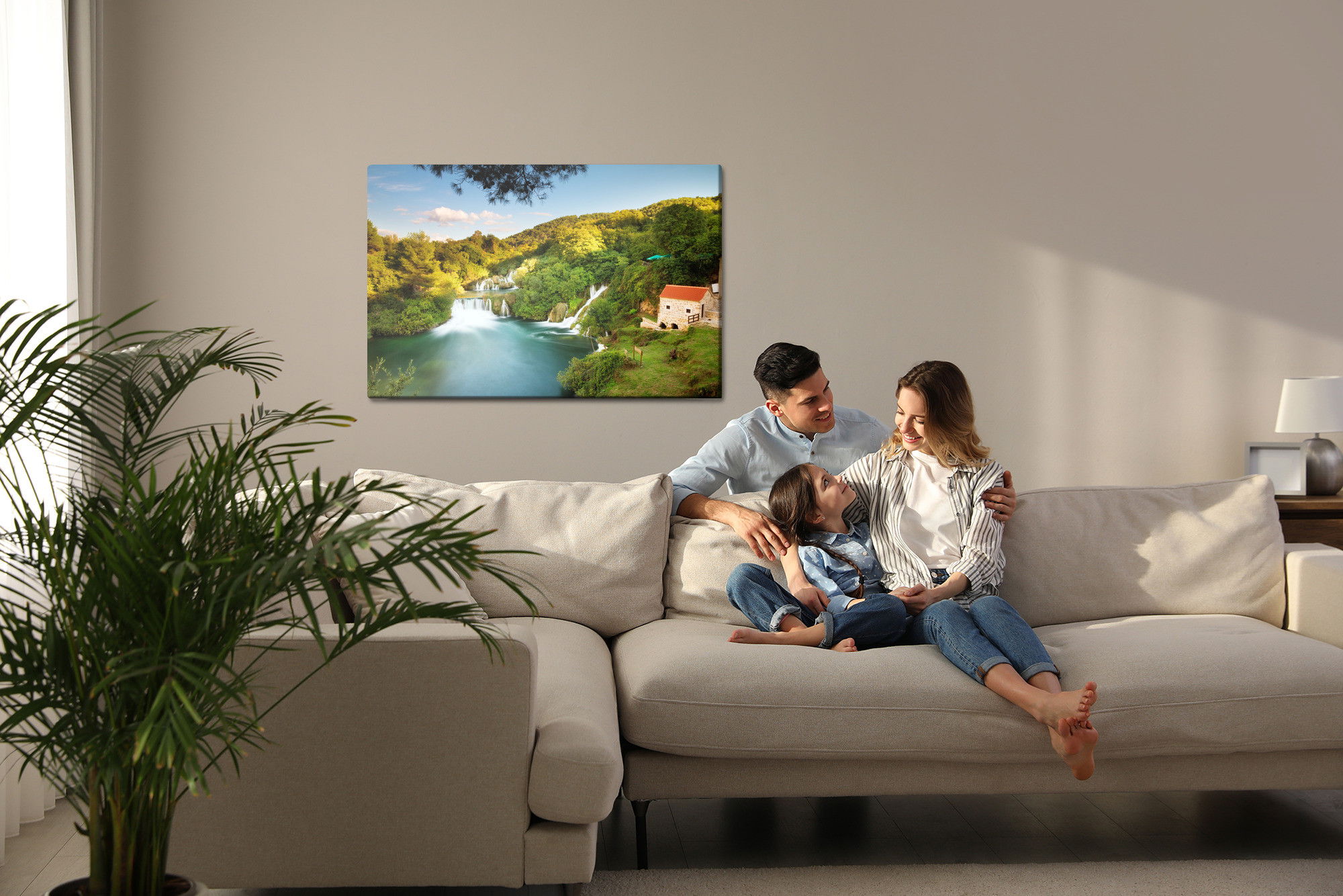 Varje tavla monteras på en massiv fururam. Format upp till 70×50 cm har en ram på 15 mm, medan format från 90×60 cm och uppåt har en ram på 20 mm. Den exakta dukspänningen gör att tavlan håller sin form över tid. Motivet Skradinski buk waterfall trycks runt hela ramen vilket ger ett stilrent galleriuttryck där tavlan är lika vacker från sidan som framifrån. Kombinationen av rak dukspänning, rena linjer och korrekt tryck ger en professionell finish.