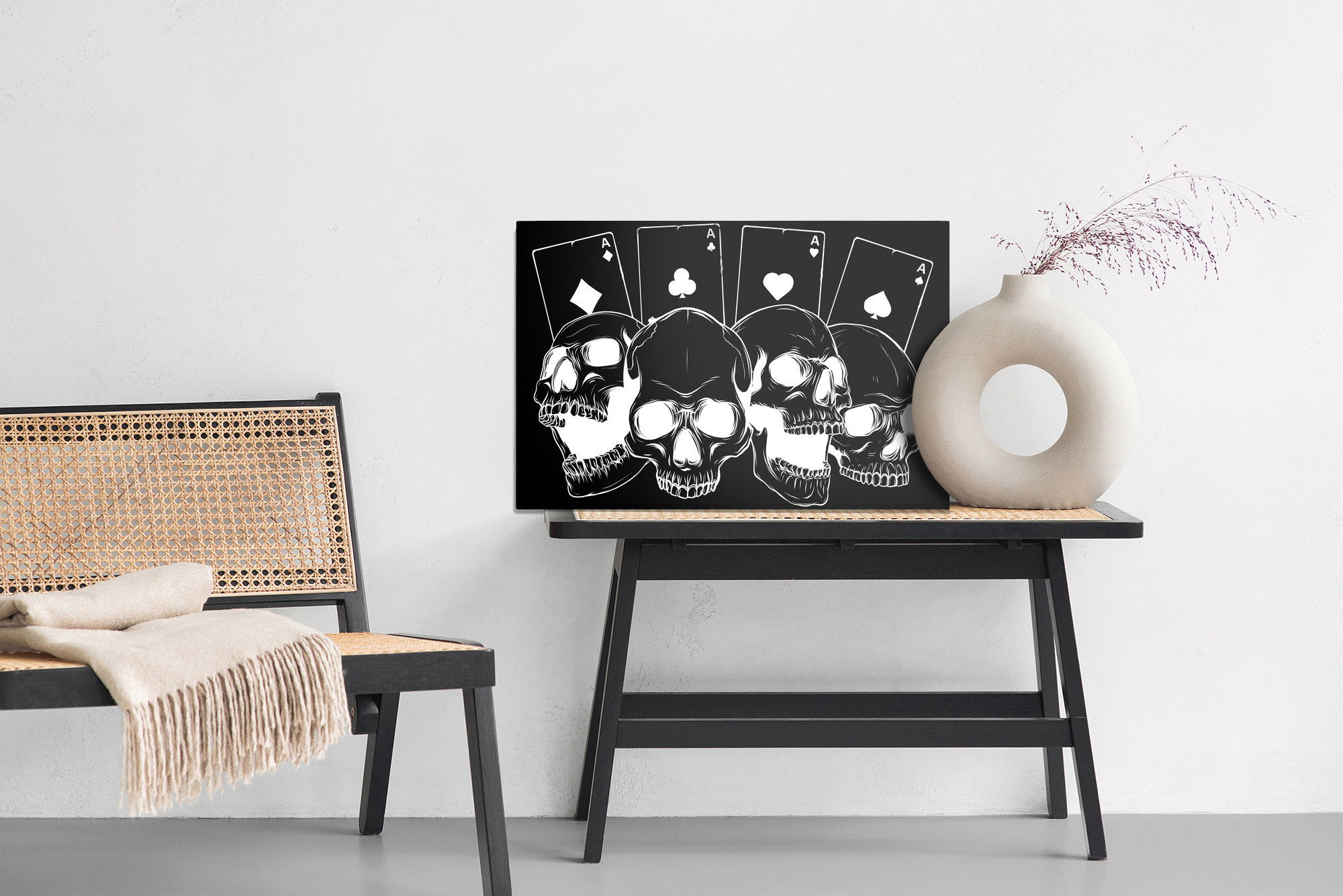 Motivet Skulls on a background återges med hög färgprecision och detaljrikedom tack vare HP Latex-teknologi. Trycket sker med vattenbaserade, luktfria och GREENGUARD Gold-certifierade bläck som ger en upplösning på upp till 300 DPI. Färgerna är UV-beständiga och behåller sin styrka även i ljusa rum, vilket gör tavlan lämplig för både hem- och offentliga miljöer.