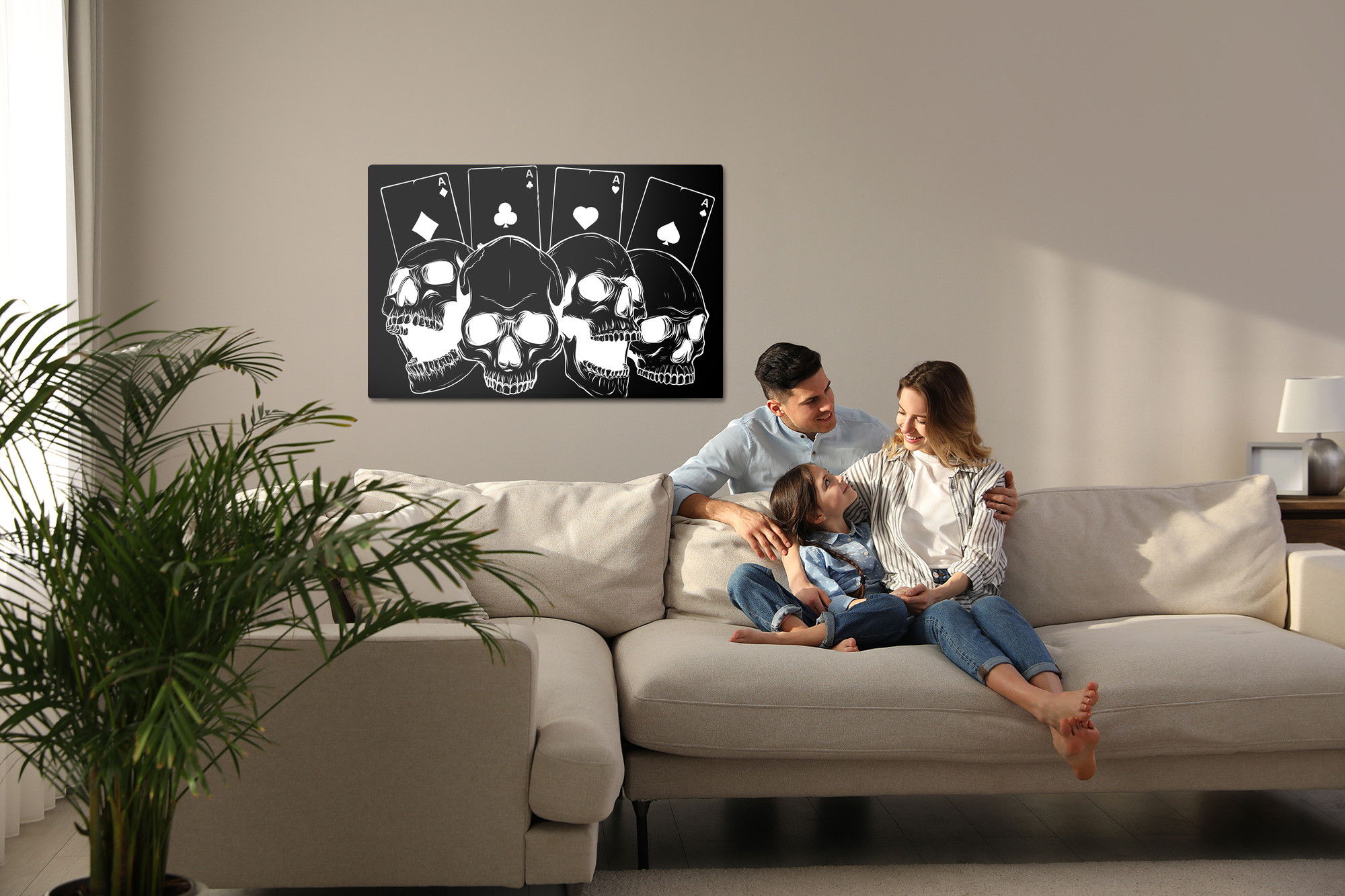 Varje tavla monteras på en massiv fururam. Format upp till 70×50 cm har en ram på 15 mm, medan format från 90×60 cm och uppåt har en ram på 20 mm. Den exakta dukspänningen gör att tavlan håller sin form över tid. Motivet Skulls on a background trycks runt hela ramen vilket ger ett stilrent galleriuttryck där tavlan är lika vacker från sidan som framifrån. Kombinationen av rak dukspänning, rena linjer och korrekt tryck ger en professionell finish.