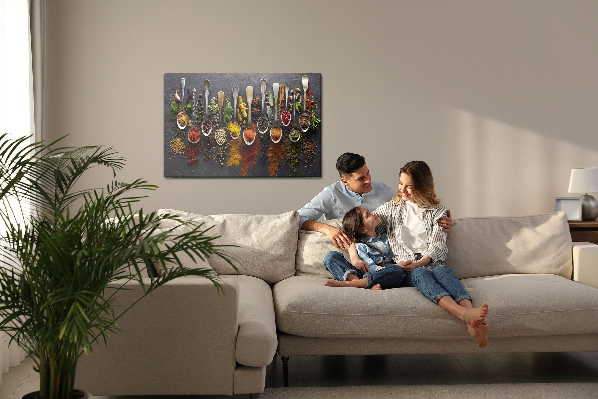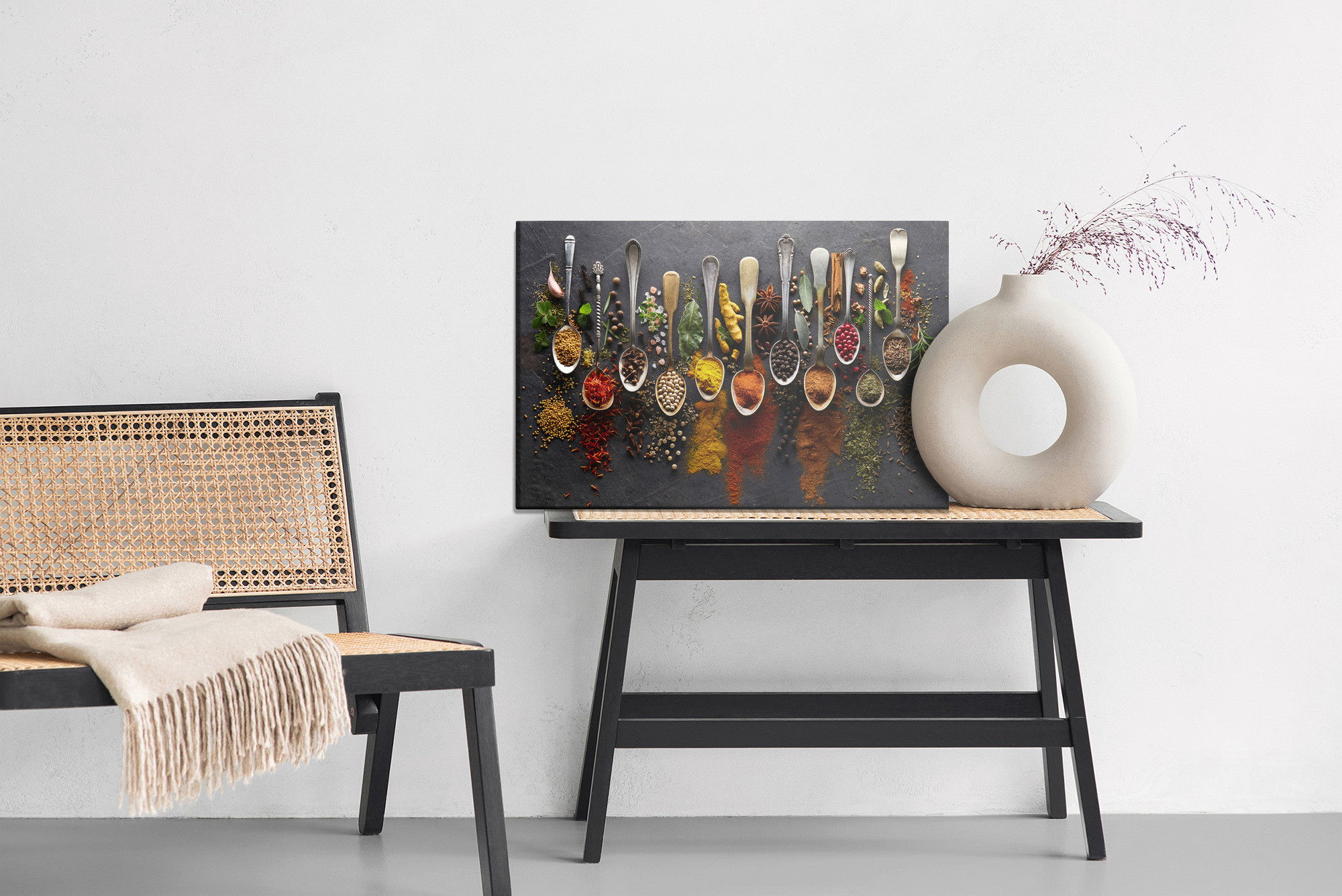 Motivet Spoon with herbs and spices återges med hög färgprecision och detaljrikedom tack vare HP Latex-teknologi. Trycket sker med vattenbaserade, luktfria och GREENGUARD Gold-certifierade bläck som ger en upplösning på upp till 300 DPI. Färgerna är UV-beständiga och behåller sin styrka även i ljusa rum, vilket gör tavlan lämplig för både hem- och offentliga miljöer.