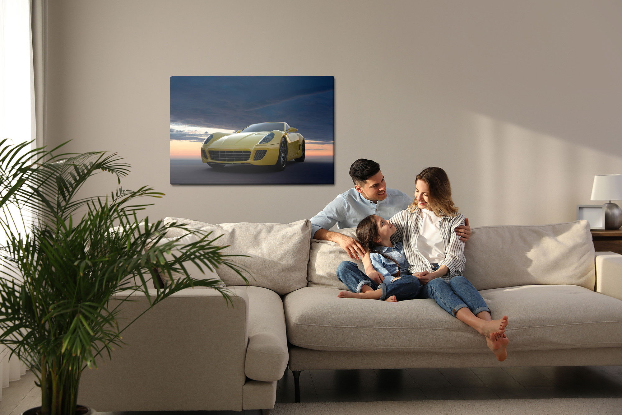 Varje tavla monteras på en massiv fururam. Format upp till 70×50 cm har en ram på 15 mm, medan format från 90×60 cm och uppåt har en ram på 20 mm. Den exakta dukspänningen gör att tavlan håller sin form över tid. Motivet Sports car and clouds trycks runt hela ramen vilket ger ett stilrent galleriuttryck där tavlan är lika vacker från sidan som framifrån. Kombinationen av rak dukspänning, rena linjer och korrekt tryck ger en professionell finish.