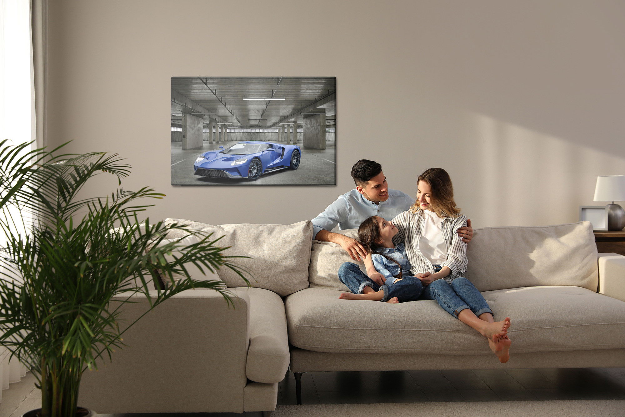 Varje tavla monteras på en massiv fururam. Format upp till 70×50 cm har en ram på 15 mm, medan format från 90×60 cm och uppåt har en ram på 20 mm. Den exakta dukspänningen gör att tavlan håller sin form över tid. Motivet Sports car in the garage trycks runt hela ramen vilket ger ett stilrent galleriuttryck där tavlan är lika vacker från sidan som framifrån. Kombinationen av rak dukspänning, rena linjer och korrekt tryck ger en professionell finish.