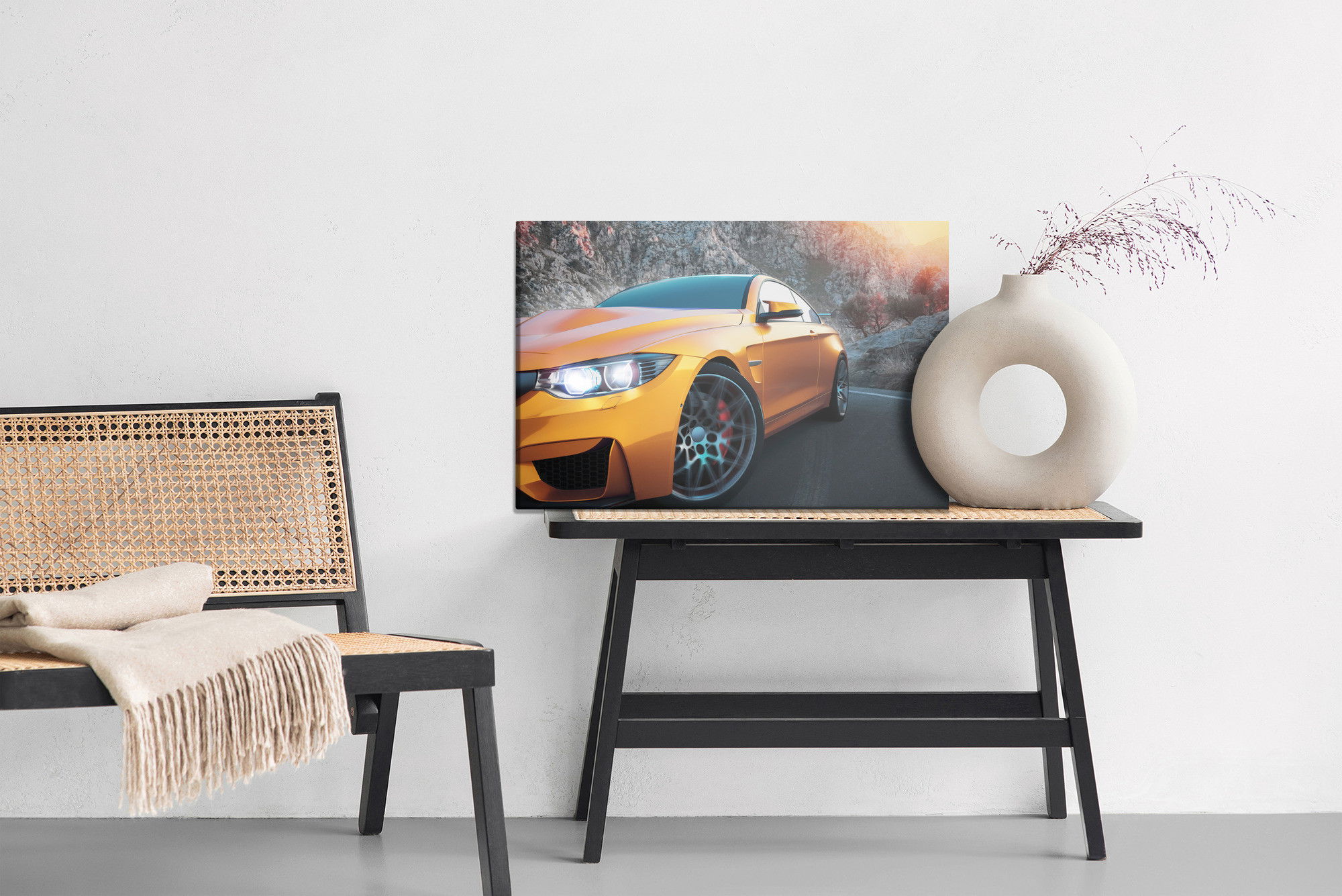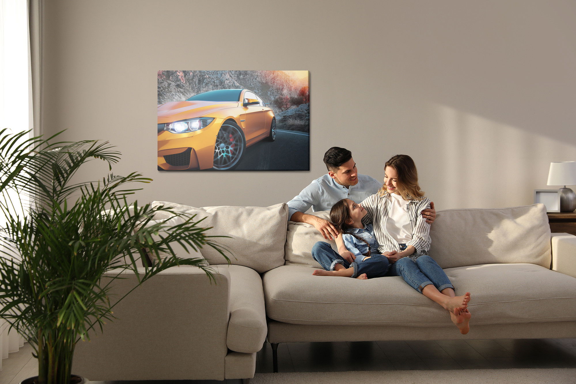 Motivet Sports car in the mountains återges med hög färgprecision och detaljrikedom tack vare HP Latex-teknologi. Trycket sker med vattenbaserade, luktfria och GREENGUARD Gold-certifierade bläck som ger en upplösning på upp till 300 DPI. Färgerna är UV-beständiga och behåller sin styrka även i ljusa rum, vilket gör tavlan lämplig för både hem- och offentliga miljöer.