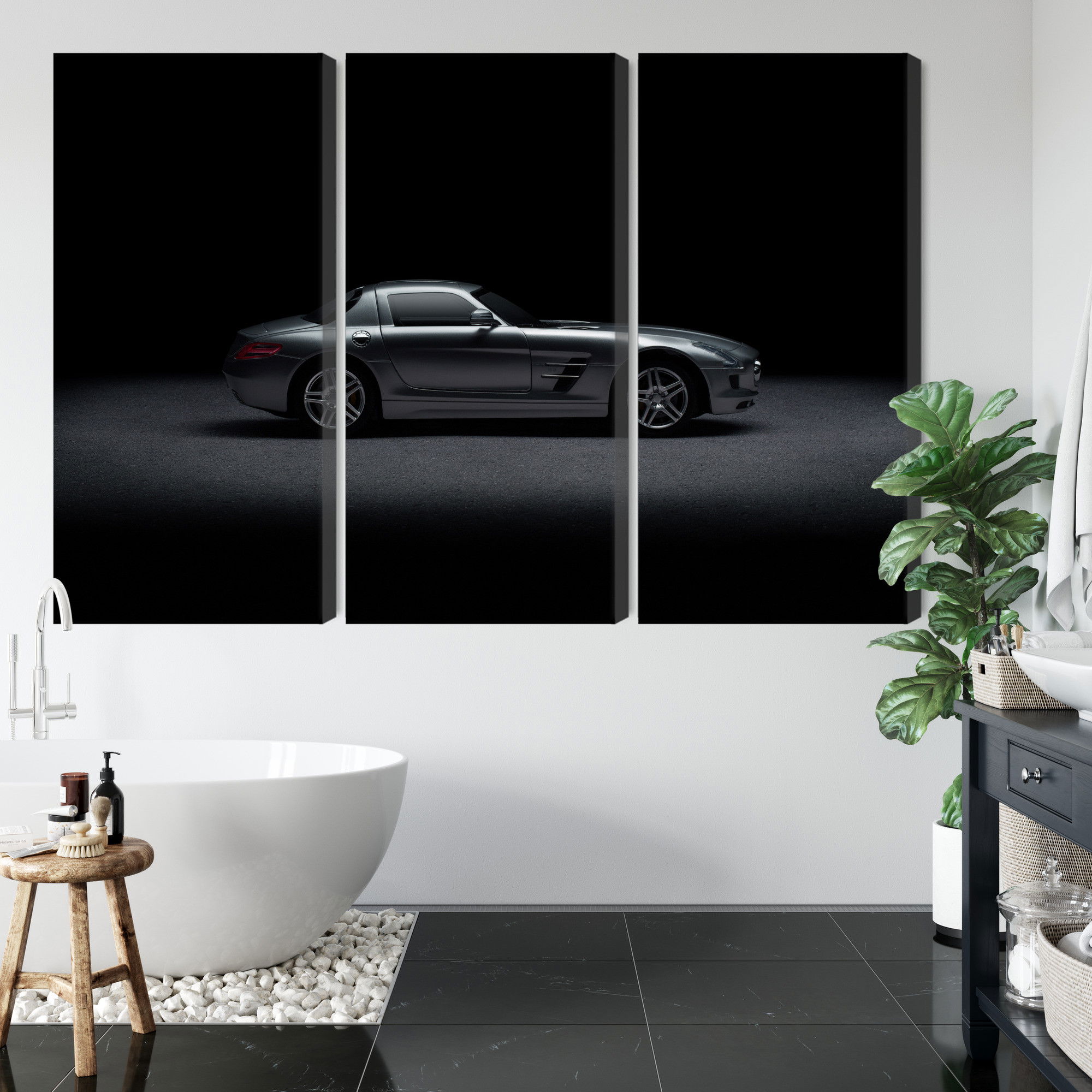 Varje tavla monteras på en massiv fururam. Format upp till 70×50 cm har en ram på 15 mm, medan format från 90×60 cm och uppåt har en ram på 20 mm. Den exakta dukspänningen gör att tavlan håller sin form över tid. Motivet Sports car on a dark trycks runt hela ramen vilket ger ett stilrent galleriuttryck där tavlan är lika vacker från sidan som framifrån. Kombinationen av rak dukspänning, rena linjer och korrekt tryck ger en professionell finish.