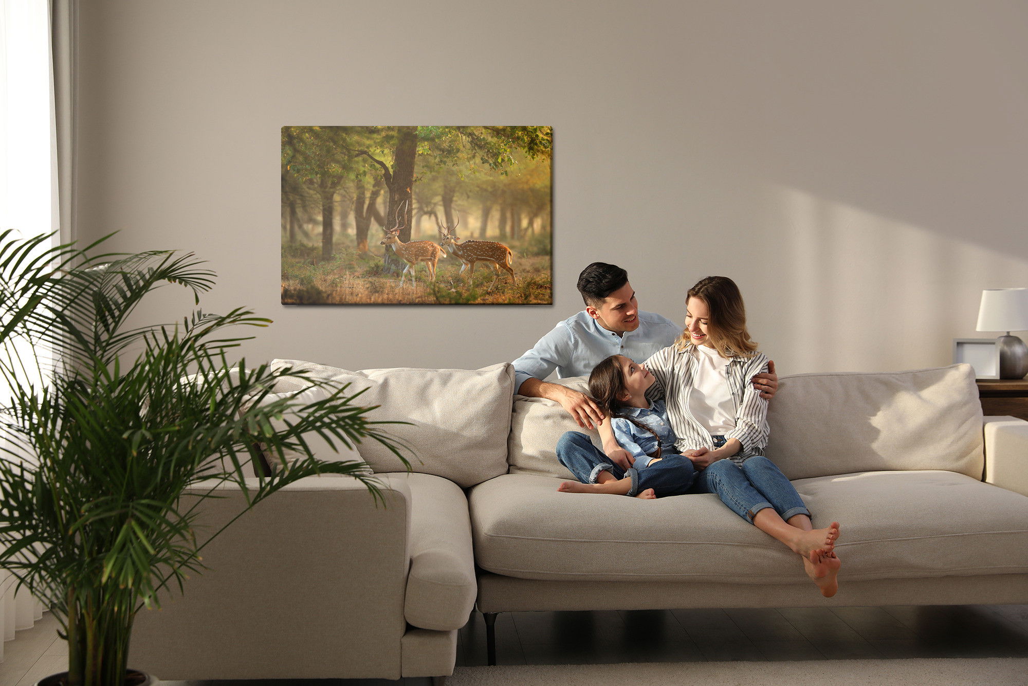 Motivet Spotted young deer återges med hög färgprecision och detaljrikedom tack vare HP Latex-teknologi. Trycket sker med vattenbaserade, luktfria och GREENGUARD Gold-certifierade bläck som ger en upplösning på upp till 300 DPI. Färgerna är UV-beständiga och behåller sin styrka även i ljusa rum, vilket gör tavlan lämplig för både hem- och offentliga miljöer.