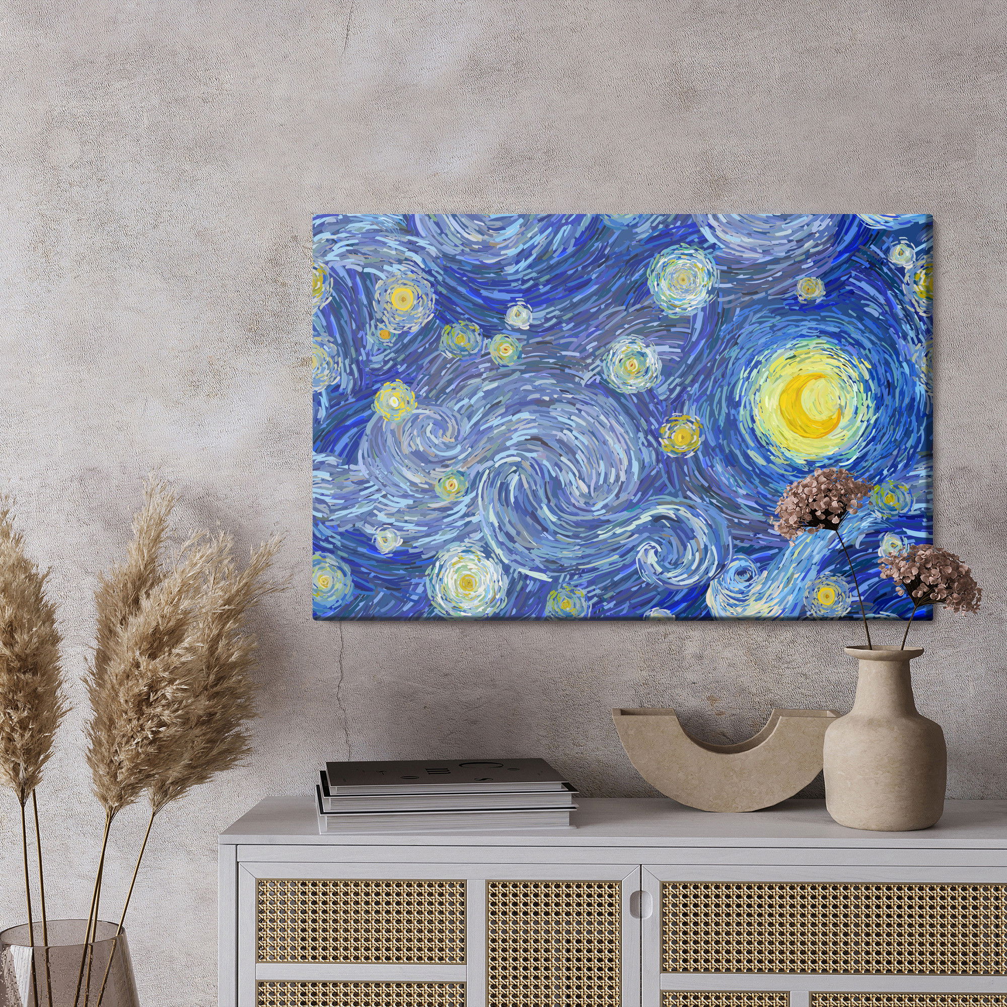 Motivet Starry night in the style återges med hög färgprecision och detaljrikedom tack vare HP Latex-teknologi. Trycket sker med vattenbaserade, luktfria och GREENGUARD Gold-certifierade bläck som ger en upplösning på upp till 300 DPI. Färgerna är UV-beständiga och behåller sin styrka även i ljusa rum, vilket gör tavlan lämplig för både hem- och offentliga miljöer.
