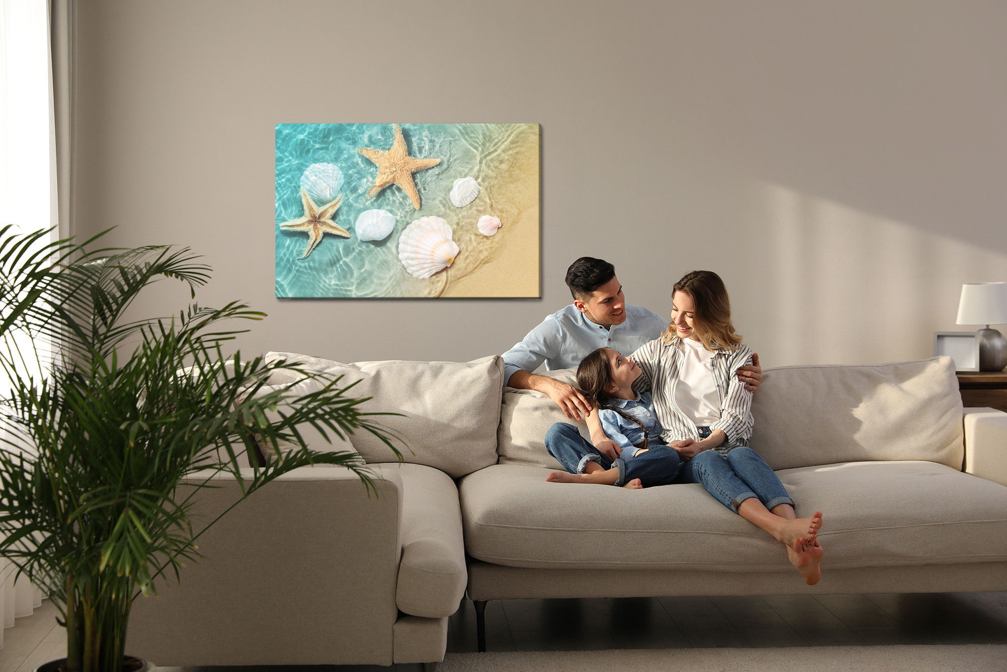 Varje tavla monteras på en massiv fururam. Format upp till 70×50 cm har en ram på 15 mm, medan format från 90×60 cm och uppåt har en ram på 20 mm. Den exakta dukspänningen gör att tavlan håller sin form över tid. Motivet Stars and seashells trycks runt hela ramen vilket ger ett stilrent galleriuttryck där tavlan är lika vacker från sidan som framifrån. Kombinationen av rak dukspänning, rena linjer och korrekt tryck ger en professionell finish.