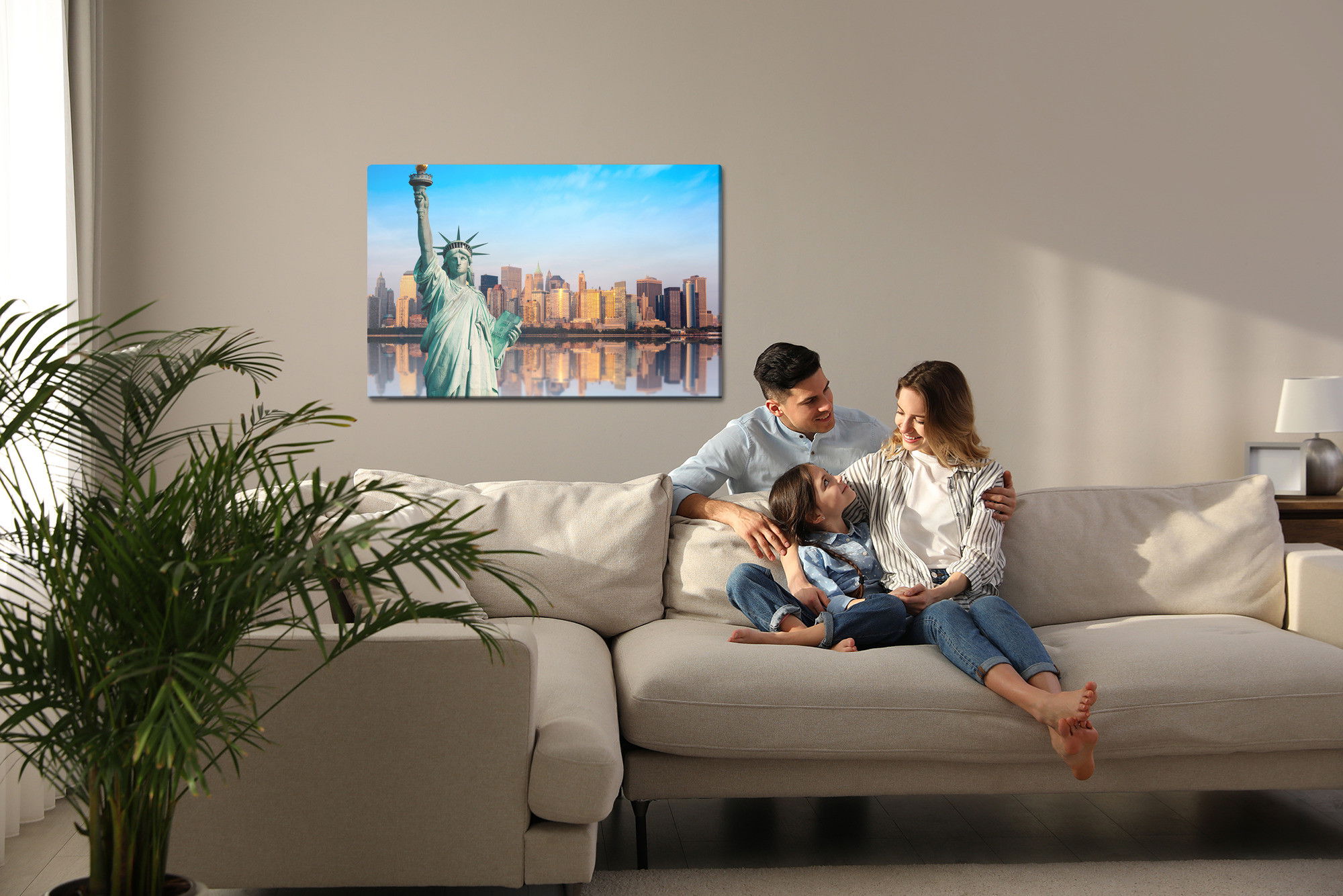 Varje tavla monteras på en massiv fururam. Format upp till 70×50 cm har en ram på 15 mm, medan format från 90×60 cm och uppåt har en ram på 20 mm. Den exakta dukspänningen gör att tavlan håller sin form över tid. Motivet Statue of liberty in New York trycks runt hela ramen vilket ger ett stilrent galleriuttryck där tavlan är lika vacker från sidan som framifrån. Kombinationen av rak dukspänning, rena linjer och korrekt tryck ger en professionell finish.