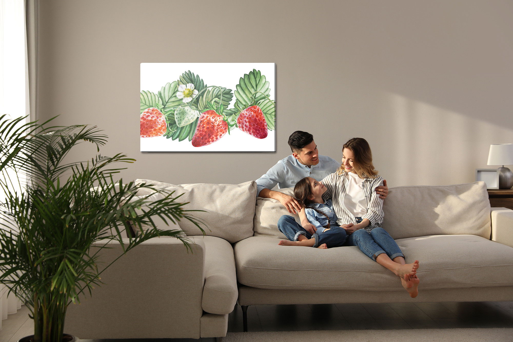 Motivet Strawberries with flowers återges med hög färgprecision och detaljrikedom tack vare HP Latex-teknologi. Trycket sker med vattenbaserade, luktfria och GREENGUARD Gold-certifierade bläck som ger en upplösning på upp till 300 DPI. Färgerna är UV-beständiga och behåller sin styrka även i ljusa rum, vilket gör tavlan lämplig för både hem- och offentliga miljöer.