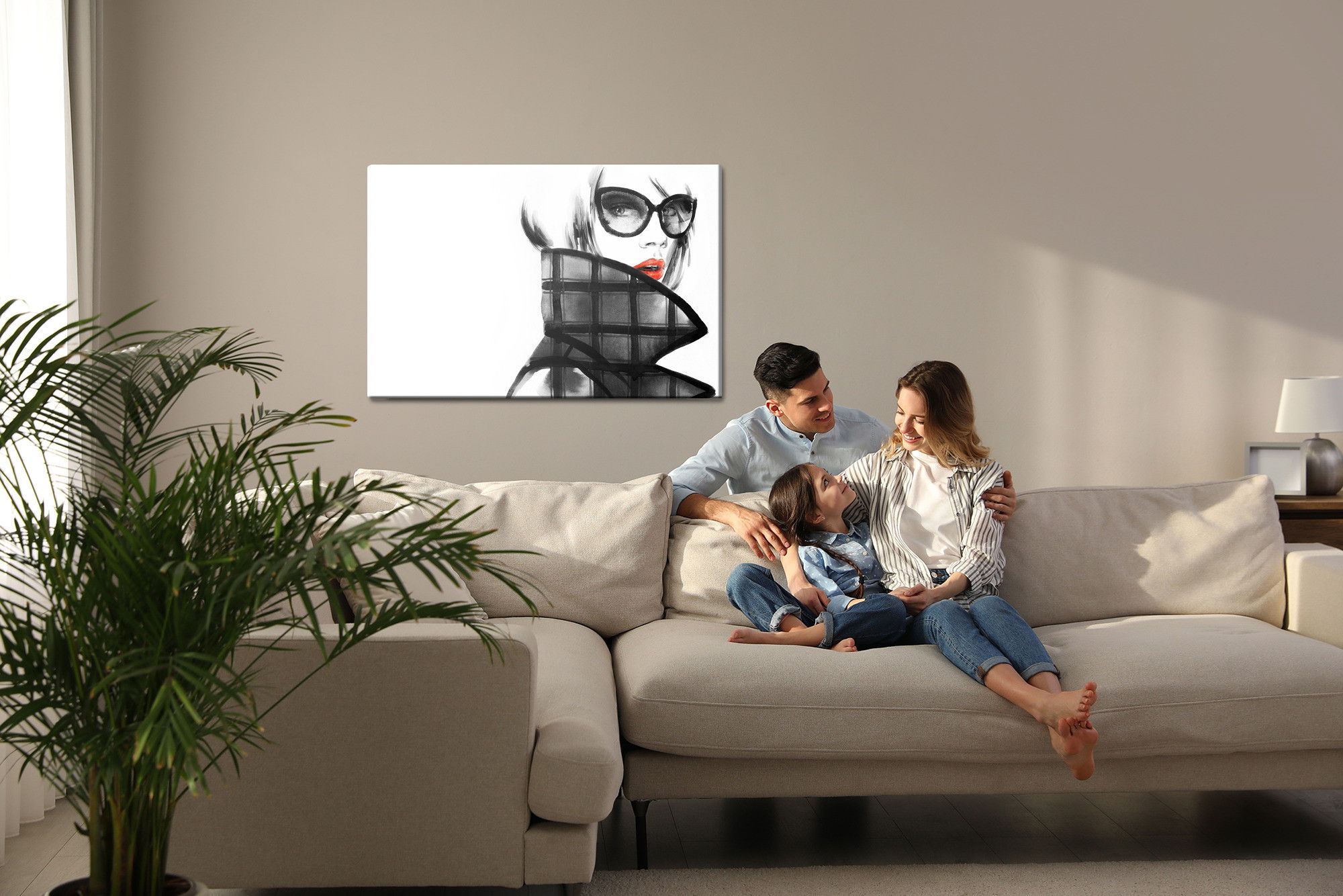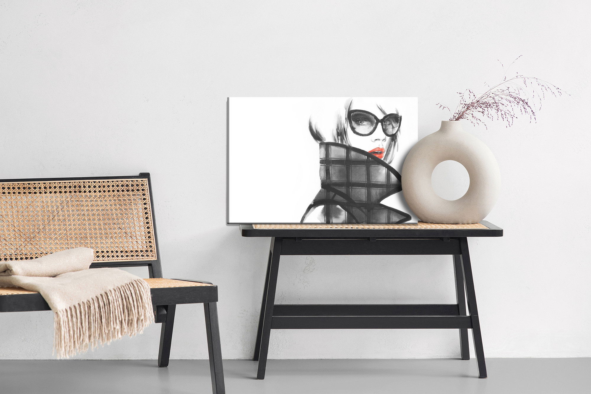 Varje tavla monteras på en massiv fururam. Format upp till 70×50 cm har en ram på 15 mm, medan format från 90×60 cm och uppåt har en ram på 20 mm. Den exakta dukspänningen gör att tavlan håller sin form över tid. Motivet Stylish female portrait trycks runt hela ramen vilket ger ett stilrent galleriuttryck där tavlan är lika vacker från sidan som framifrån. Kombinationen av rak dukspänning, rena linjer och korrekt tryck ger en professionell finish.