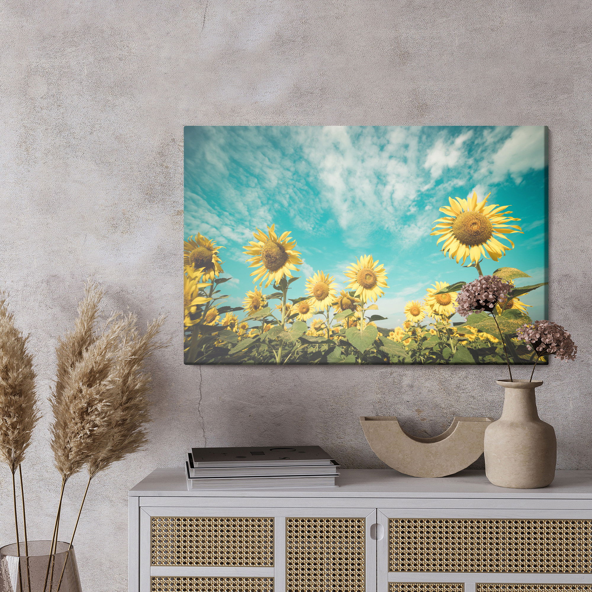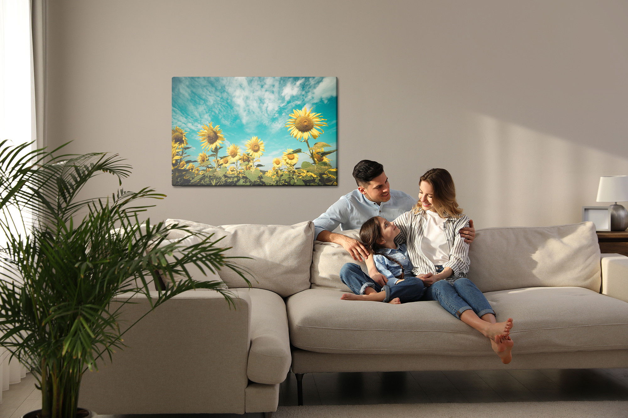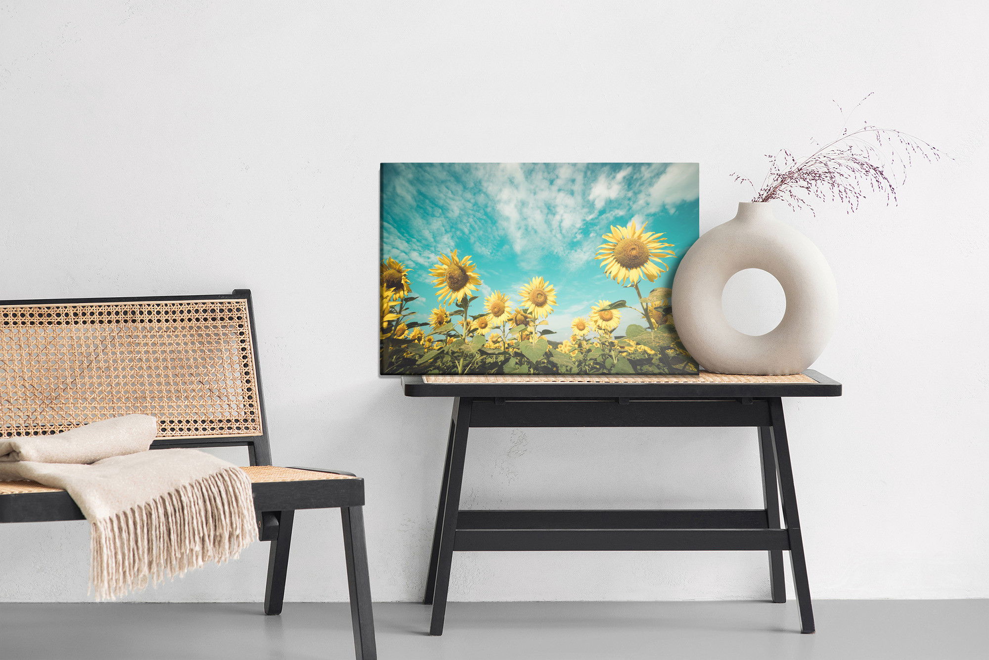 Varje tavla monteras på en massiv fururam. Format upp till 70×50 cm har en ram på 15 mm, medan format från 90×60 cm och uppåt har en ram på 20 mm. Den exakta dukspänningen gör att tavlan håller sin form över tid. Motivet Sunflower field against trycks runt hela ramen vilket ger ett stilrent galleriuttryck där tavlan är lika vacker från sidan som framifrån. Kombinationen av rak dukspänning, rena linjer och korrekt tryck ger en professionell finish.