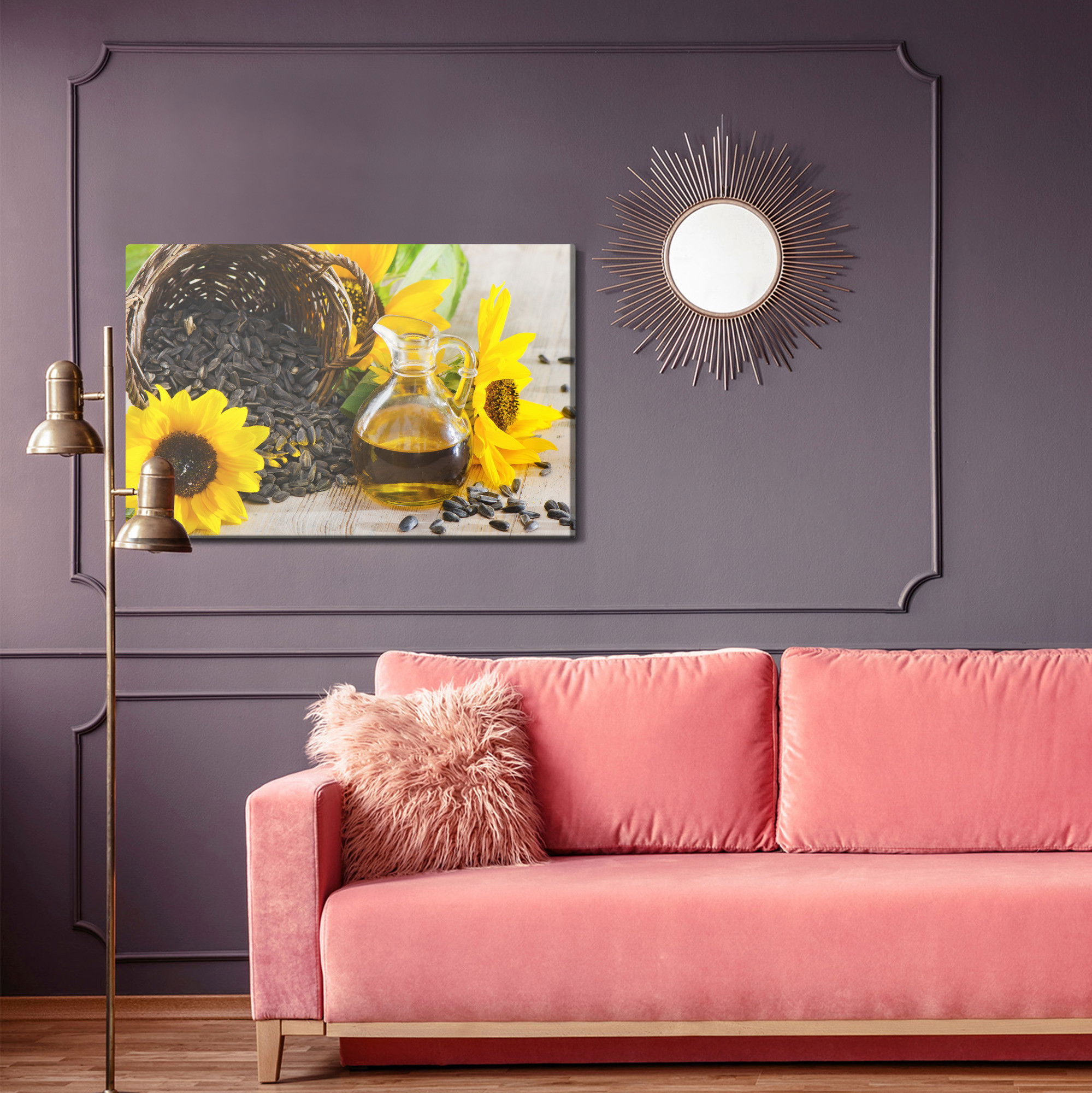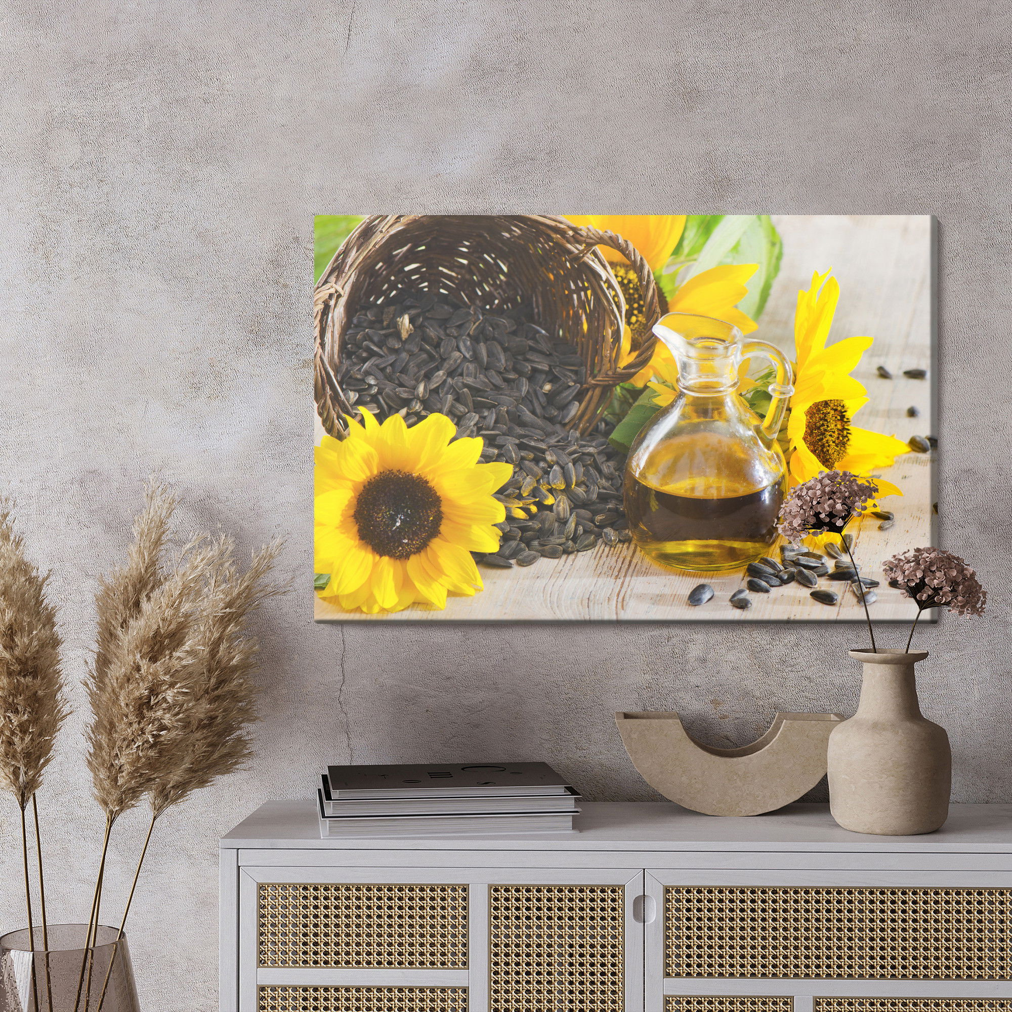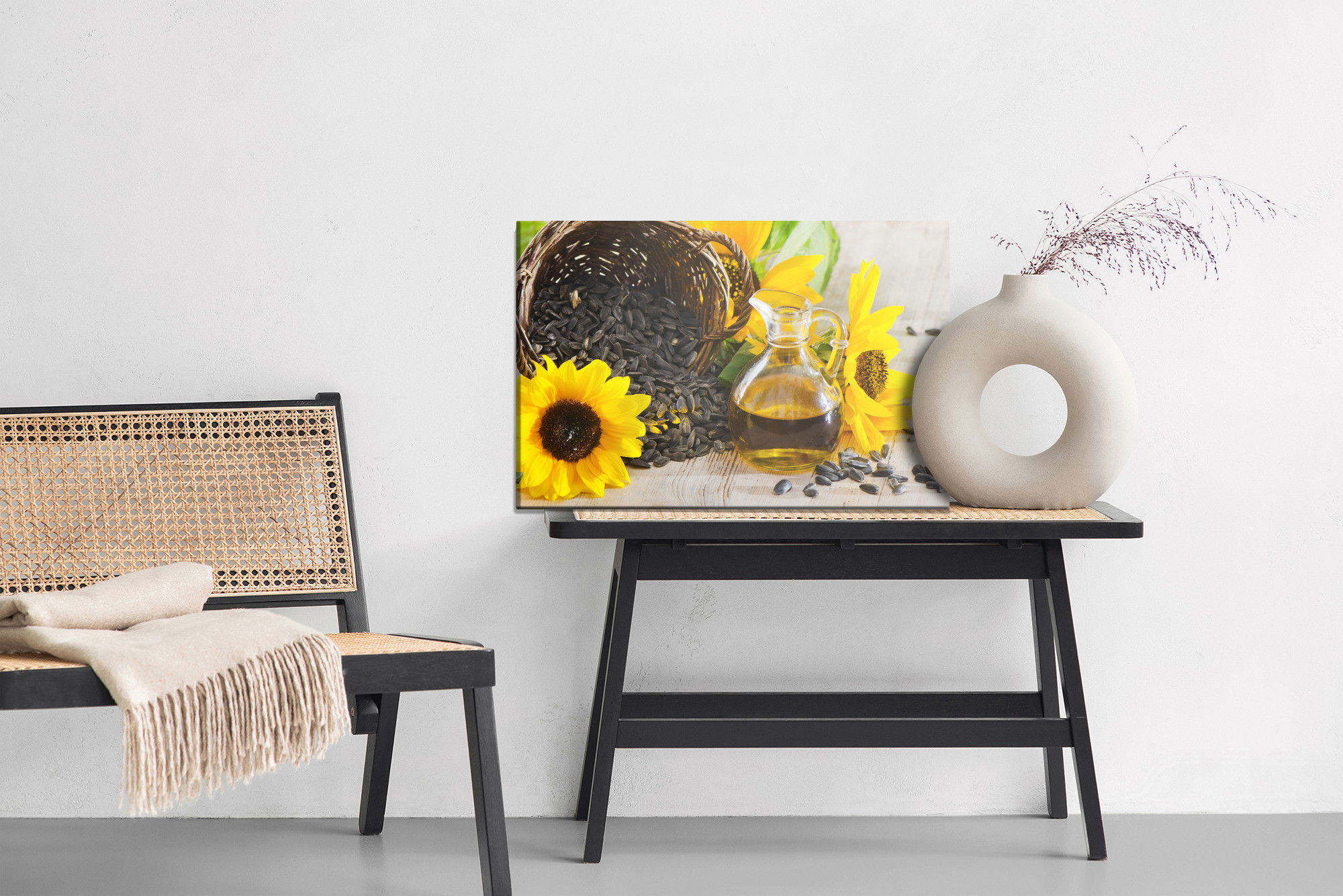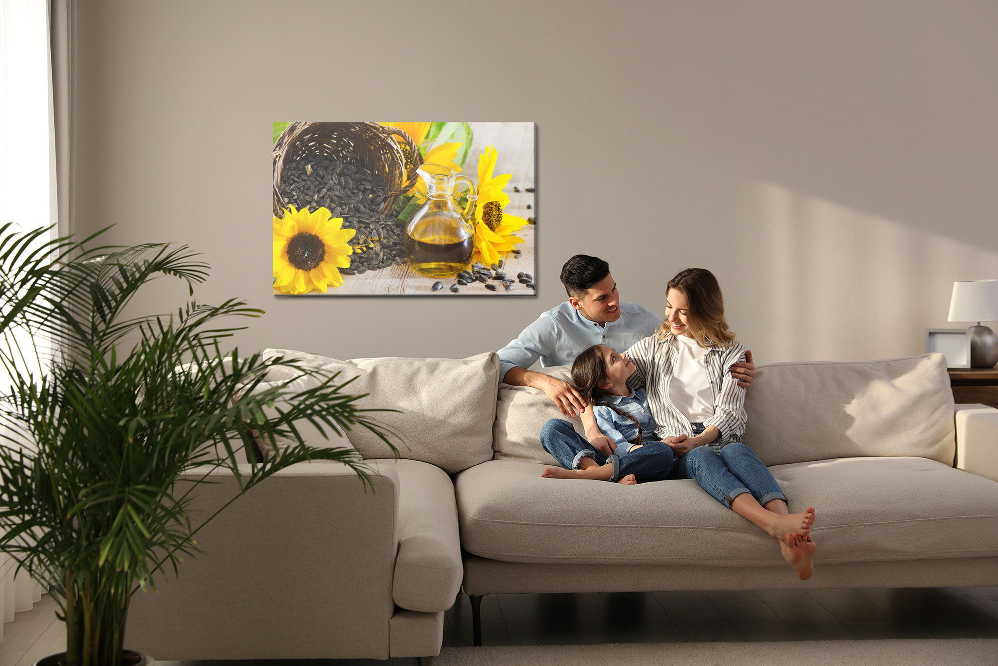 Motivet Sunflower seeds and oil återges med hög färgprecision och detaljrikedom tack vare HP Latex-teknologi. Trycket sker med vattenbaserade, luktfria och GREENGUARD Gold-certifierade bläck som ger en upplösning på upp till 300 DPI. Färgerna är UV-beständiga och behåller sin styrka även i ljusa rum, vilket gör tavlan lämplig för både hem- och offentliga miljöer.
