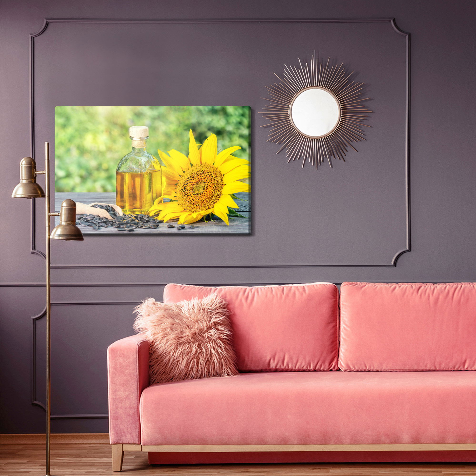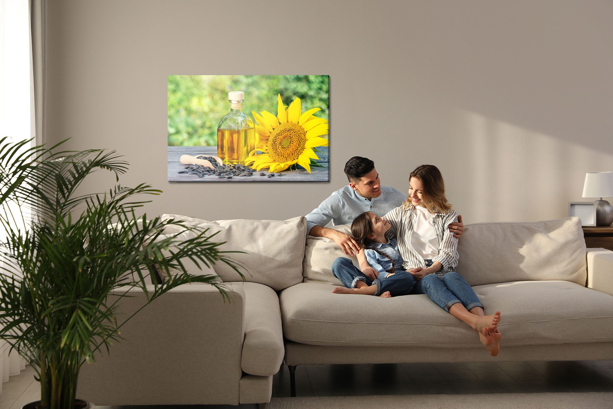 Motivet Sunflower with cores and oil återges med hög färgprecision och detaljrikedom tack vare HP Latex-teknologi. Trycket sker med vattenbaserade, luktfria och GREENGUARD Gold-certifierade bläck som ger en upplösning på upp till 300 DPI. Färgerna är UV-beständiga och behåller sin styrka även i ljusa rum, vilket gör tavlan lämplig för både hem- och offentliga miljöer.