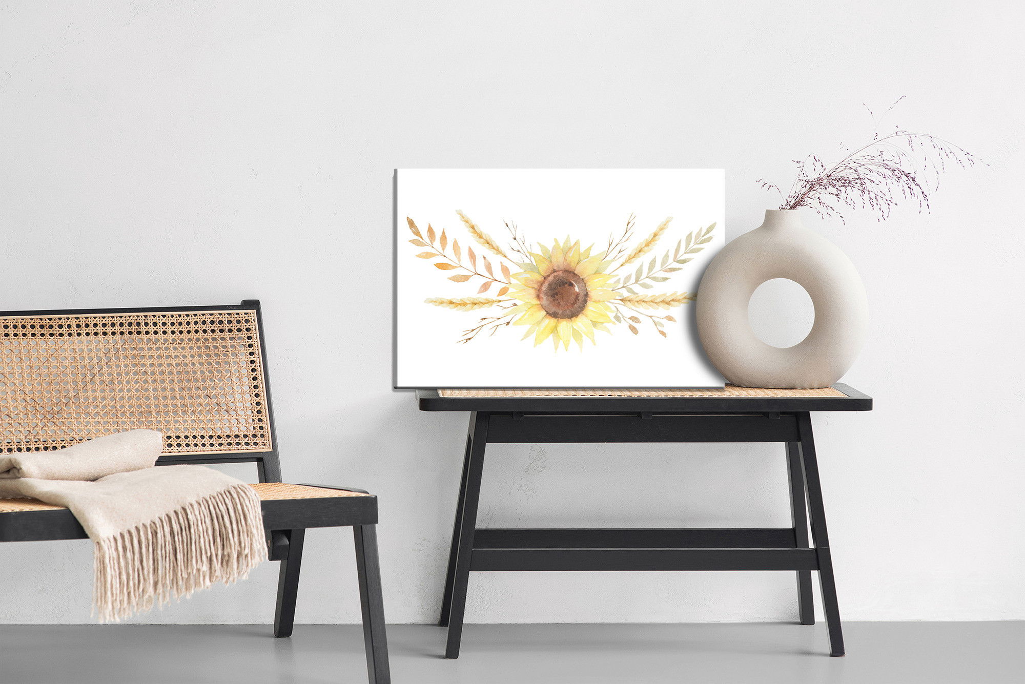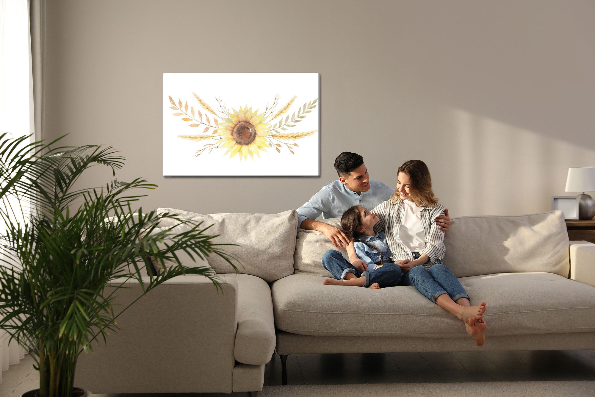 Varje tavla monteras på en massiv fururam. Format upp till 70×50 cm har en ram på 15 mm, medan format från 90×60 cm och uppåt har en ram på 20 mm. Den exakta dukspänningen gör att tavlan håller sin form över tid. Motivet Sunflower with leaves trycks runt hela ramen vilket ger ett stilrent galleriuttryck där tavlan är lika vacker från sidan som framifrån. Kombinationen av rak dukspänning, rena linjer och korrekt tryck ger en professionell finish.