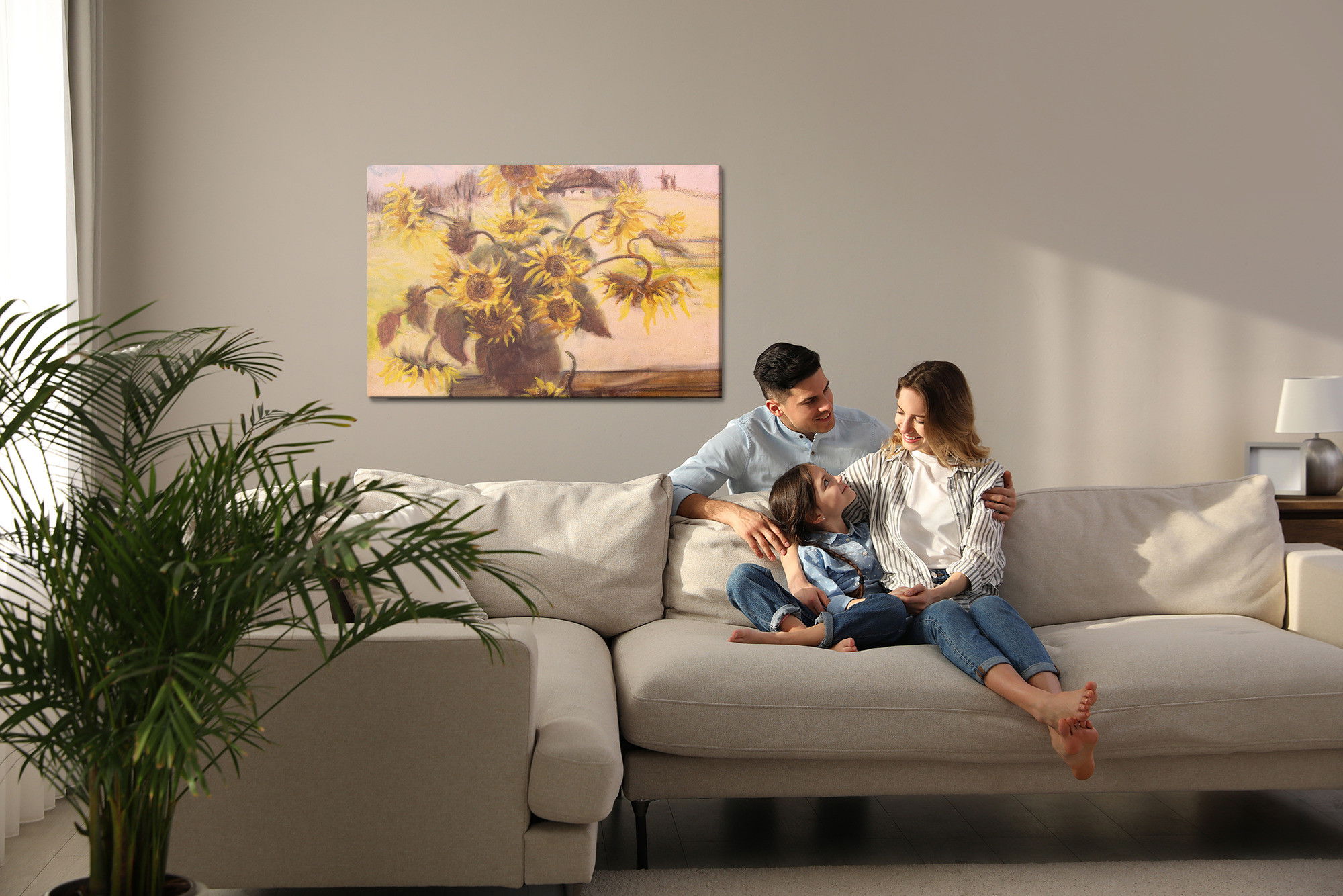 Motivet Sunflowers in a vase as återges med hög färgprecision och detaljrikedom tack vare HP Latex-teknologi. Trycket sker med vattenbaserade, luktfria och GREENGUARD Gold-certifierade bläck som ger en upplösning på upp till 300 DPI. Färgerna är UV-beständiga och behåller sin styrka även i ljusa rum, vilket gör tavlan lämplig för både hem- och offentliga miljöer.