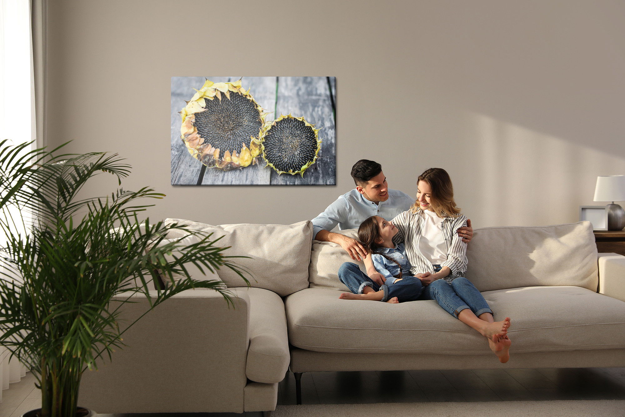 Motivet Sunflowers on the background återges med hög färgprecision och detaljrikedom tack vare HP Latex-teknologi. Trycket sker med vattenbaserade, luktfria och GREENGUARD Gold-certifierade bläck som ger en upplösning på upp till 300 DPI. Färgerna är UV-beständiga och behåller sin styrka även i ljusa rum, vilket gör tavlan lämplig för både hem- och offentliga miljöer.