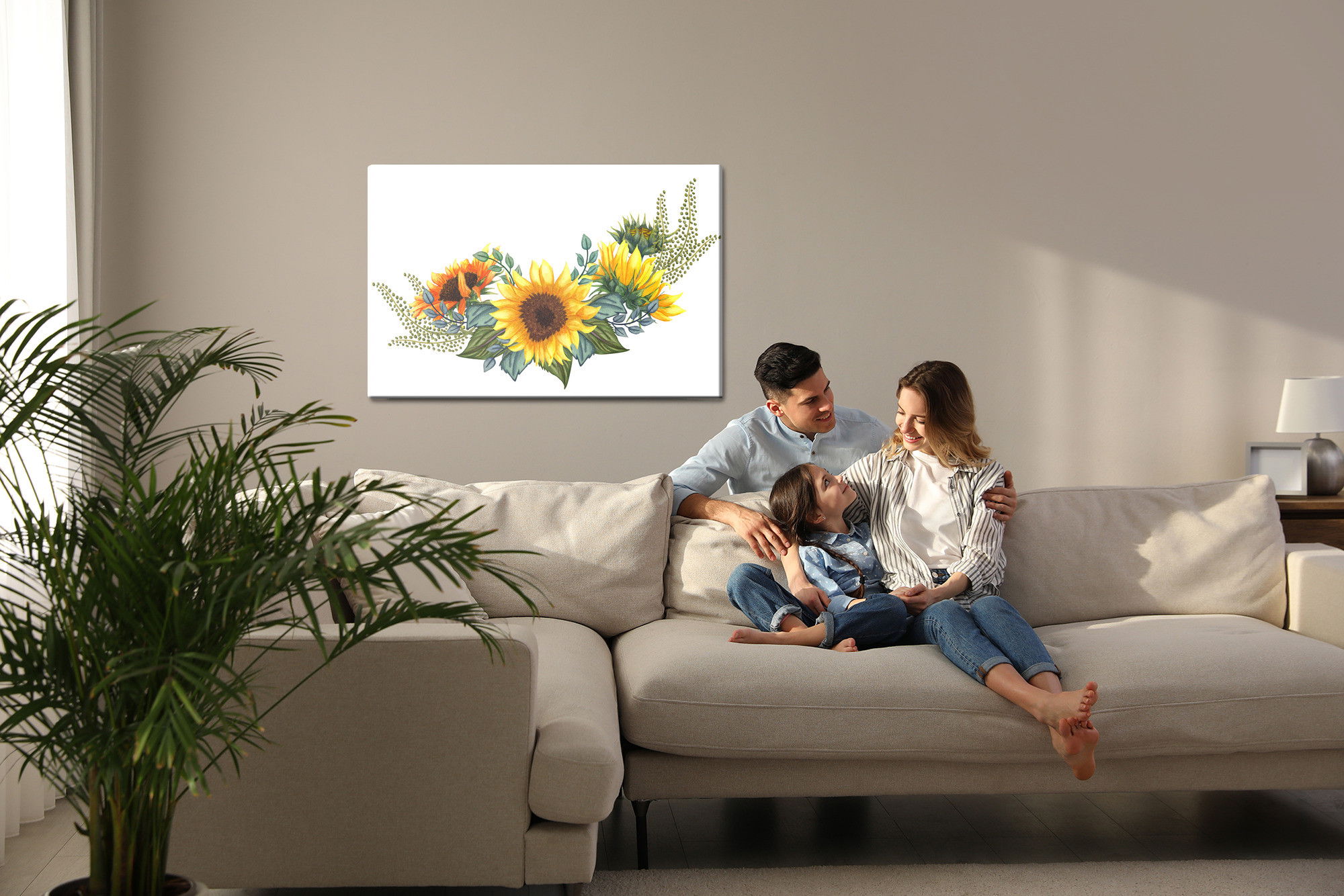 Motivet Sunflowers with leaves återges med hög färgprecision och detaljrikedom tack vare HP Latex-teknologi. Trycket sker med vattenbaserade, luktfria och GREENGUARD Gold-certifierade bläck som ger en upplösning på upp till 300 DPI. Färgerna är UV-beständiga och behåller sin styrka även i ljusa rum, vilket gör tavlan lämplig för både hem- och offentliga miljöer.
