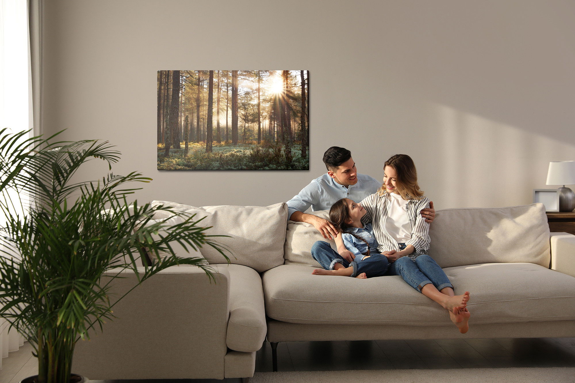 Varje tavla monteras på en massiv fururam. Format upp till 70×50 cm har en ram på 15 mm, medan format från 90×60 cm och uppåt har en ram på 20 mm. Den exakta dukspänningen gör att tavlan håller sin form över tid. Motivet Sunrise in the coniferous trycks runt hela ramen vilket ger ett stilrent galleriuttryck där tavlan är lika vacker från sidan som framifrån. Kombinationen av rak dukspänning, rena linjer och korrekt tryck ger en professionell finish.