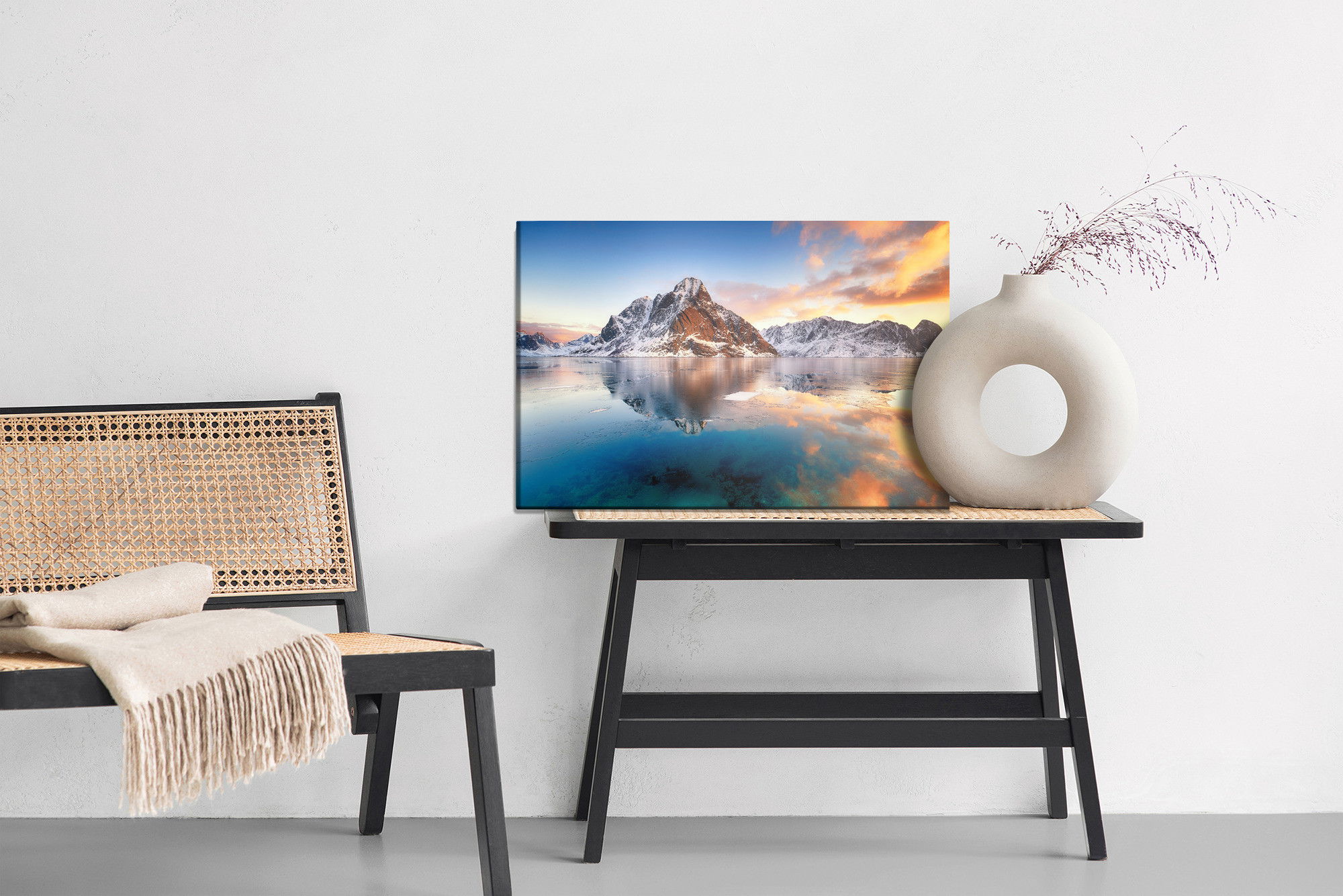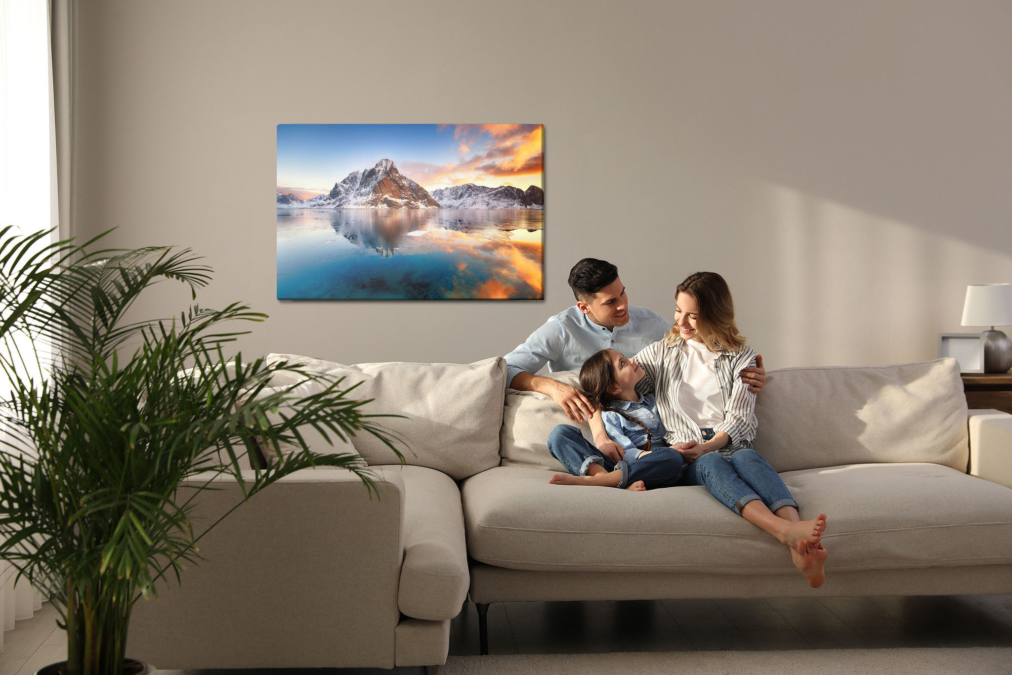 Varje tavla monteras på en massiv fururam. Format upp till 70×50 cm har en ram på 15 mm, medan format från 90×60 cm och uppåt har en ram på 20 mm. Den exakta dukspänningen gör att tavlan håller sin form över tid. Motivet Sunrise over the norwegian trycks runt hela ramen vilket ger ett stilrent galleriuttryck där tavlan är lika vacker från sidan som framifrån. Kombinationen av rak dukspänning, rena linjer och korrekt tryck ger en professionell finish.