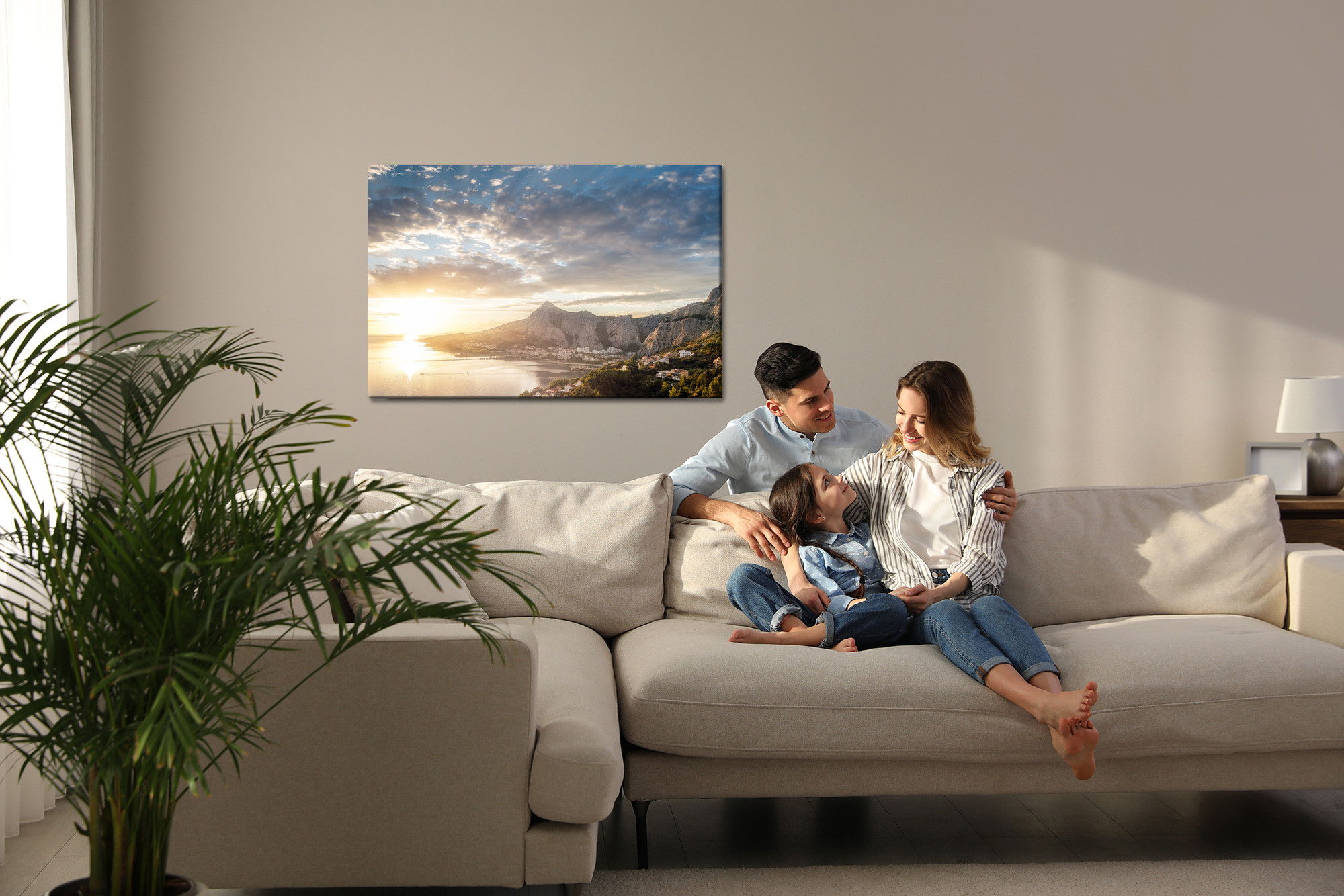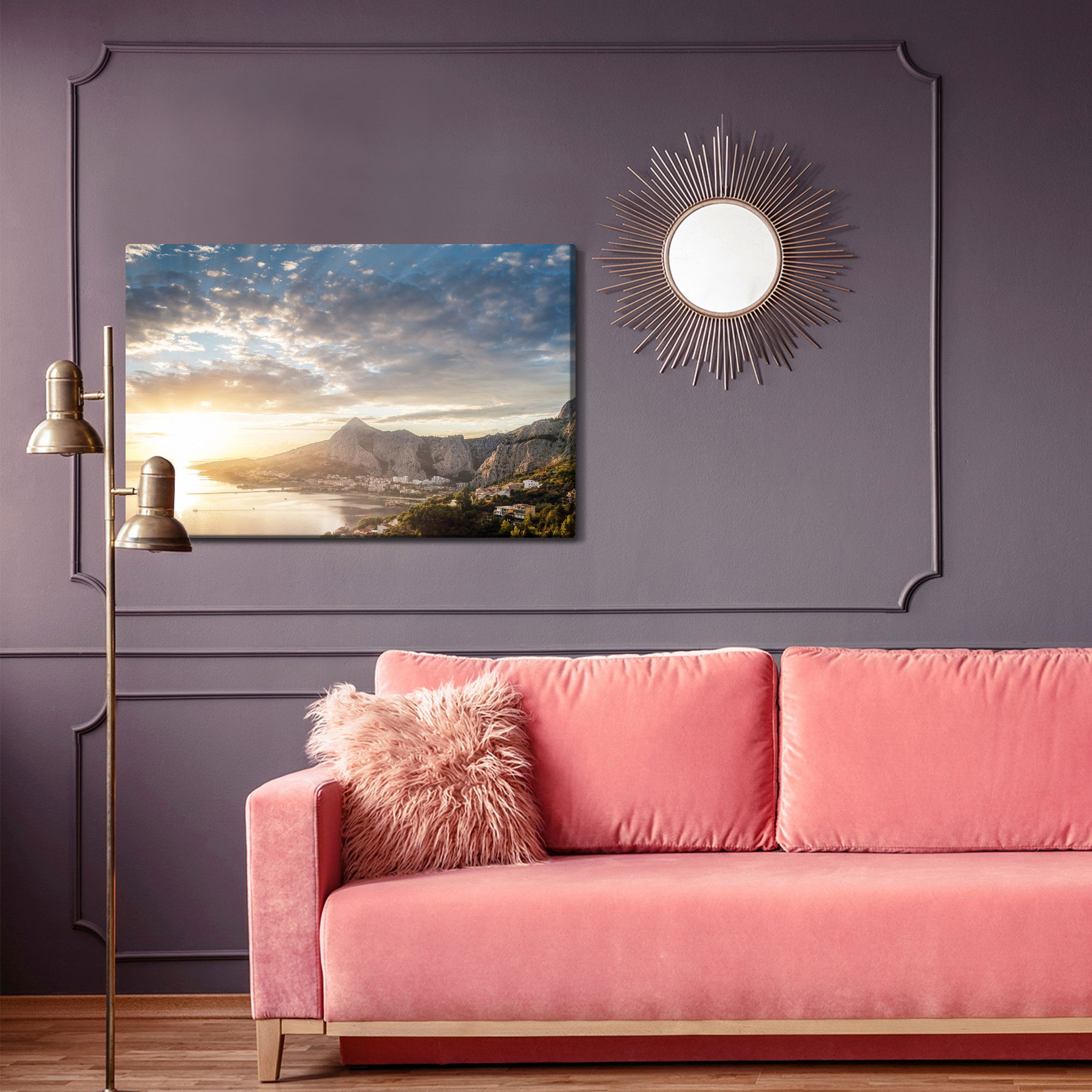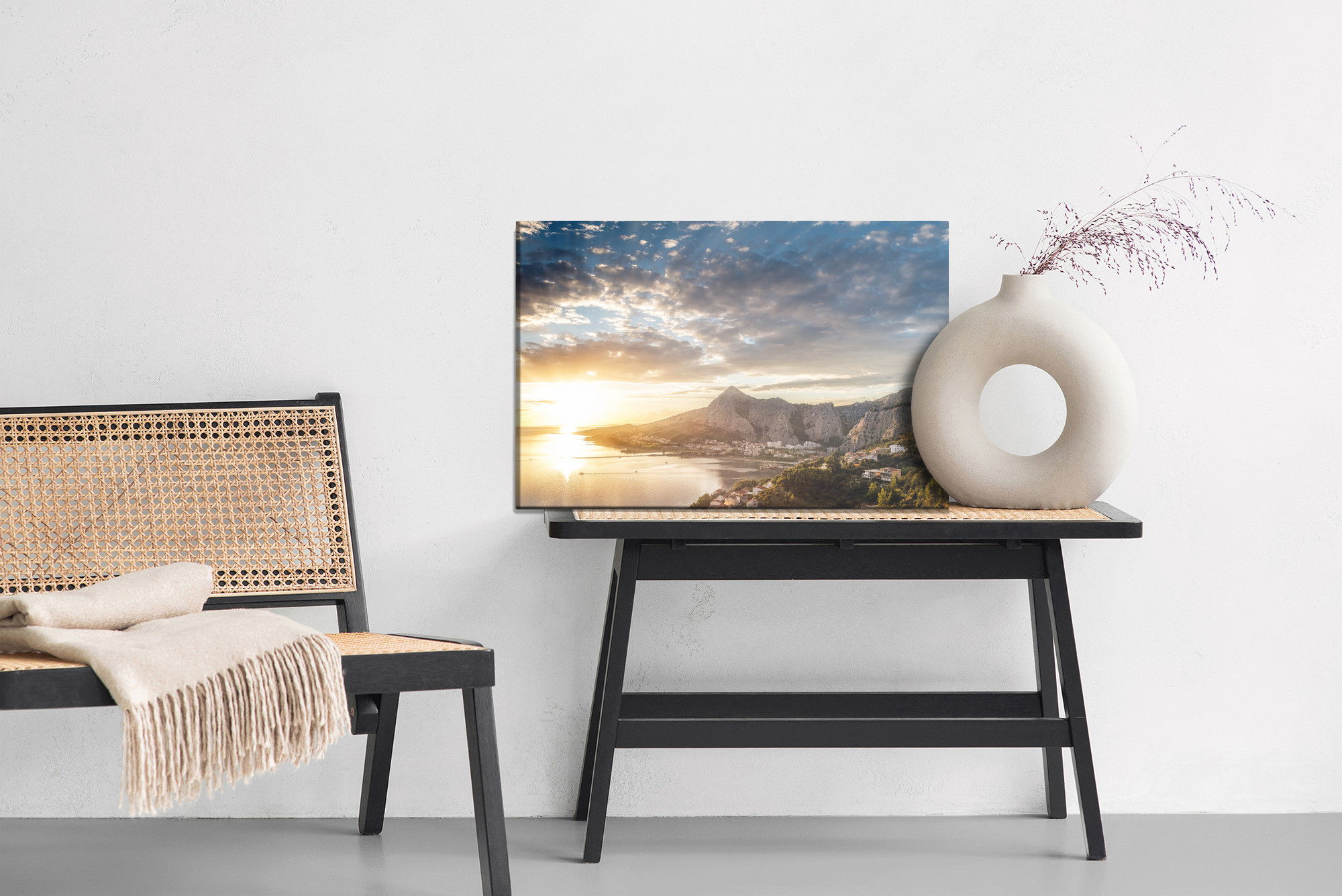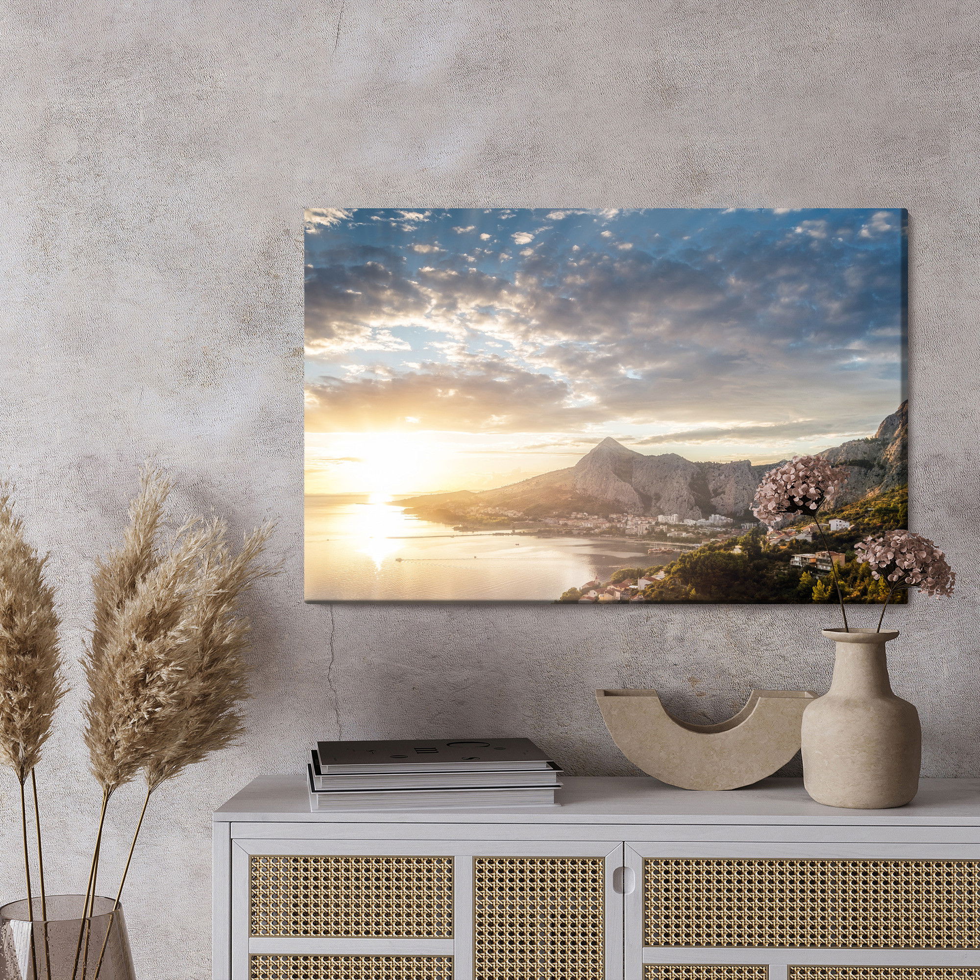 Varje tavla monteras på en massiv fururam. Format upp till 70×50 cm har en ram på 15 mm, medan format från 90×60 cm och uppåt har en ram på 20 mm. Den exakta dukspänningen gör att tavlan håller sin form över tid. Motivet Sunrise over the sea trycks runt hela ramen vilket ger ett stilrent galleriuttryck där tavlan är lika vacker från sidan som framifrån. Kombinationen av rak dukspänning, rena linjer och korrekt tryck ger en professionell finish.