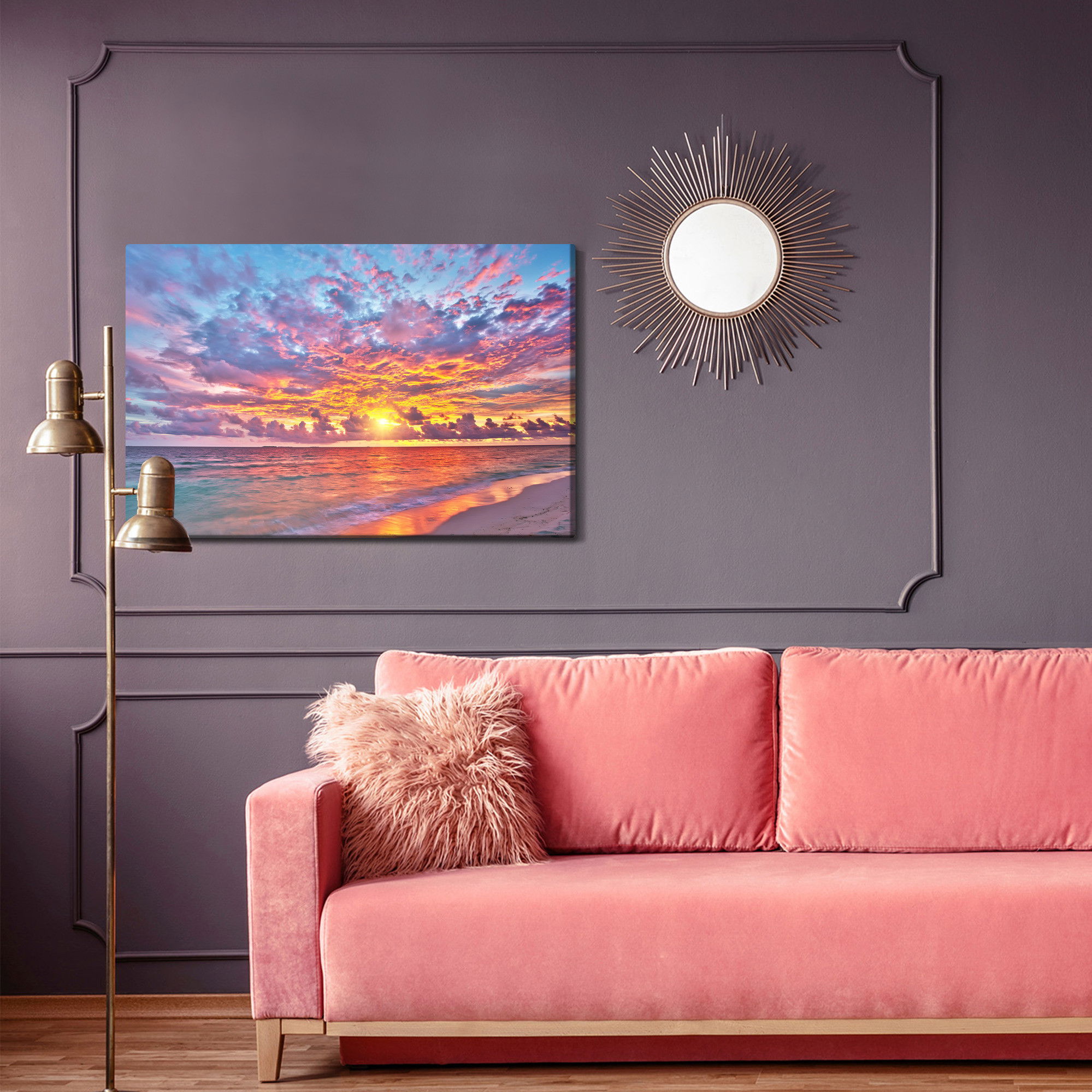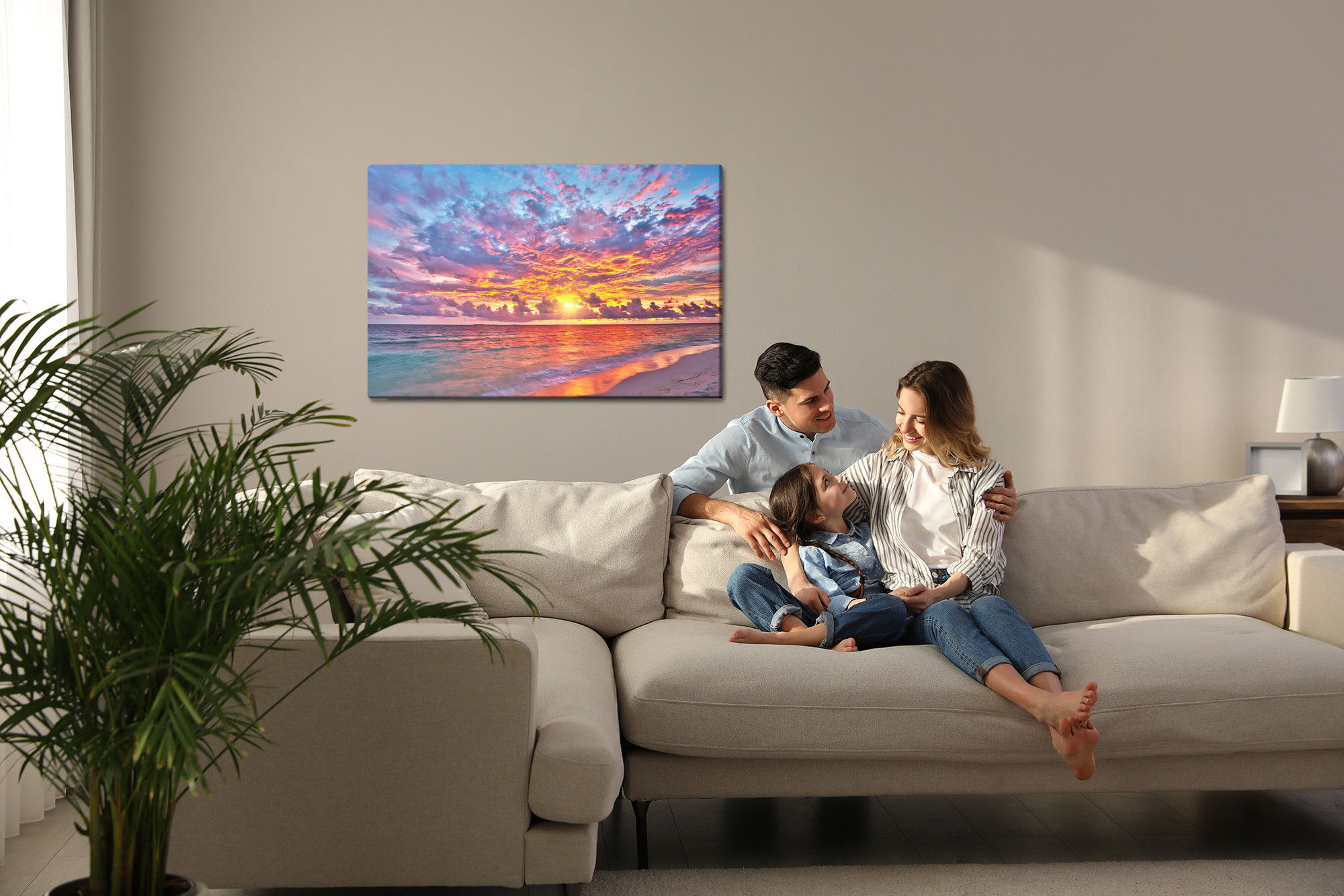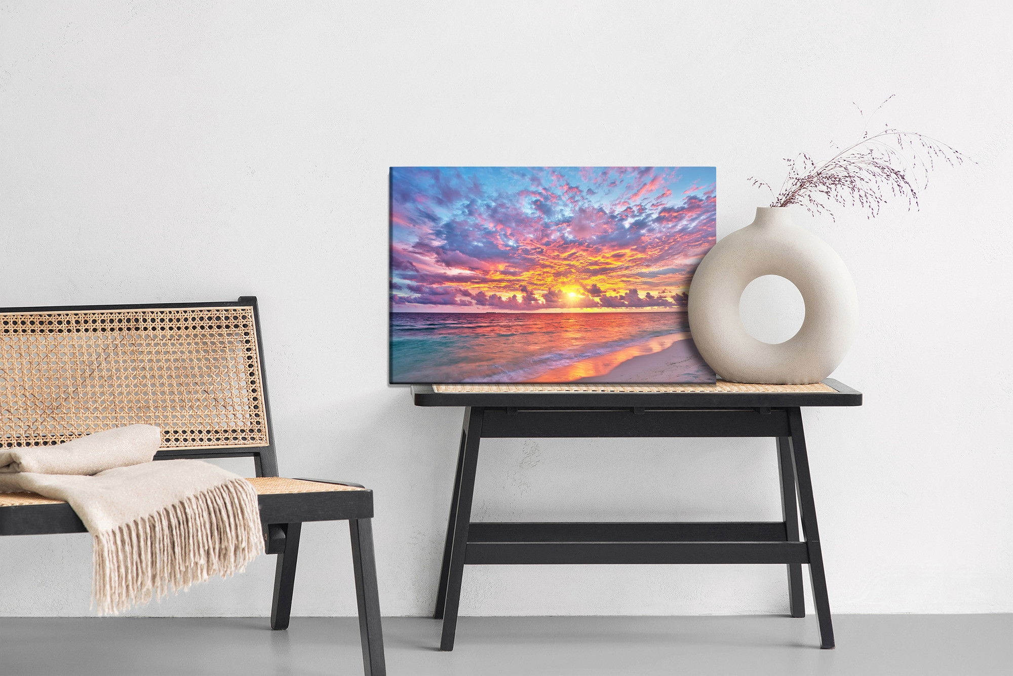 Motivet Sunset by the sea återges med hög färgprecision och detaljrikedom tack vare HP Latex-teknologi. Trycket sker med vattenbaserade, luktfria och GREENGUARD Gold-certifierade bläck som ger en upplösning på upp till 300 DPI. Färgerna är UV-beständiga och behåller sin styrka även i ljusa rum, vilket gör tavlan lämplig för både hem- och offentliga miljöer.