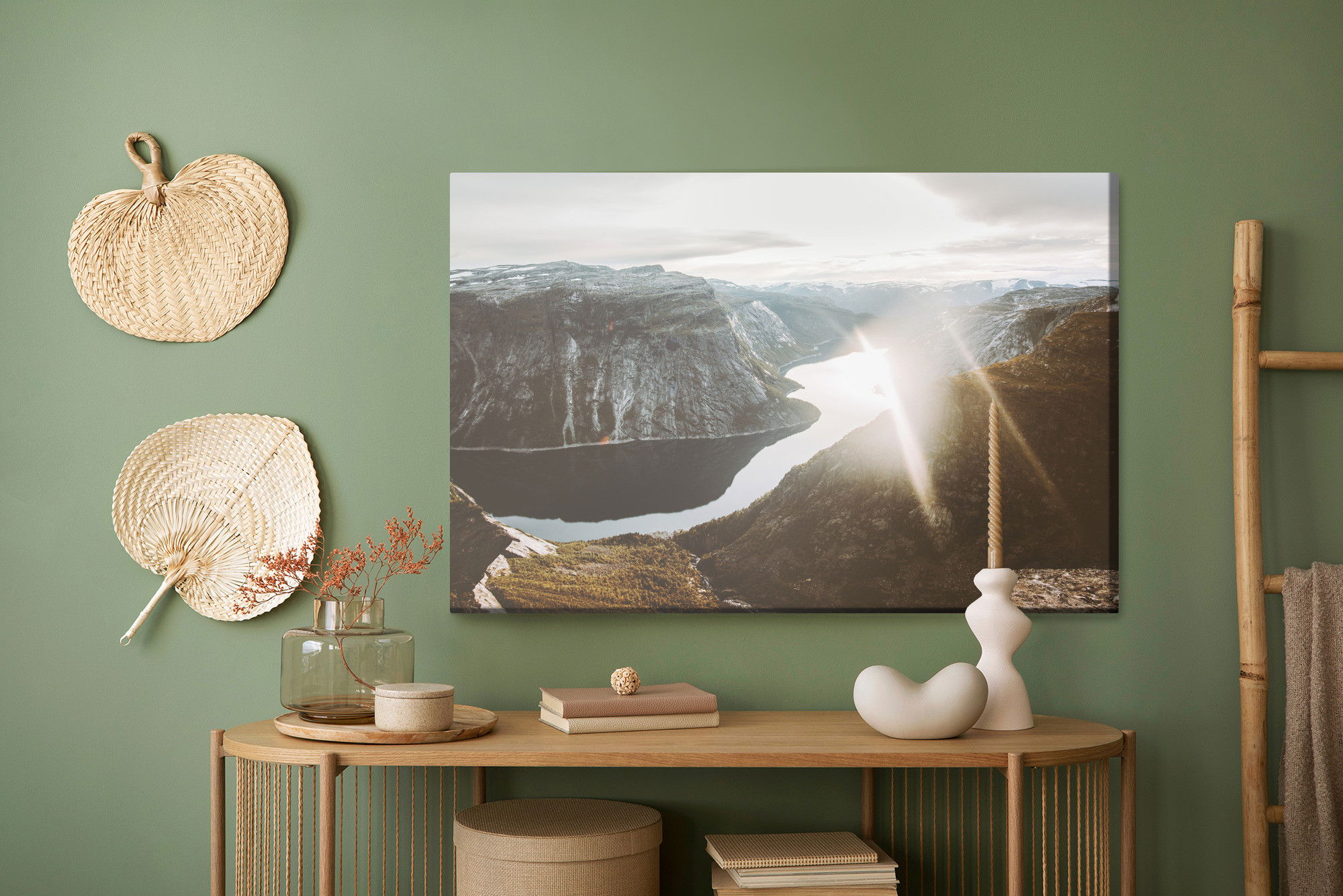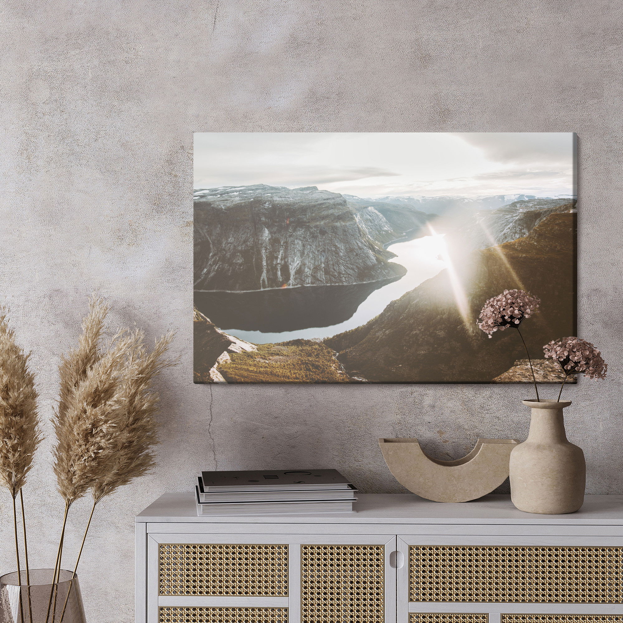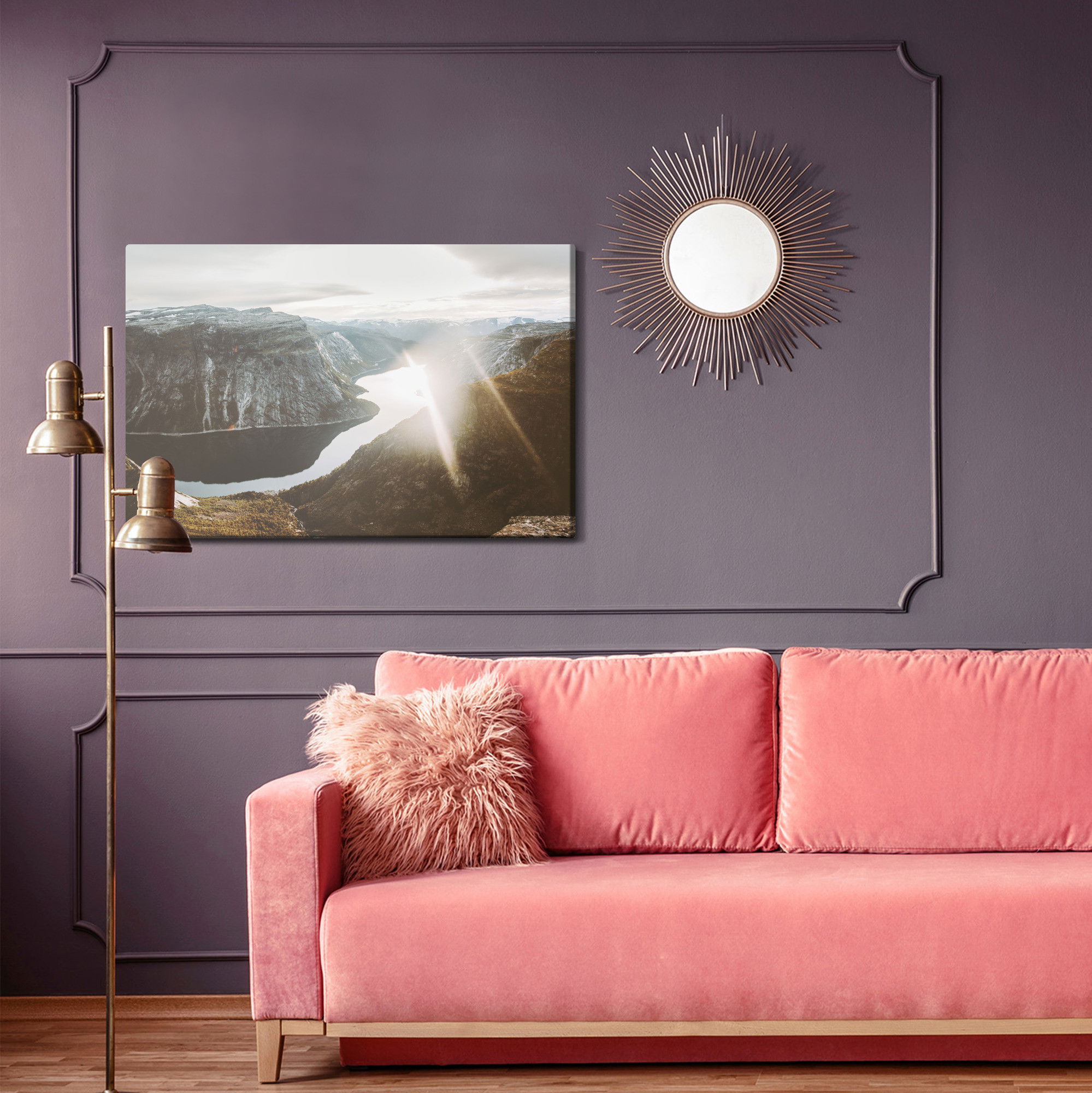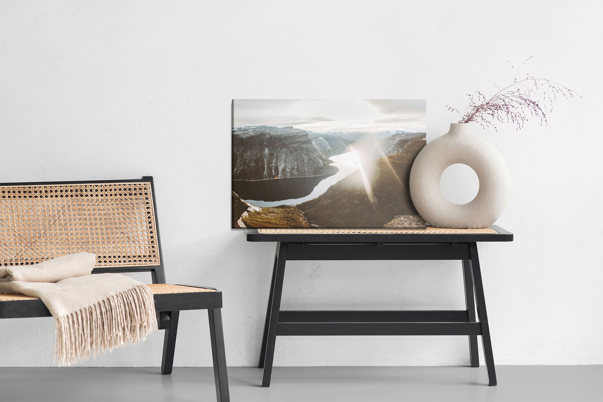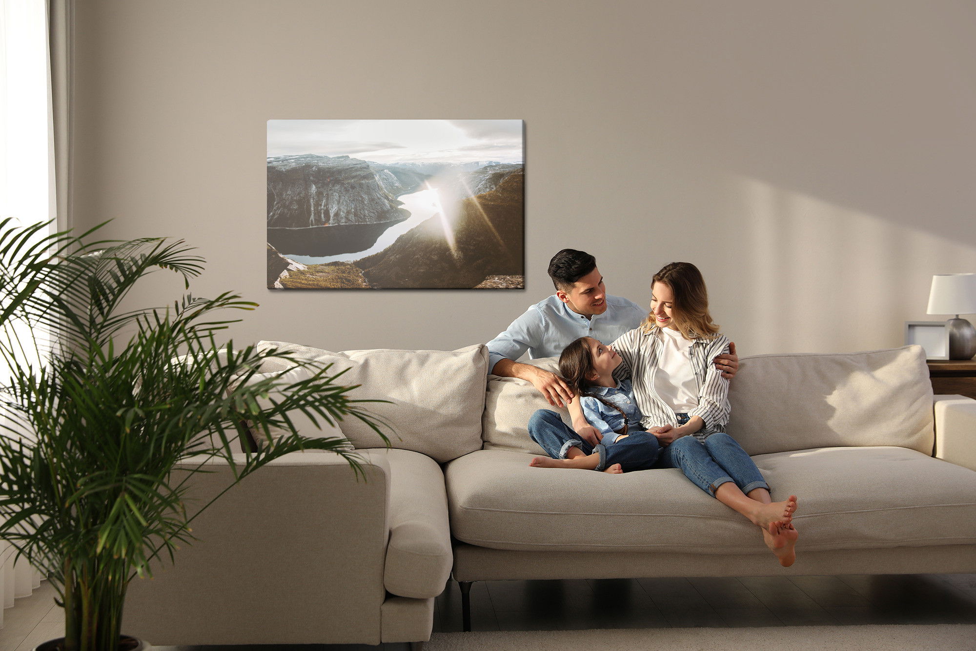 Varje tavla monteras på en massiv fururam. Format upp till 70×50 cm har en ram på 15 mm, medan format från 90×60 cm och uppåt har en ram på 20 mm. Den exakta dukspänningen gör att tavlan håller sin form över tid. Motivet Sunset in the mountains trycks runt hela ramen vilket ger ett stilrent galleriuttryck där tavlan är lika vacker från sidan som framifrån. Kombinationen av rak dukspänning, rena linjer och korrekt tryck ger en professionell finish.