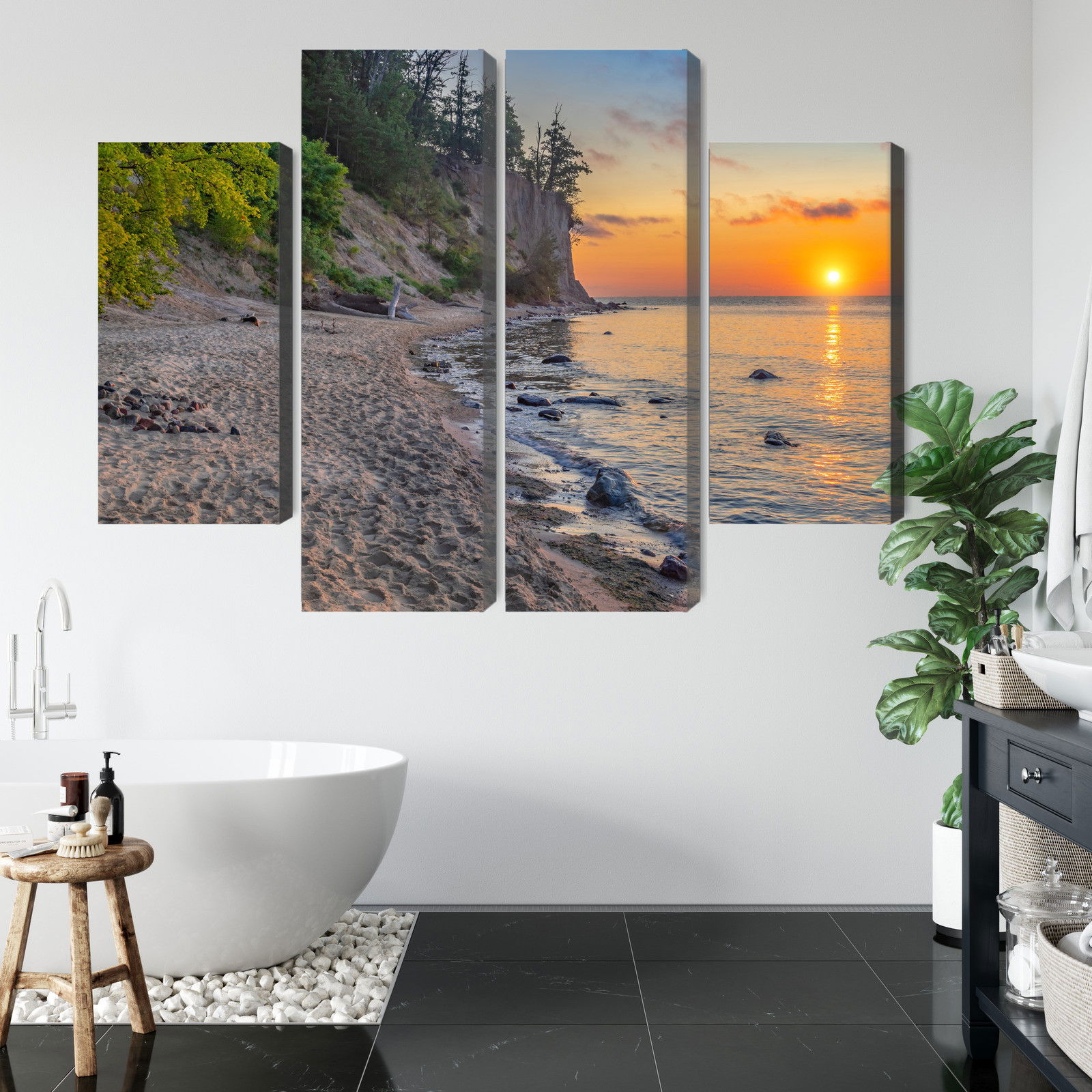 Varje tavla monteras på en massiv fururam. Format upp till 70×50 cm har en ram på 15 mm, medan format från 90×60 cm och uppåt har en ram på 20 mm. Den exakta dukspänningen gör att tavlan håller sin form över tid. Motivet Sunset on the baltic sea trycks runt hela ramen vilket ger ett stilrent galleriuttryck där tavlan är lika vacker från sidan som framifrån. Kombinationen av rak dukspänning, rena linjer och korrekt tryck ger en professionell finish.