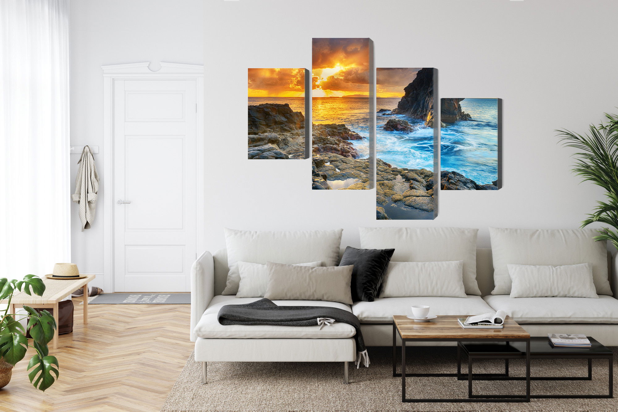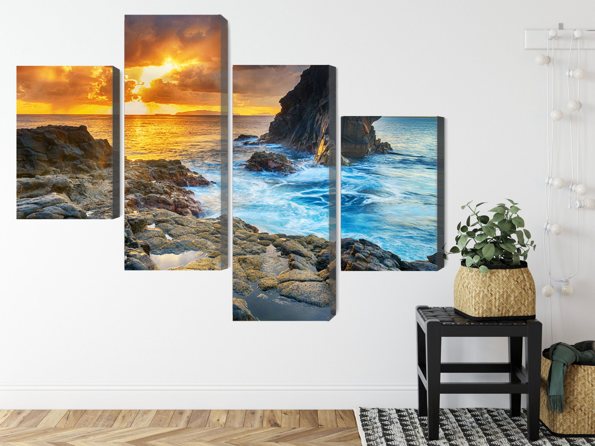 Varje tavla monteras på en massiv fururam. Format upp till 70×50 cm har en ram på 15 mm, medan format från 90×60 cm och uppåt har en ram på 20 mm. Den exakta dukspänningen gör att tavlan håller sin form över tid. Motivet Sunset on the seashore trycks runt hela ramen vilket ger ett stilrent galleriuttryck där tavlan är lika vacker från sidan som framifrån. Kombinationen av rak dukspänning, rena linjer och korrekt tryck ger en professionell finish.