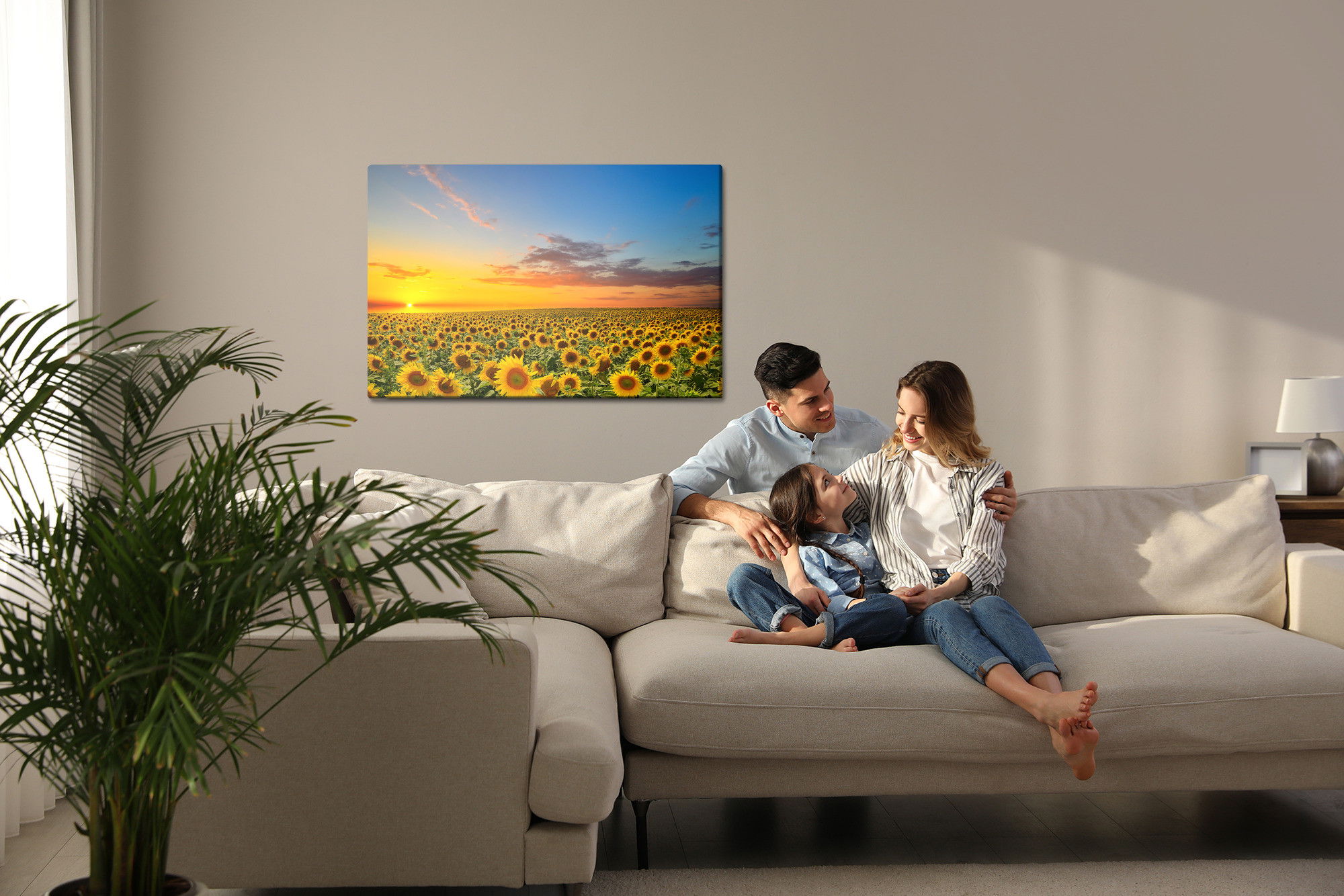 Motivet Sunset over a field återges med hög färgprecision och detaljrikedom tack vare HP Latex-teknologi. Trycket sker med vattenbaserade, luktfria och GREENGUARD Gold-certifierade bläck som ger en upplösning på upp till 300 DPI. Färgerna är UV-beständiga och behåller sin styrka även i ljusa rum, vilket gör tavlan lämplig för både hem- och offentliga miljöer.