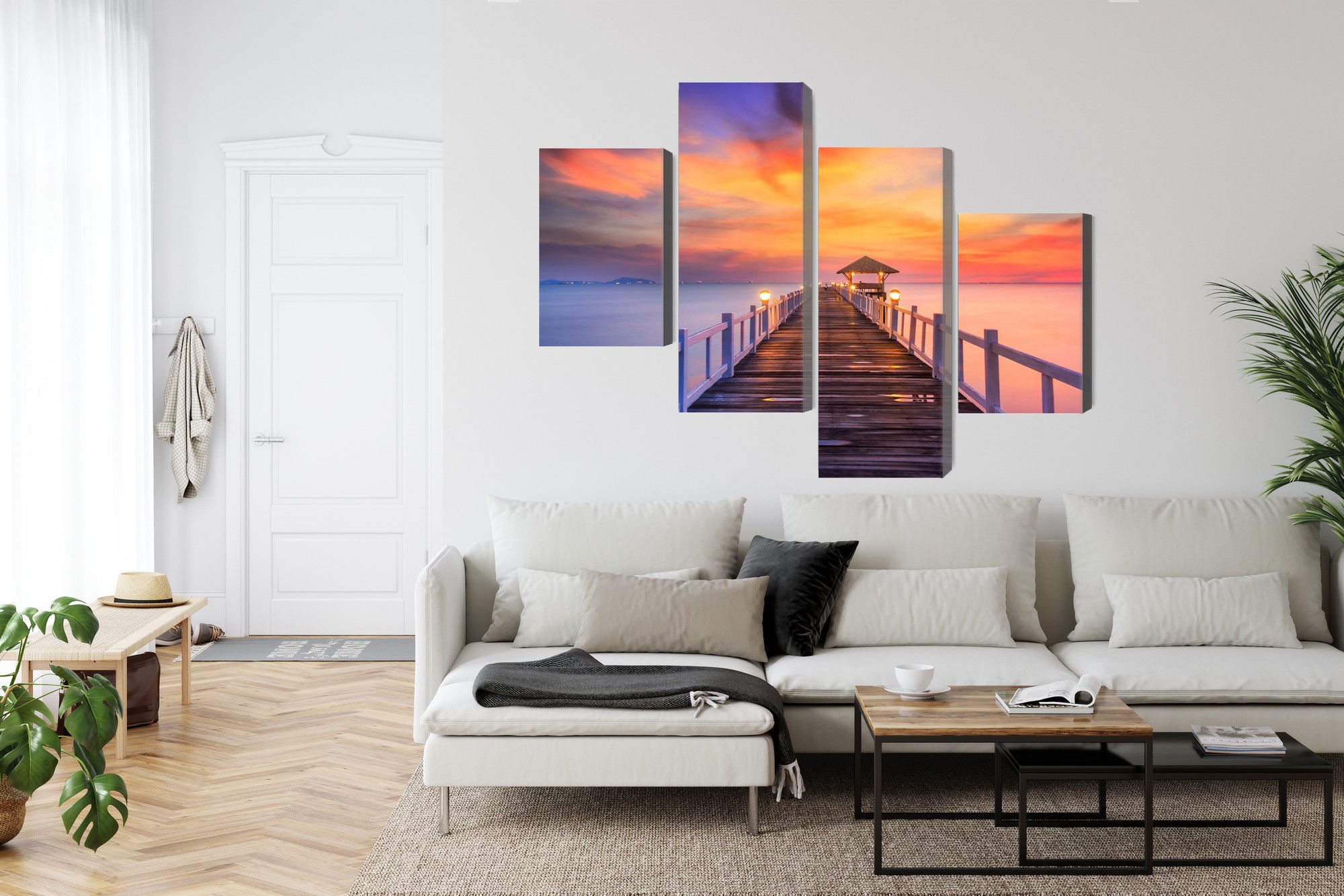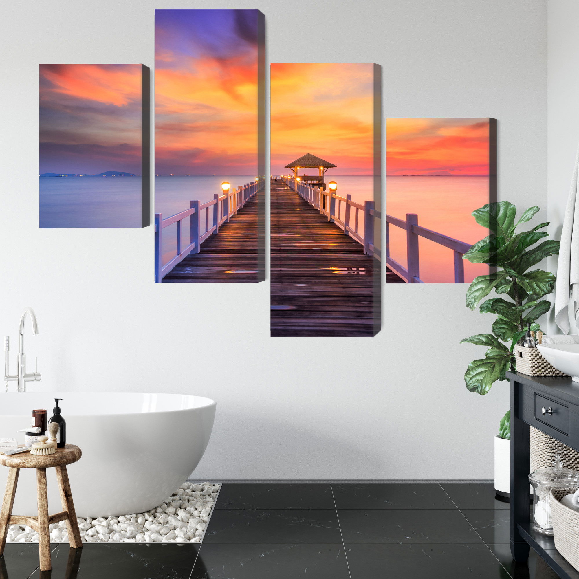 Varje tavla monteras på en massiv fururam. Format upp till 70×50 cm har en ram på 15 mm, medan format från 90×60 cm och uppåt har en ram på 20 mm. Den exakta dukspänningen gör att tavlan håller sin form över tid. Motivet Sunset over the pier trycks runt hela ramen vilket ger ett stilrent galleriuttryck där tavlan är lika vacker från sidan som framifrån. Kombinationen av rak dukspänning, rena linjer och korrekt tryck ger en professionell finish.