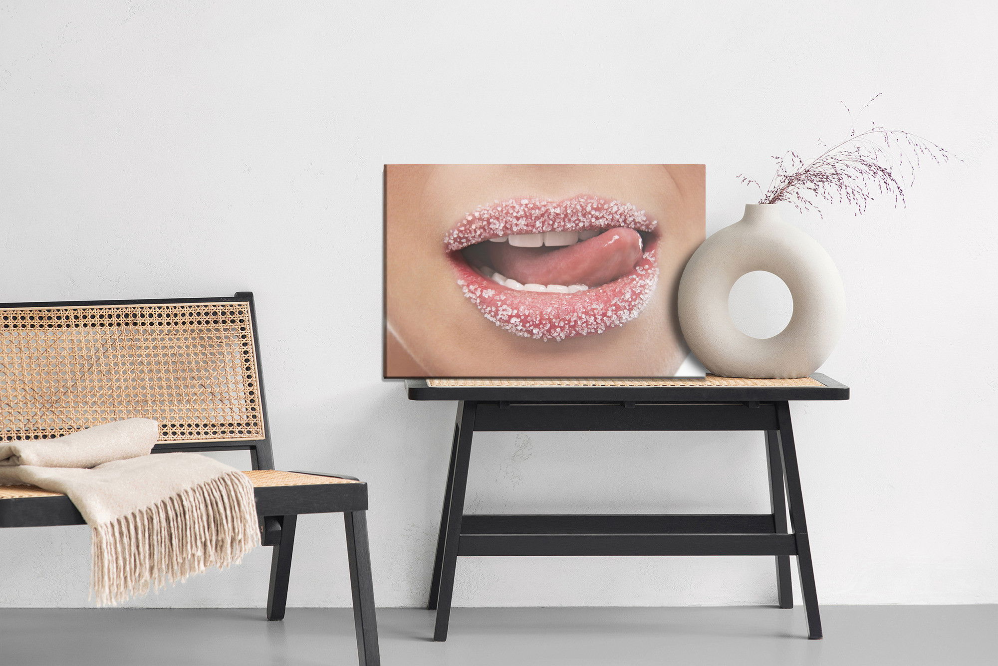 Motivet Sweet lips återges med hög färgprecision och detaljrikedom tack vare HP Latex-teknologi. Trycket sker med vattenbaserade, luktfria och GREENGUARD Gold-certifierade bläck som ger en upplösning på upp till 300 DPI. Färgerna är UV-beständiga och behåller sin styrka även i ljusa rum, vilket gör tavlan lämplig för både hem- och offentliga miljöer.