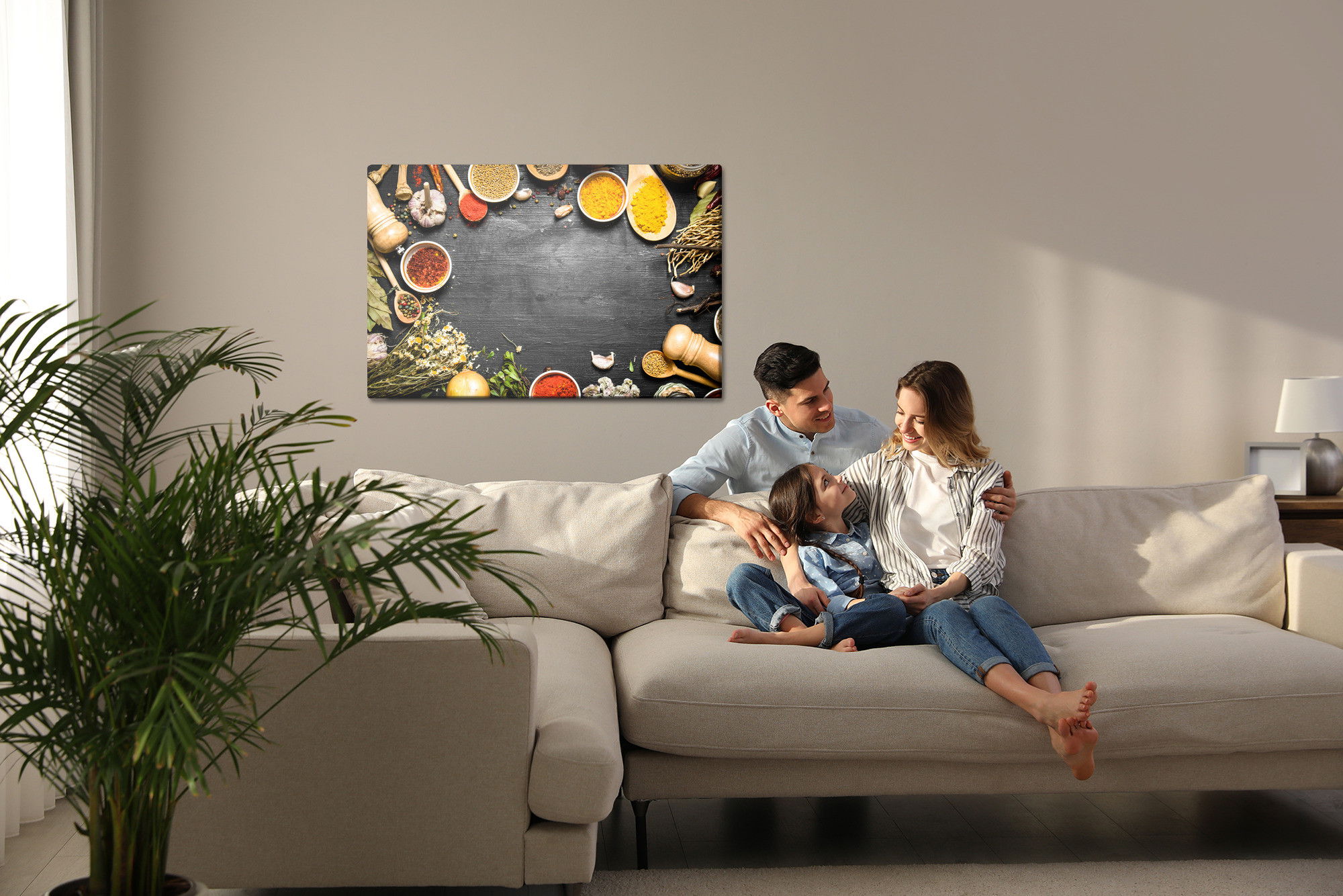 Varje tavla monteras på en massiv fururam. Format upp till 70×50 cm har en ram på 15 mm, medan format från 90×60 cm och uppåt har en ram på 20 mm. Den exakta dukspänningen gör att tavlan håller sin form över tid. Motivet Table with herbs and spices trycks runt hela ramen vilket ger ett stilrent galleriuttryck där tavlan är lika vacker från sidan som framifrån. Kombinationen av rak dukspänning, rena linjer och korrekt tryck ger en professionell finish.