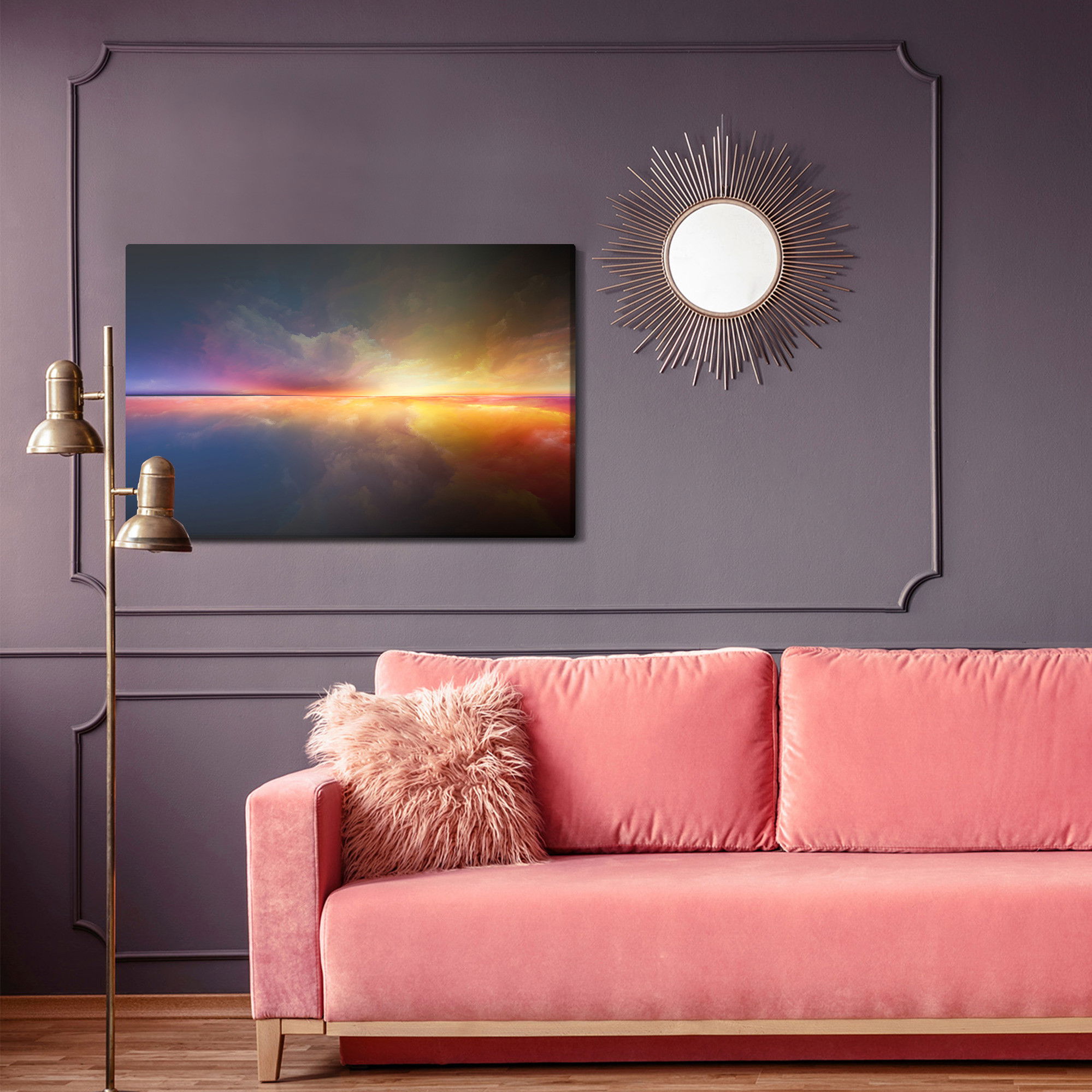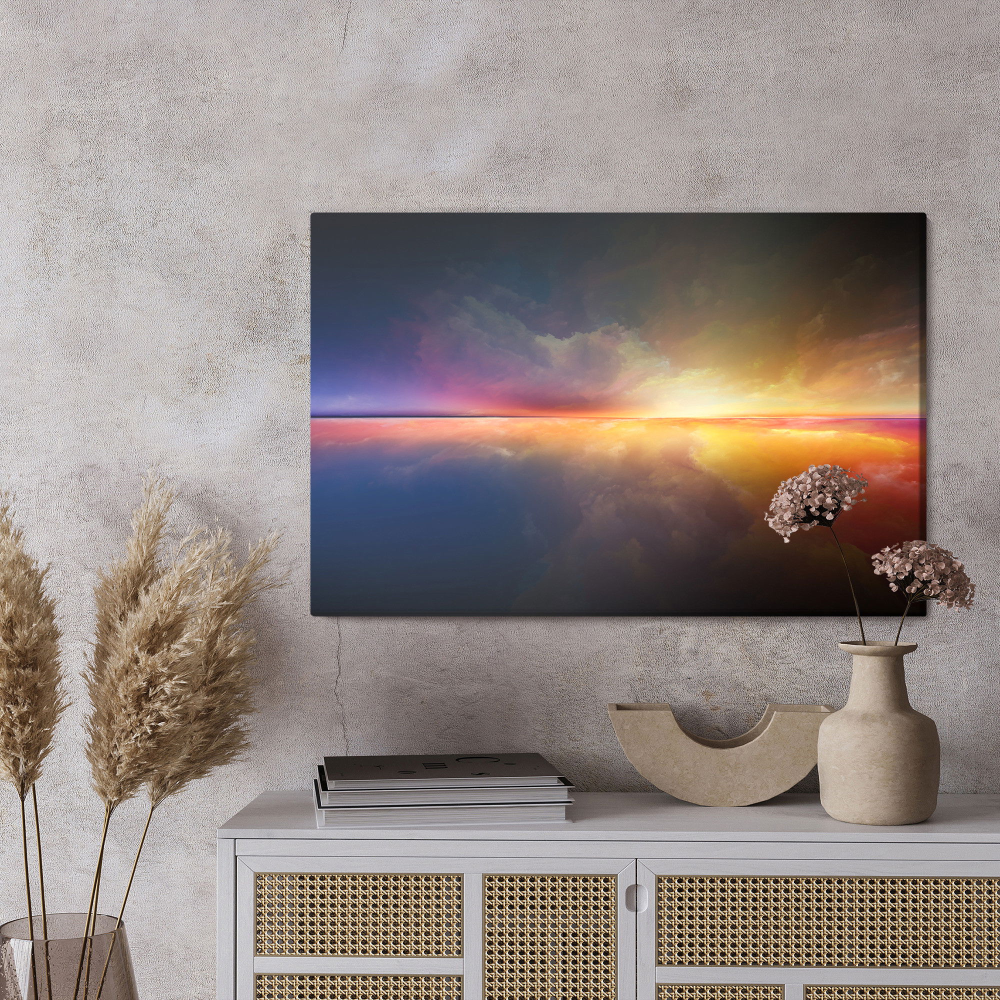 Med en ljuddämpande tavla The abstract horizon från SilentDirect får du en kombination av genomarbetad bildkvalitet och akustiklösning. Tavlan byggs på en canvastavla med fururam där insidan fylls med en kärna av återvunnen polyester som reducerar efterklang.