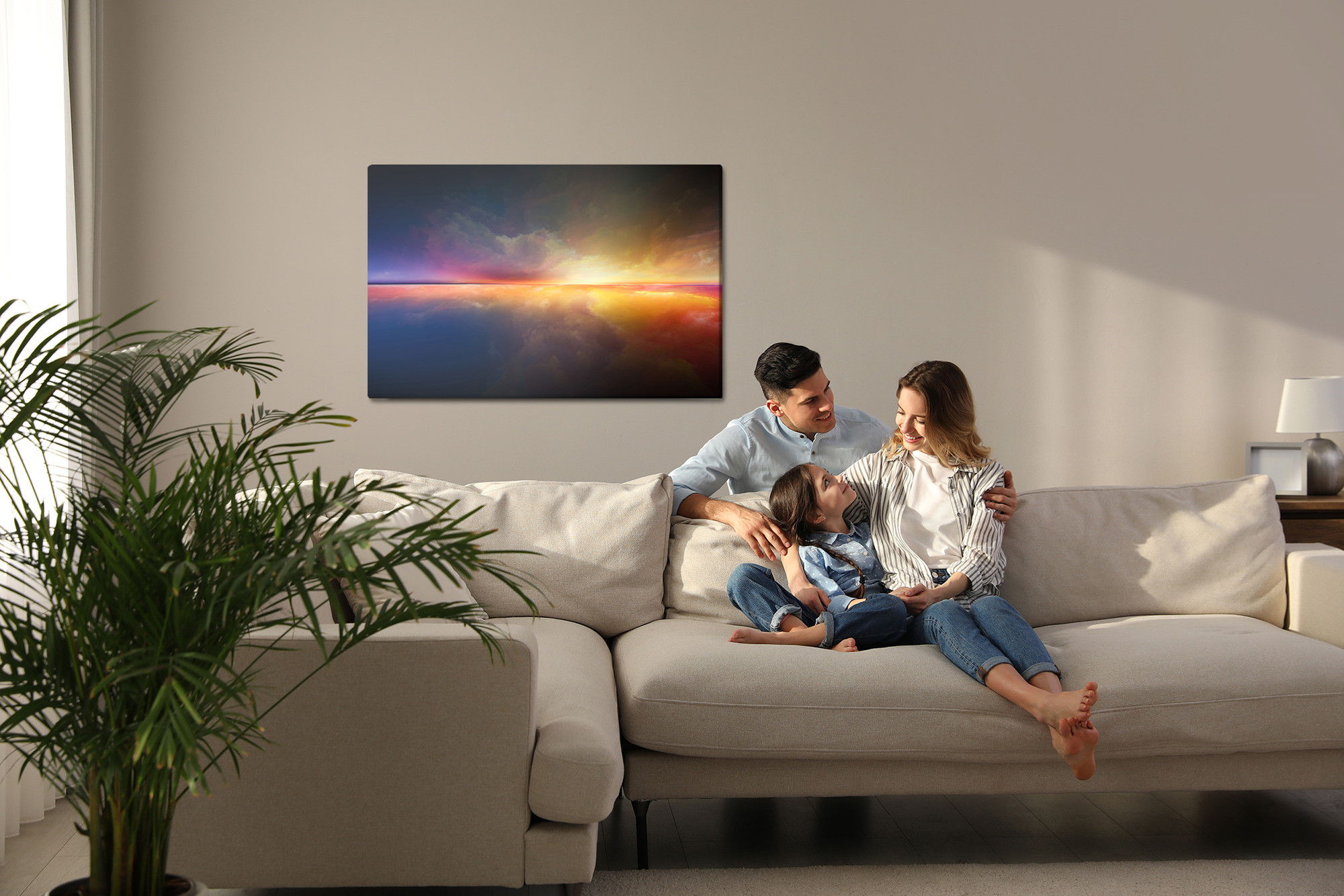 Varje tavla monteras på en massiv fururam. Format upp till 70×50 cm har en ram på 15 mm, medan format från 90×60 cm och uppåt har en ram på 20 mm. Den exakta dukspänningen gör att tavlan håller sin form över tid. Motivet The abstract horizon trycks runt hela ramen vilket ger ett stilrent galleriuttryck där tavlan är lika vacker från sidan som framifrån. Kombinationen av rak dukspänning, rena linjer och korrekt tryck ger en professionell finish.